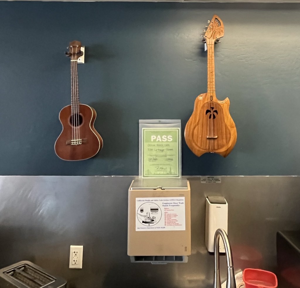 Arrivés à l’extrémité civilisée de la plage, on dégotte un bon petit restau, dans lequel les bancs, certaines tables et même un ukulélé ont été sculptés par le propriétaire. C’est toujours mieux que de servir des verres de blanc sur le comptoir à 10 heures…