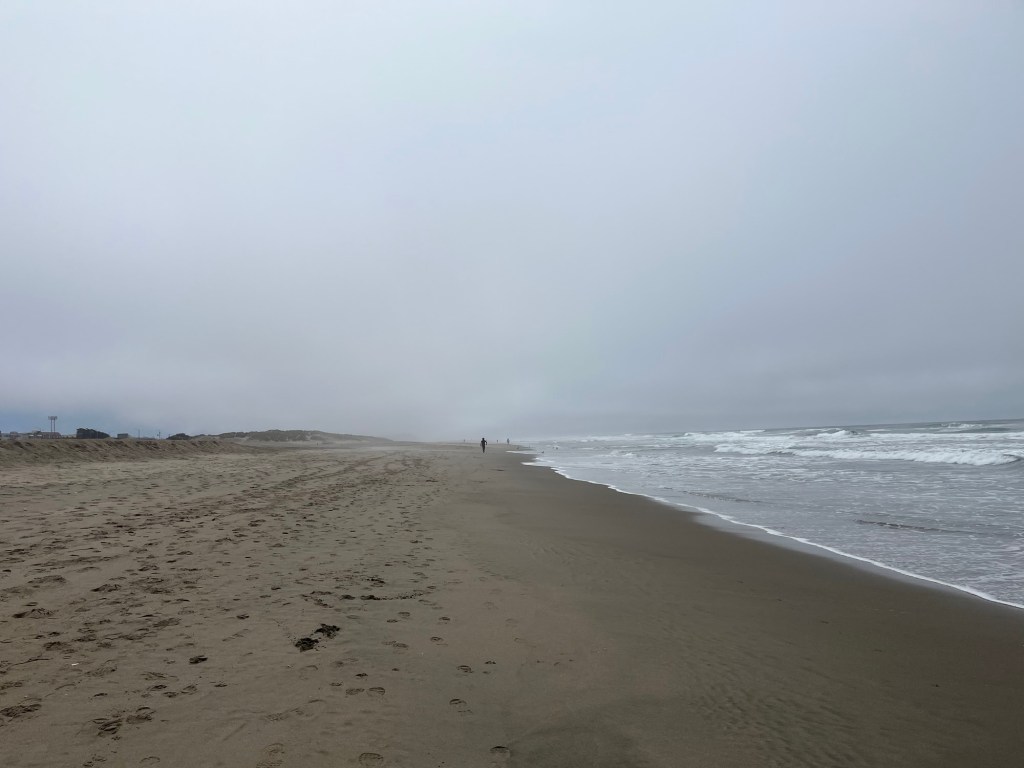 Le tram nous dépose au Pacifique. Je ne connais pas de terminus plus classe. Il y a quelque chose de fantasmatique et de lointain dans ce nom, Océan Pacifique. Alors quand on le touche avec un orteil timide plutôt qu’avec son doigt assuré sur une carte du monde, on se sent grandi. Et surtout frigorifié . Nous foulons le sable de cette plage dont on ne voit pas la fin. Le moins qu’on puisse dire, c’est que cet océan porte mal son nom, la puissance des vagues et l’eau glacée nous remplissent d’énergie. Mais le ciel reste désespérément gris ici, alors que le sable est relativement chaud.
