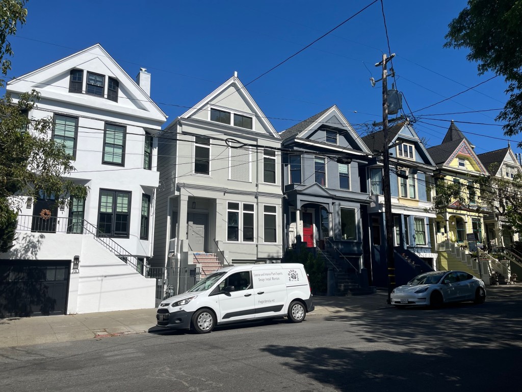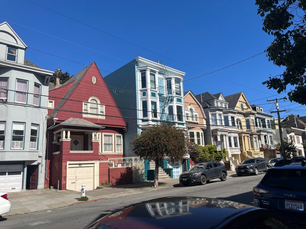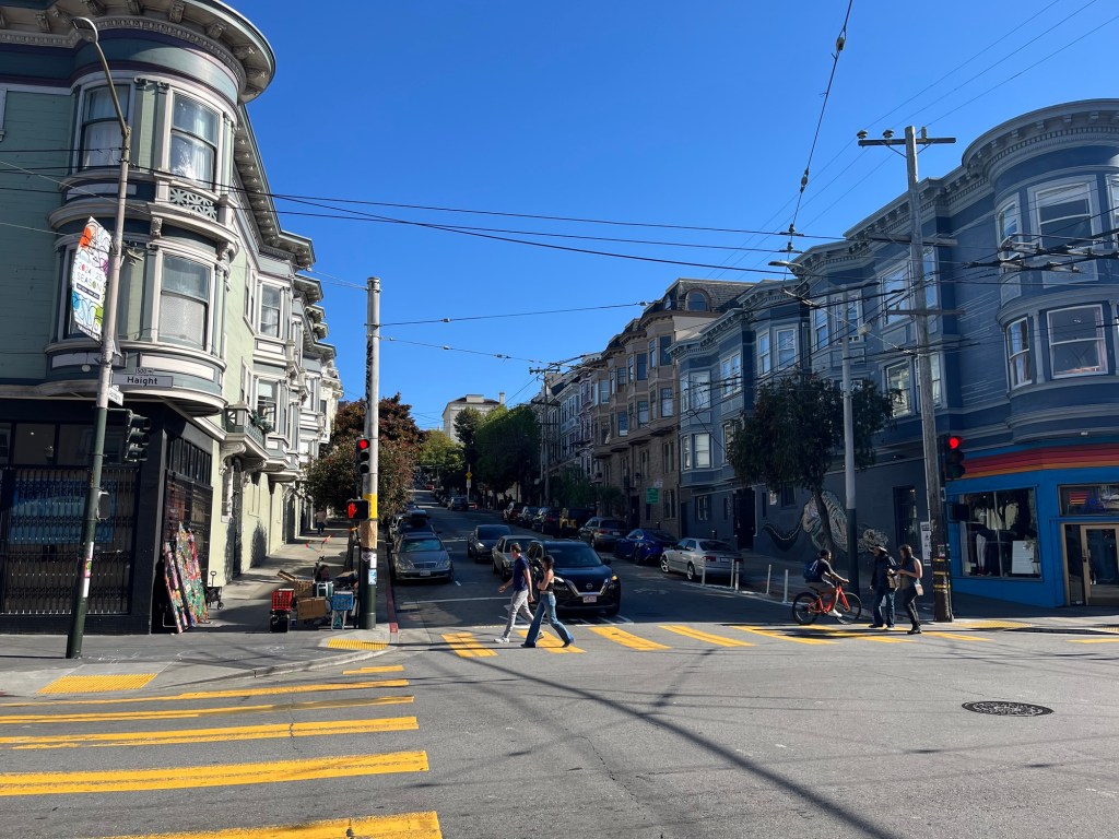 Haight Ashbury. C’est le quartier hippie où le flower power a démarré. Aujourd’hui, il reste quelques fripperies, des cafés et des attrapes-touristes. Les hippies d’aujourd’hui ressemblent plus à des punks à chiens de Rennes qu’à des artistes en pattes d’eph, portant chemise en soie et bague en émeraude. Les maisons (bleues adossées à la colline on y vient à pied ceux qui vivent là ont jeté la clef) ont elles gardé leur charme fou, et j’imagine sans peine un guitariste surdoué arpenter ces rues à la fin des années 60.