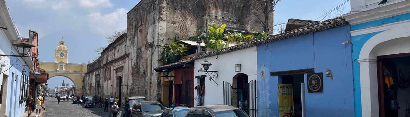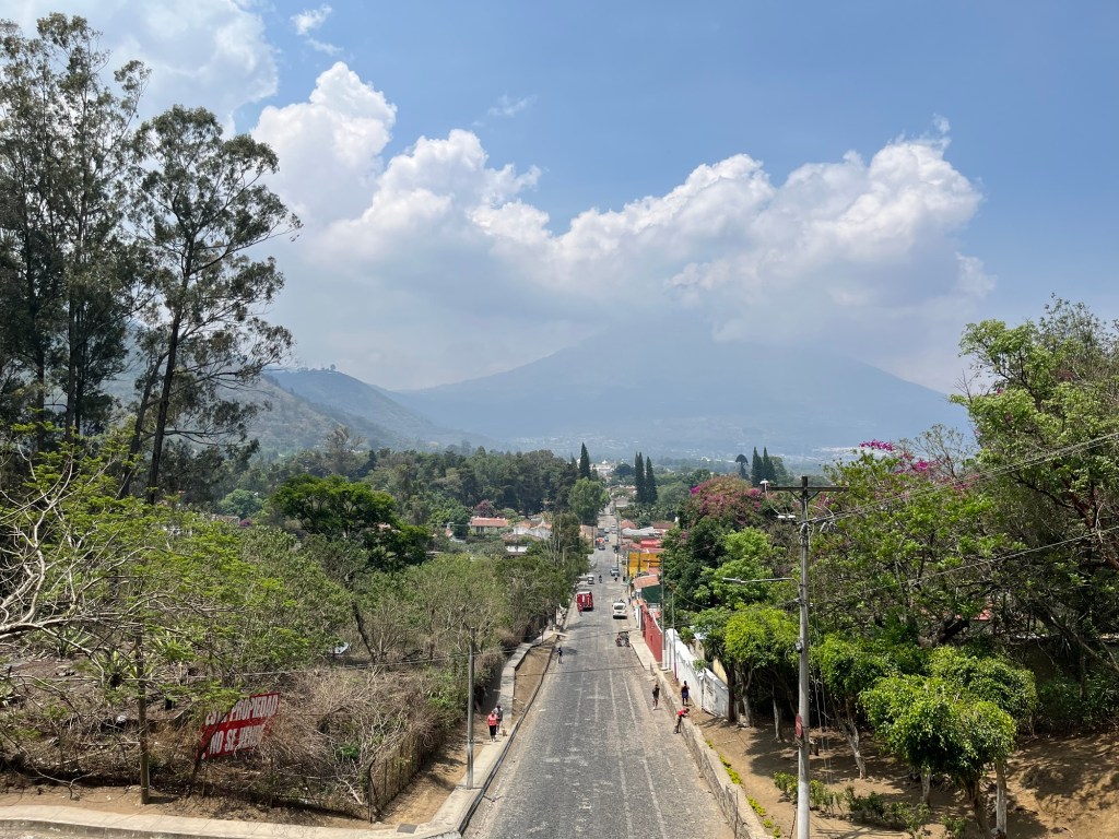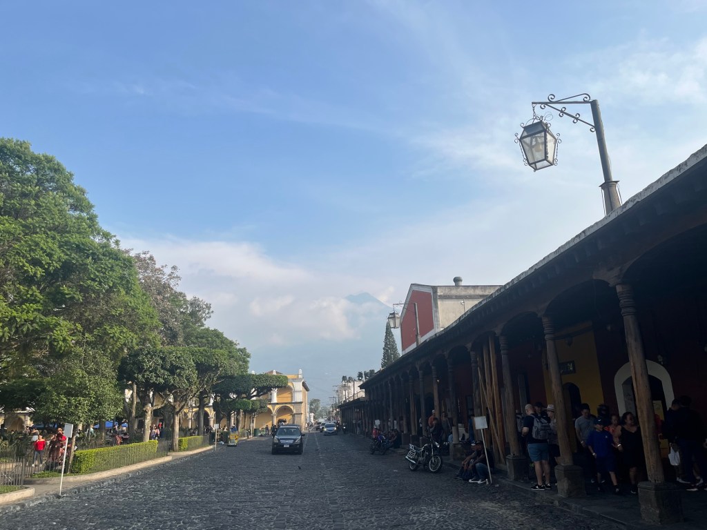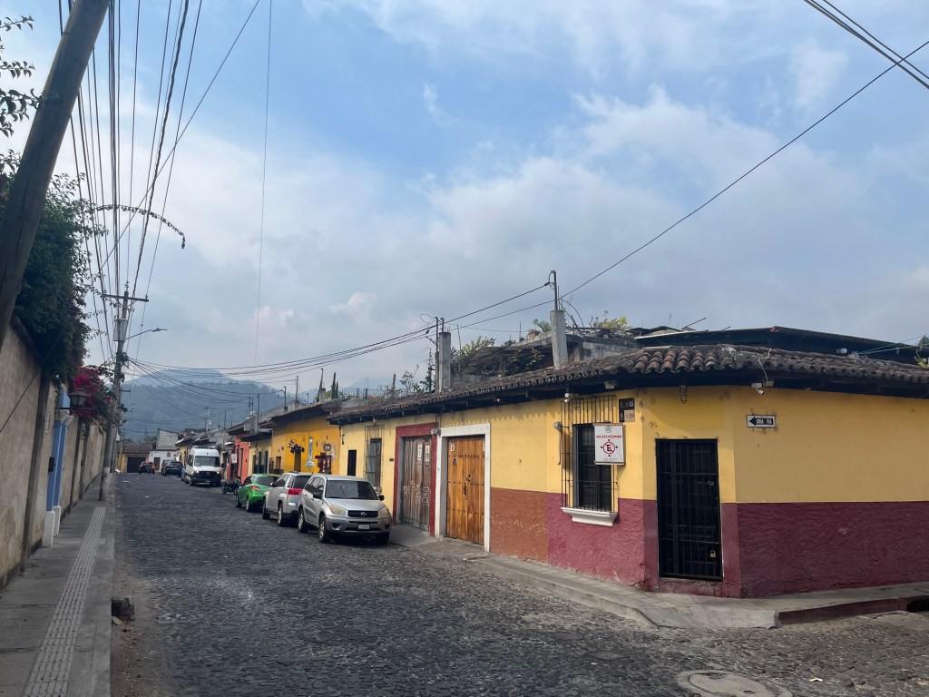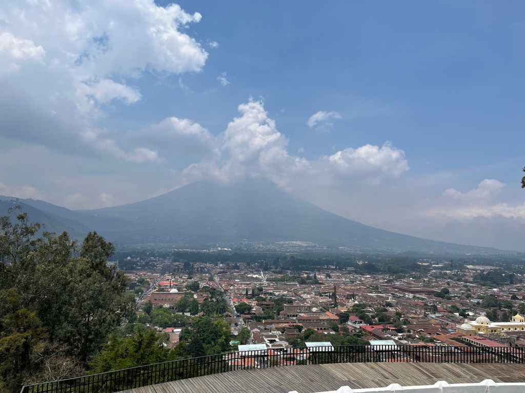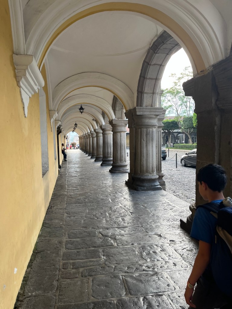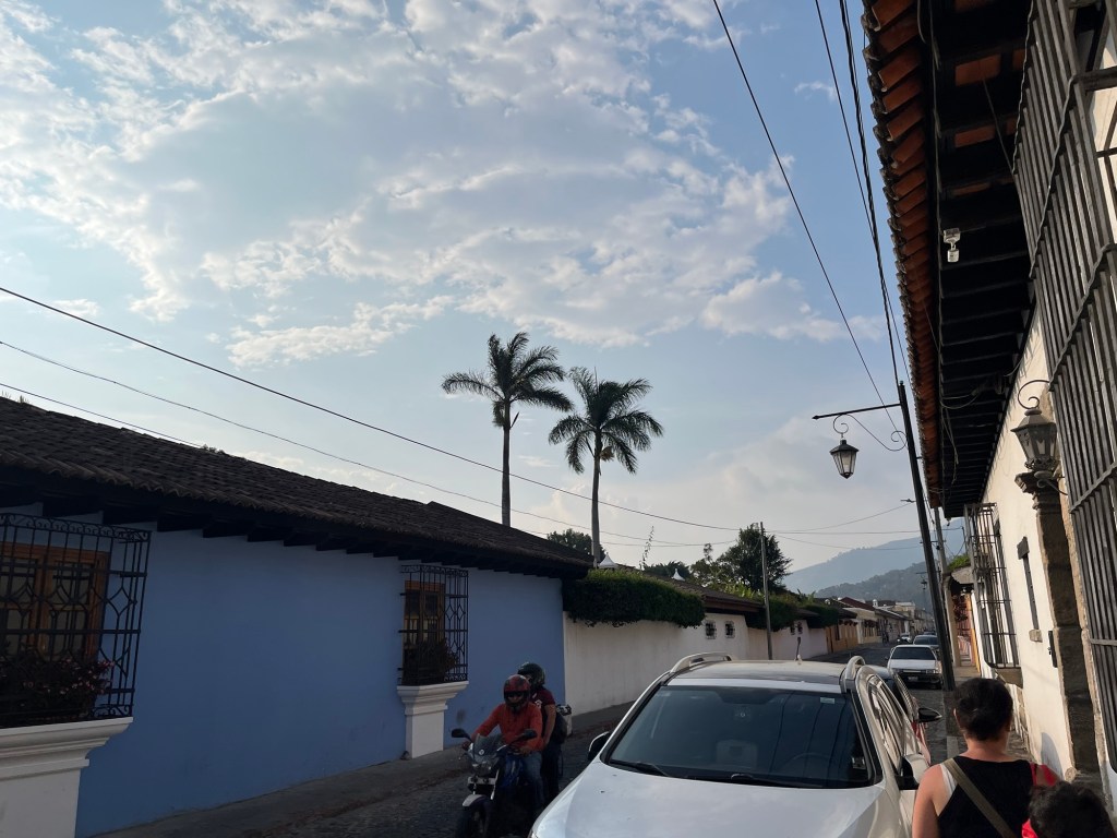 Après une nuit d’un sommeil réparateur, j’écris quelques lignes avant d’entamer notre 1e journée à Antigua. Il fait relativement beau malgré une légère brume qui flotte sur la ville, empêchant de voir les volcans qui l’entourent. On ne les verra d’ailleurs jamais car la saison des pluies approche. Tout nous semble tout de même beaucoup plus avenant que l’arrivée de la veille.
