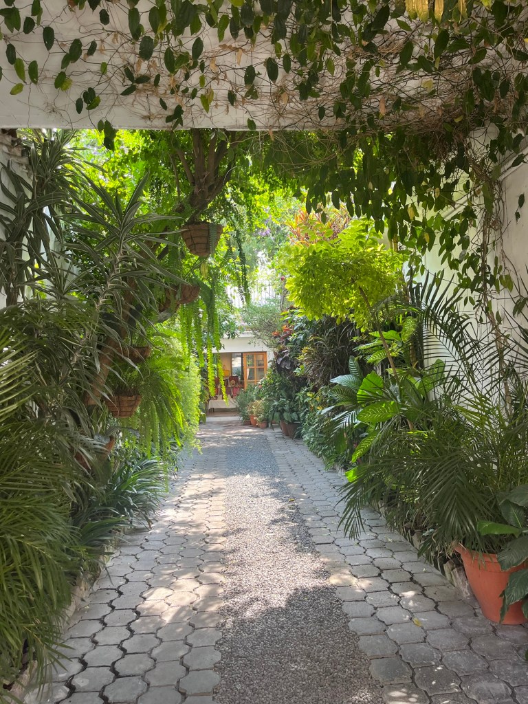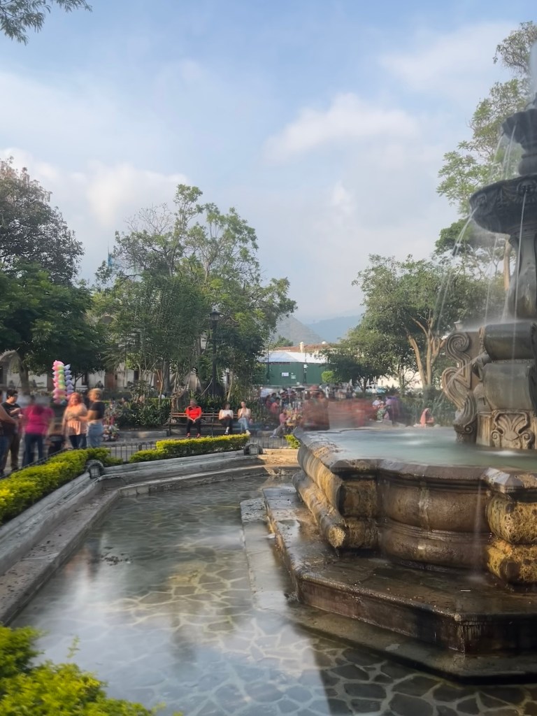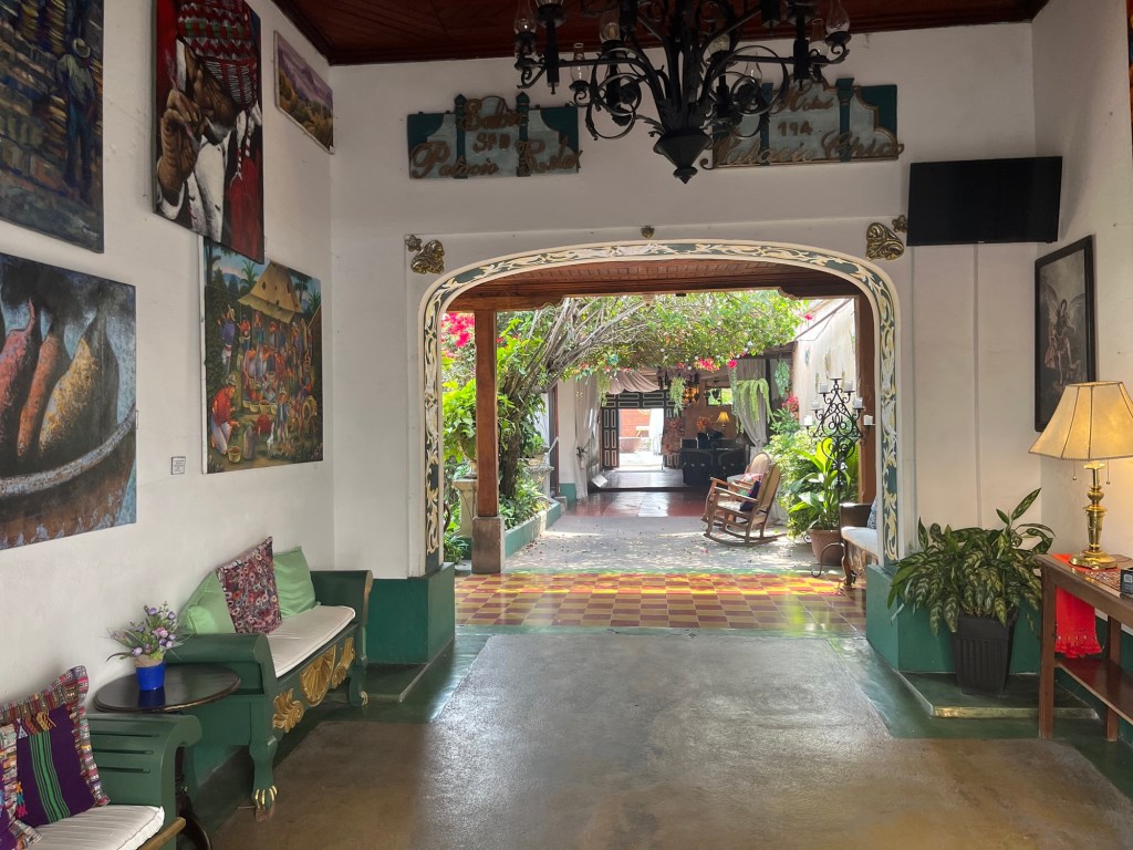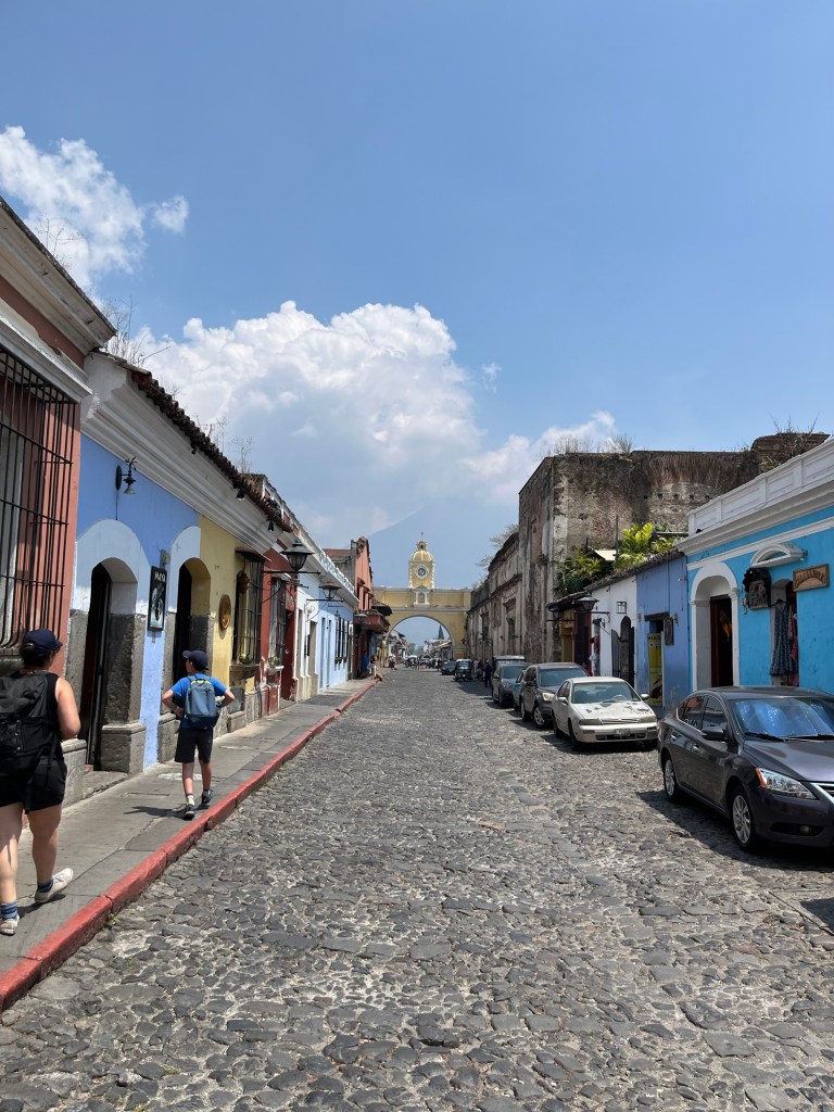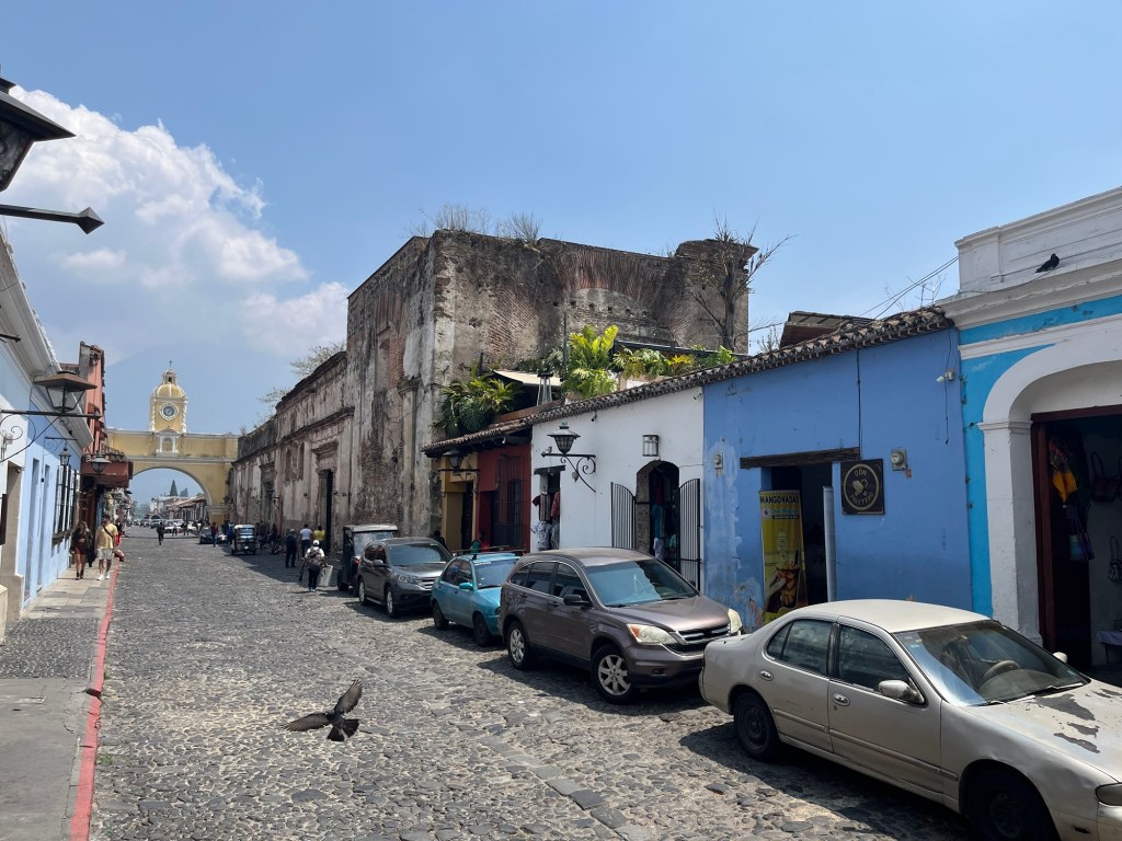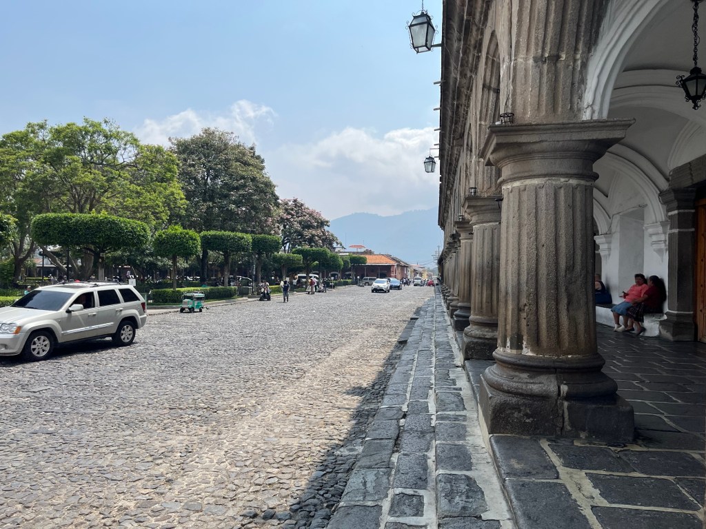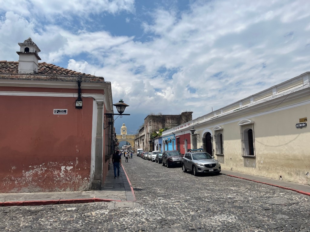 Après une nuit d’un sommeil réparateur, j’écris quelques lignes avant d’entamer notre 1e journée à Antigua. Il fait relativement beau malgré une légère brume qui flotte sur la ville, empêchant de voir les volcans qui l’entourent. On ne les verra d’ailleurs jamais car la saison des pluies approche. Tout nous semble tout de même beaucoup plus avenant que l’arrivée de la veille.