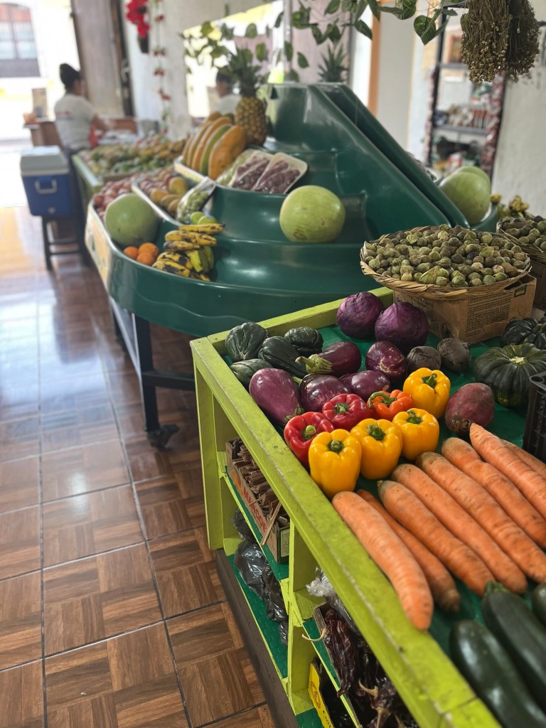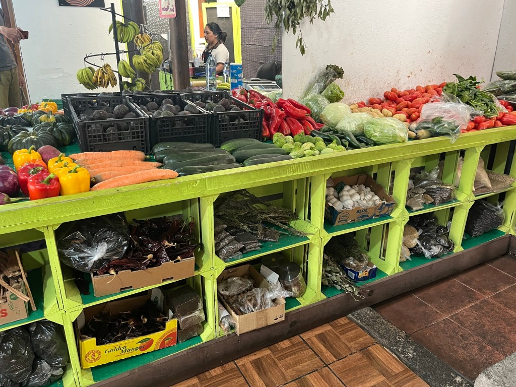 Je pars explorer le quartier pendant que la petite famille termine sa nuit. C’est un plaisir d’aller découvrir l’épicerie de la rue, on y trouve de beaux produits locaux, avocats, papaye, épices, tomates, et les arepas préparés à l’entrée de la tienda …