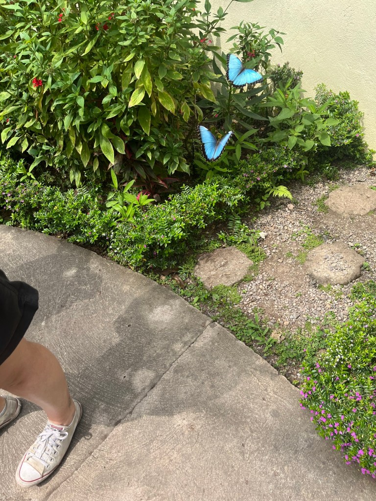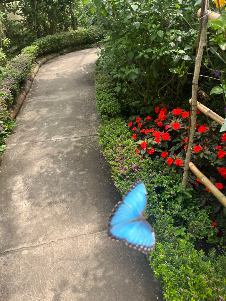 Nous sommes déposés devant l’entrée du parc. Le plan affiché peut laisser croire qu’il y a pléthore de randonnées à faire donc on attaque. On n’a toujours pas de chapeau ni de lasso, mais on ne peut pas s’empêcher de chanter Indiana Jones a tue tête lorsqu’on traverse les nombreux ponts suspendus. On ne peut pas courir, ca tangue, donc on regarde alternativement le paysage et sous ses pieds. C’est bien parfois de marcher lentement. La forêt tropicale, les cascades inattendues, la chaleur humide, les paillons bleus, tout le monde est d’accord pour dire que la rando est exceptionnelle!