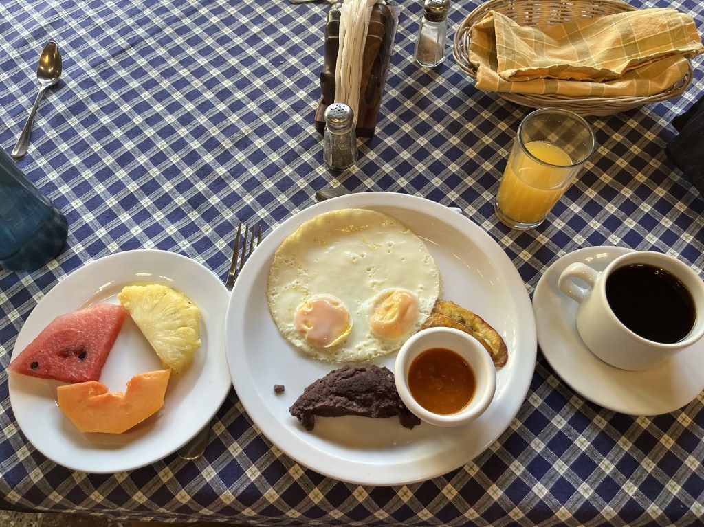 Il y a trois hôtels à l’entrée du site, on a pris celui avec piscine pour faire plaisir aux enfants. La joie dans leurs yeux à la surprise de voir une piscine vaut tout l’ot des Incas. L’hôtel est comme on dirait dans son jus. De papaye. Avec paille. Où que j’aille (S. Gainsbourg). Il n’y a pas eu de réfaction depuis 1960 et ça fait un peu vieille pension familiale, certes tenue avec soin. On ne serait pas surpris de voir débarquer Tintin et le capitaine Haddock. Contre toute attente, le réceptionniste parle un anglais parfait. Oublier pour le reste de l’équipe, mais le sourire et la sérénité ambiante compensent sans problème. On déjeune à la carte, dans un petit livret plastifié qui date sans doute de la création de l’hôtel, sinon des pyramides. Le délicieux petit déjeuner maya avec plantain et frijoles est accompagné de fruits très frais, de jus d’orange tout aussi frais et de bon café. What else ?