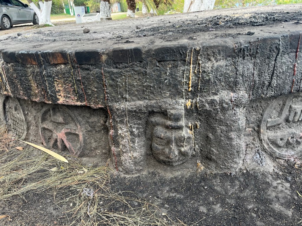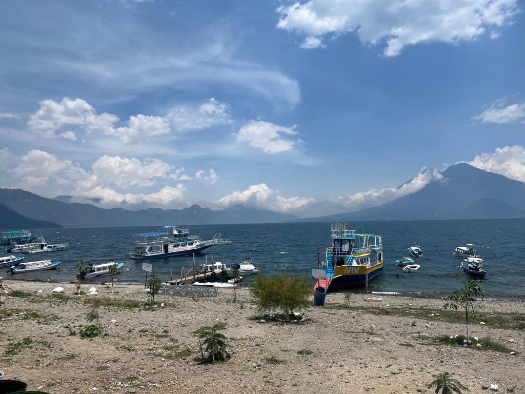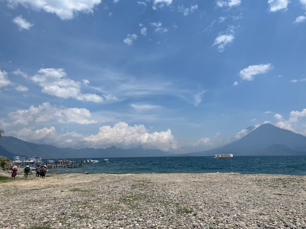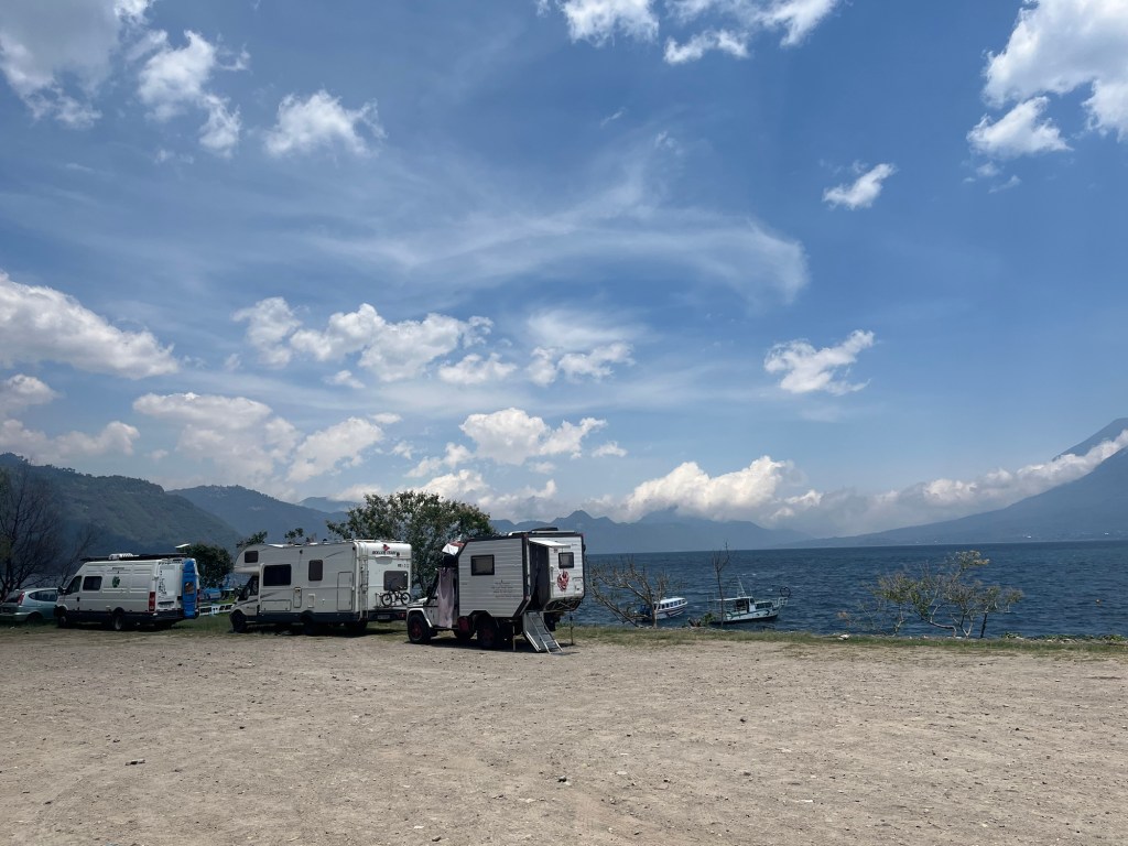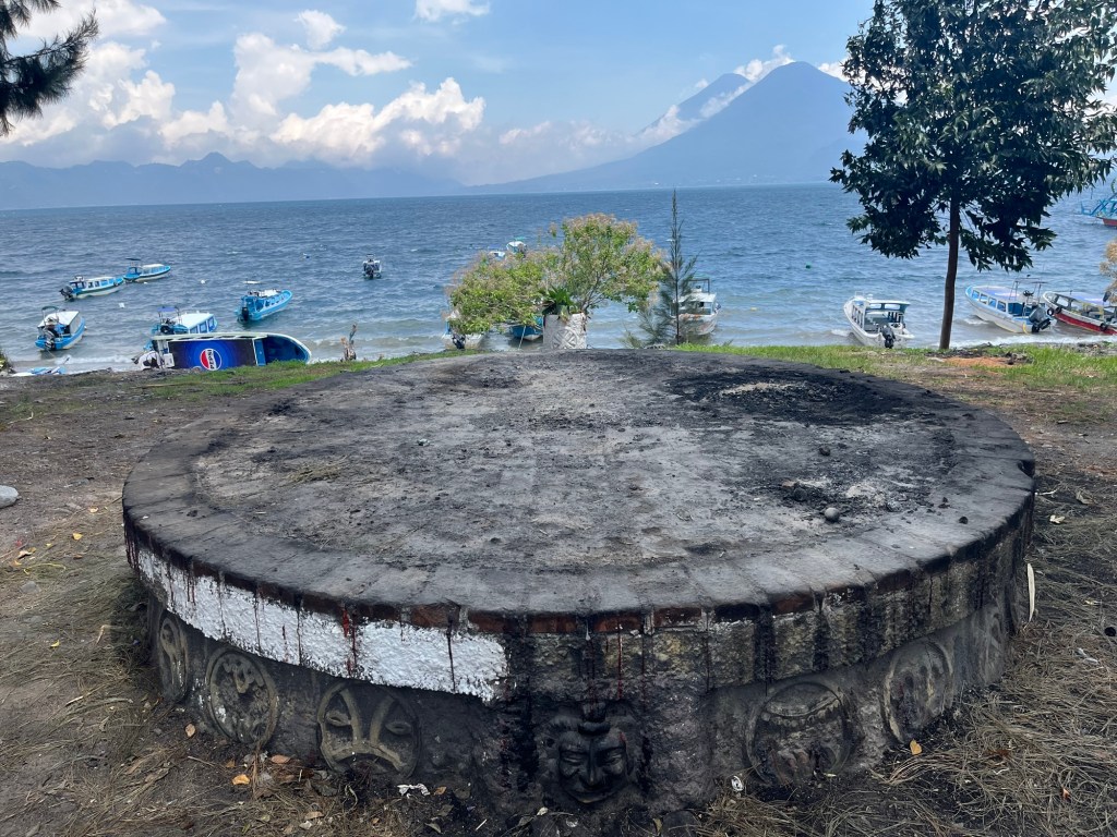 On fait une dernière balade le long du lac. Les bateaux ondulent devant la berge, en attendant la prochaine saison touristique. Quelques baroudeurs se sont installés, entre le terrain de basket et le lac, à l’écart des échoppes à touristes. De très grandes pierres plates et cylindriques d’environ 3 m. de diamètre, gravées, sont posées face au lac. Utilisées lors de rites Maya. Intrigué, je me tiens devant les cendres. J’aurais aimé assister à une cérémonie …