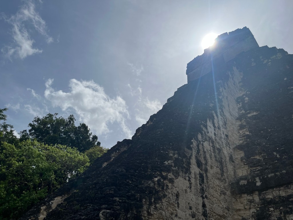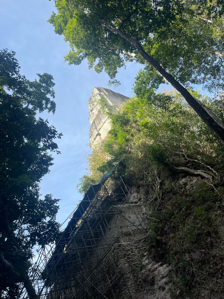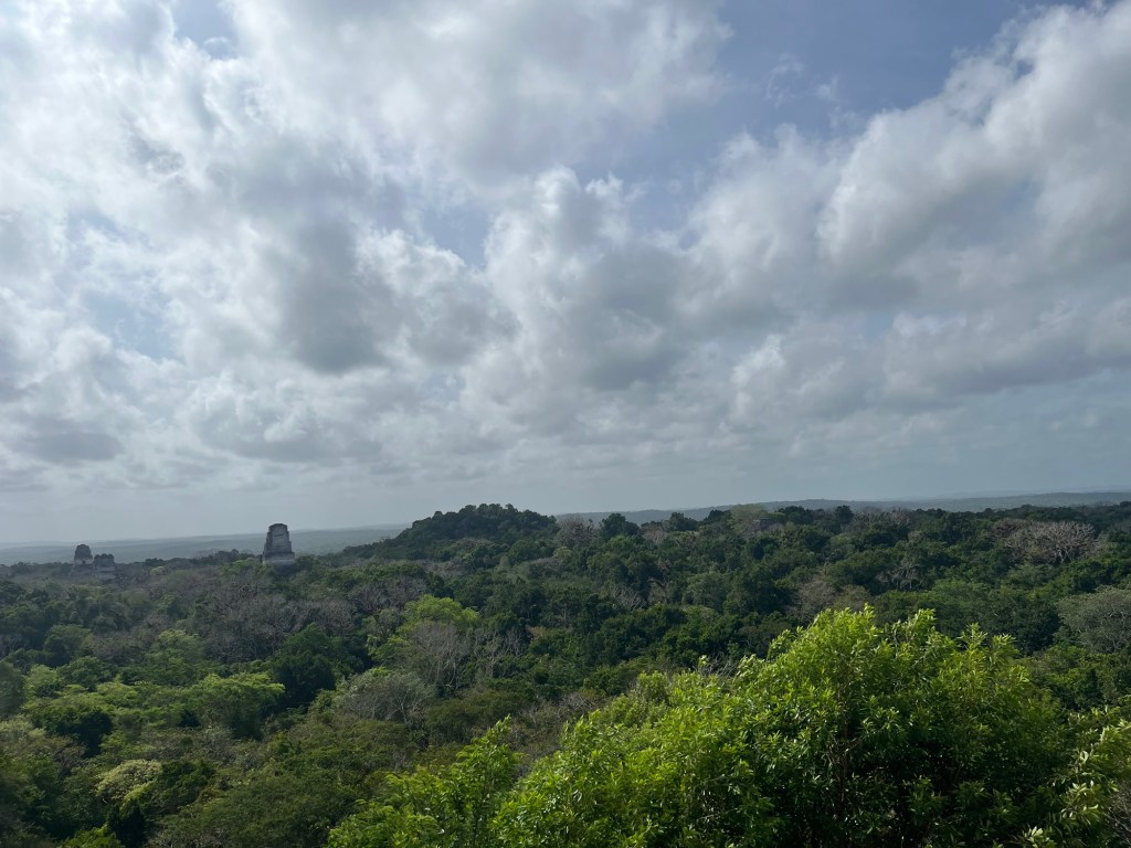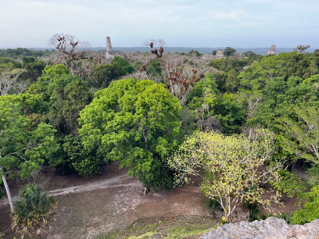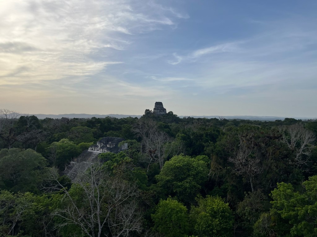 Entre le déjeuner et la piscine, les kids n’ont pas l’énergie pour anglais, rédaction et géométrie. On s’y colle quand même. Et puis je retourne avec A sur le site archéologique, où l’on découvre encore de nouvelles parties de la cité qui semblent encore plus belles que ce qu’on avait vu le matin. On croise pas mal de singes à cette heure-ci, la température est déjà plus fraîche et les touristes déjà repartis prendre leur goûter. Ce site est grandiose. Monumental. On termine par l’ascension au pas de course du plus haut temple précolombien, haut de 70m! l’équivalent d’un immeuble d’une vingtaine d’étages. On domine largement la cime des arbres, et l’on peut voir la jungle à perte de vue. Seuls émergent les autres temples. Divin.