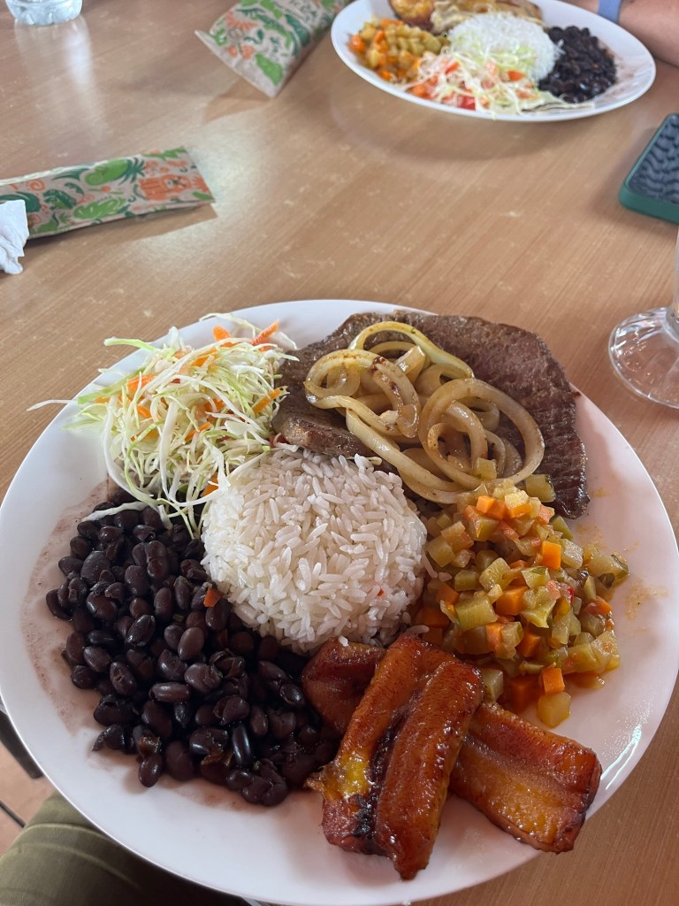 C’est pas désagréable de pouvoir rouler en famille, atteindre toutes les destinations, en s’arrêtant où on veut, sans la contrainte des horaires de bus, en choisissant nos chansons… ainsi on déjeune dans un petit village de montagne qui rappelle la Savoie. Ils ont remplacé le kir par un jus de papaye délicieux. Très belle assiette, empanada à tomber, service très aimable et prix assez dérisoire.