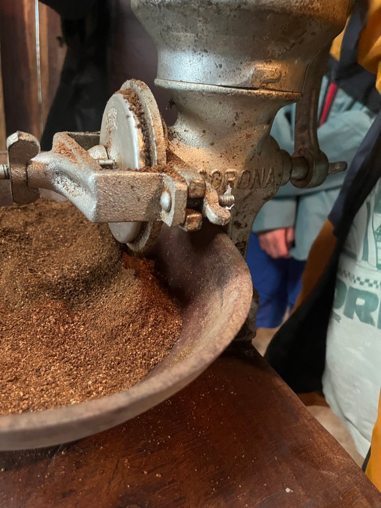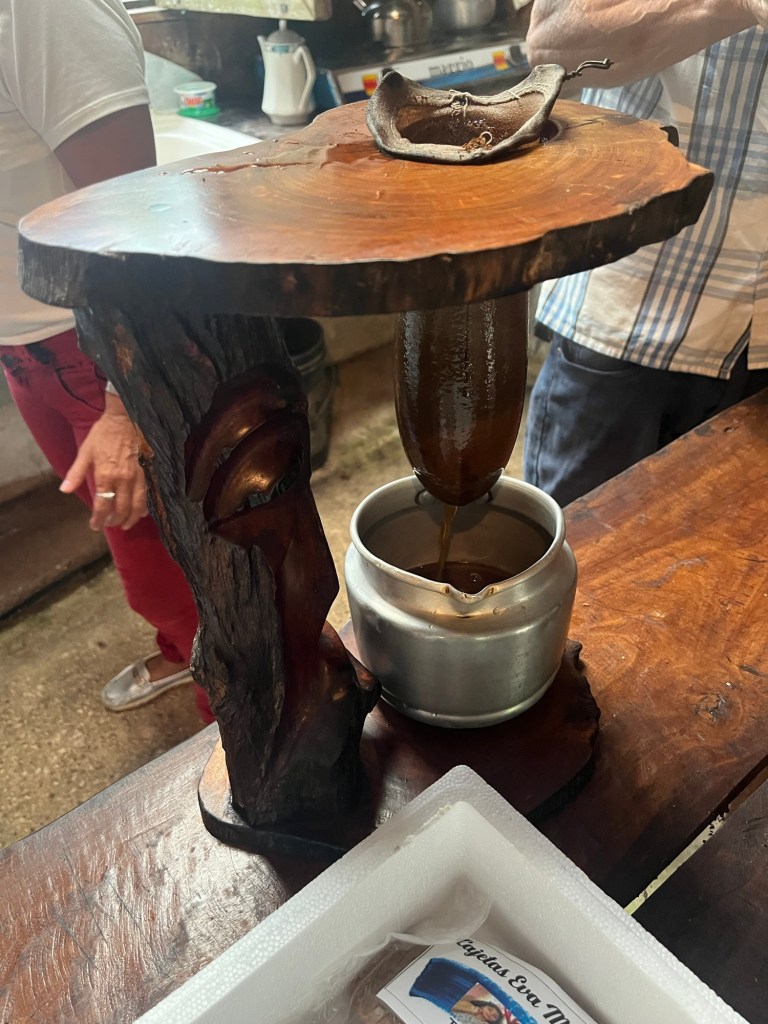 Le festin terminé, on retourne jusqu’à cette plantation. Elle est tenue par une petite famille soudée et passionnée. Deux petites tables rondes taillées dans un large tronc sont dressées au milieu d’une cabane embaumée, une cuisine sommaire est installée dans le coin, juste là pour vous préparer le café. Quelques articles autour du café et du chocolat, produits par la famille, sont également proposés. Ca semble authentique, bien loin d’une machine à touristes, même si j’adorerais aller à Hawaii. On est accueilli par Christian, marcel noir, jean crados et bottes de pêcheur pleines de boue et sans motif hawaïen, qui nous propose de démarrer par un café le temps que la pluie se calme. L’oncle nous fait sentir les grains torréfiés de la veille, c’est l’odeur de l’autre or noir. Sourire béat. Les enfants s’occupent de moudre au moulin en se marrant, et c’est Maria, la tante, qui place le café fraîchement moulu dans sa belle cafetière traditionnelle en bois gravé, équipée d’un filtre en panse de paresseux, qui rappelle étrangement un moyen de contraception masculin. En tout cas ça y ressemblait, mais comme on tenait à goûter le café, on a préféré ne rien demander.