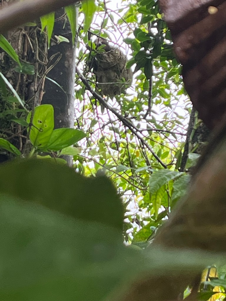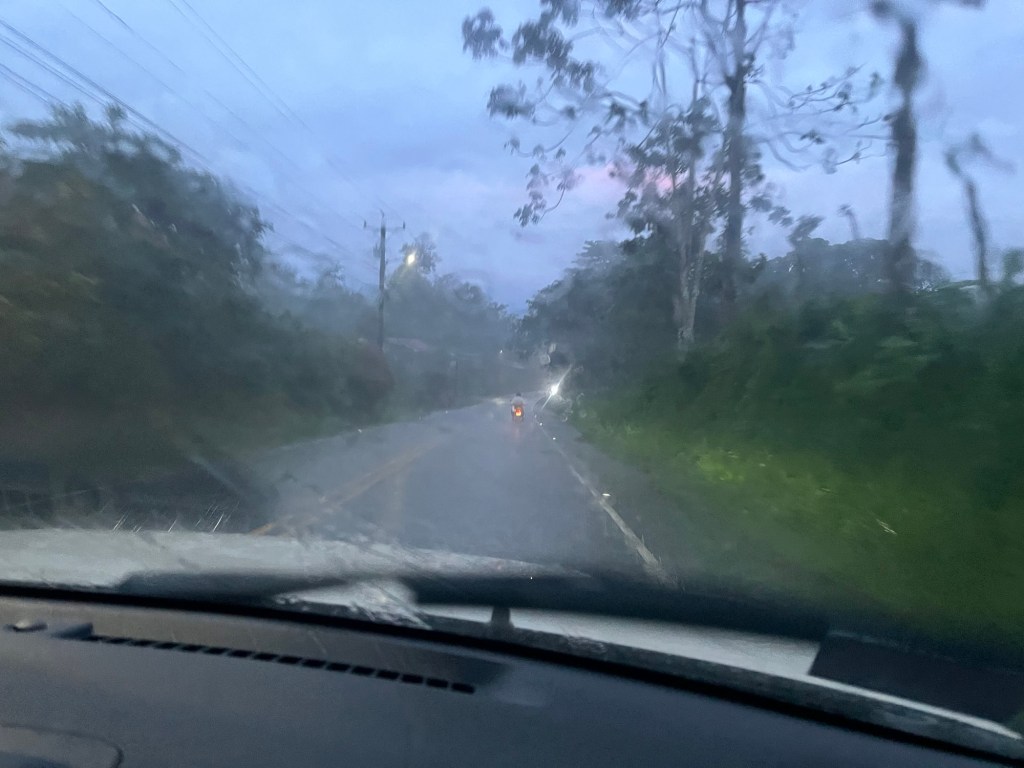 Malgré le temps maussade, on tente d’aller « alimenter » le Rio Celeste. On a une bonne heure de route qui alterne éclaircies et averses sévères. On entre dans la saison des pluies. Quand on arrive au parking, on voit un type en chemise hawaïenne en qui, instinctivement, on a une confiance limitée, peut-être à cause des pizzas hawaïennes? Il se tient au milieu de la route, dans une posture qui se veut militaire, et qui veut dire « on ne passe pas » (je rappelle qu’il a une chemise hawaïenne quand même). Il nous informe que le site est fermé depuis hier, suite à un glissement de terrain. Il nous propose à la place d’aller voir des paresseux dans son jardin ou de manger des glaces sur son parking pour la modique somme de 25 $ par personne. On lui dit qu’on adore sa chemise et l’opportunisme dont il fait preuve, mais on va finalement rouler un peu plus. On passe devant une multitude de panneaux publicitaires pour promouvoir la rencontre avec les paresseux, des cascades, du VTT dans la boue, des plantations de café avec dégustation et j’en passe. Ça peut être sympa si c’est moins de 14$ la tasse. Mais il se met à pleuvoir réellement des cordes tropicales. On a la cascade sur la voiture, sans avoir de sortir de billet. On arrête la voiture à l’entrée d’un chemin, en espérant que ce ne soit pas payant, et on déballe les sandwiches qu’on devait manger les pieds dans le Rio, spectateur les pieds au sec des trombes qui tombent sur le capot. On ne s’entend juste pas parler. Un cadre différent, mais on se régale tout autant. Une expérience. On se dit qu’on va peut-être rajouter un panneau sur le bord de la route et enfiler une chemise hawaïenne pour tenter d’appâter les touristes déçus.. avec un peu de marketing, ça financera la rando de la veille.