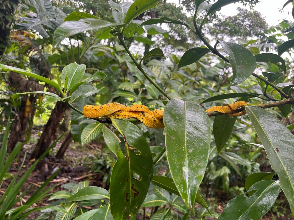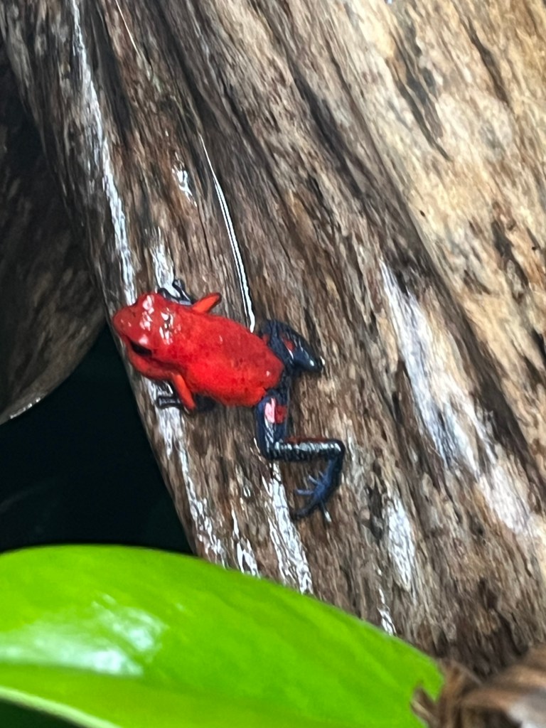On fait ensuite la connaissance des locataires du propriétaire, à commencer par le paresseux, petite boule de poils immobile, indétectable par les non initiés, qui ne descend de son arbre qu’une fois par jour pour effectuer ses besoins. Une vie trépidante en somme, qu’il est interdit de bousculer, sous peine de prison, même s’ils se sont installés sur votre propriété. On rencontre ensuite une minuscule et adorable grenouille rouge toute mignonne qu’on a envie de prendre sur sa paume, qui se cachait sous les feuilles, mais dont le simple toucher peut vous rendre malade. On évite donc de la caresser même si T en rêve. On termine par le serpent, au regard immobile et glaçant, qu’on préfère voir rester tranquille sur sa branche. Pas d’antidote simple à sa morsure, juste filer à l’hôpital en urgence.