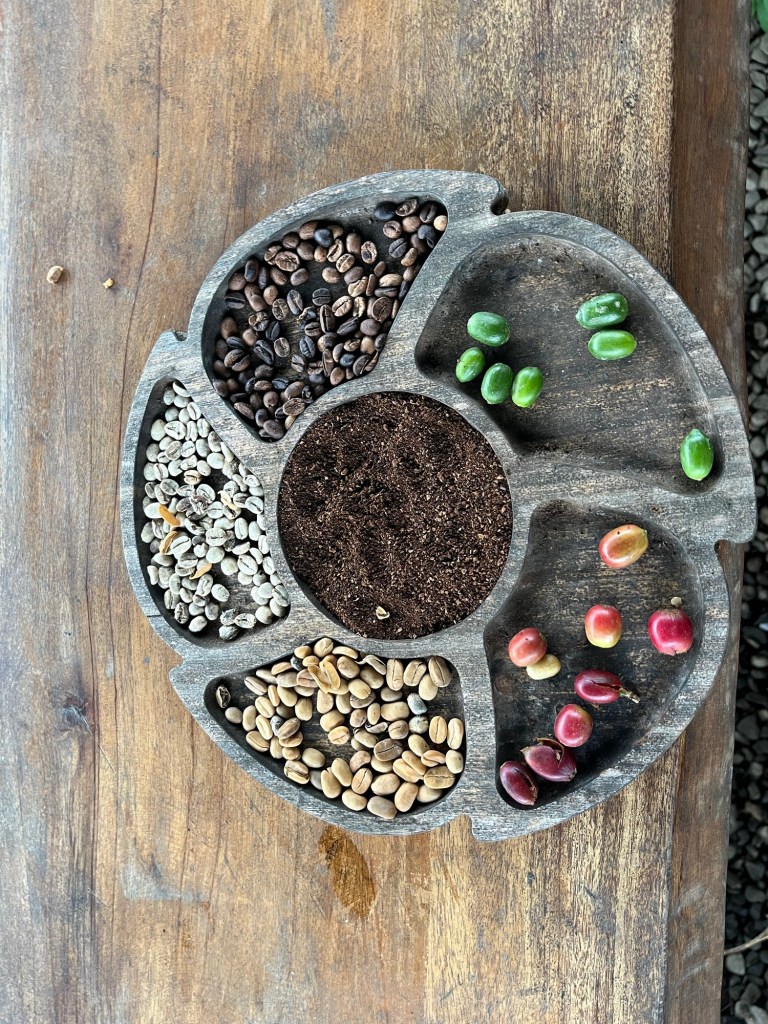 Entre-temps, la pluie s’est arrêtée, et on peut commencer la visite de la plantation. Christian partage avec nous plein de détails sur les caféiers, leurs récoltes etc. il nous fait goûter un fruit – d’aspect comme de goût, ça ressemble un peu à une cerise, très légèrement acidulée, avec 2 ou 3 gros noyaux. Pepep ! Avant de les cracher avec mépris et sans classe, car c’est justement les pépins qu’on doit garder! Celui qui a inventé le café est un génie du recyclage! Aujourd’hui, le café génère 200 milliards de dollars de revenus par an. Pas que pour Christian.