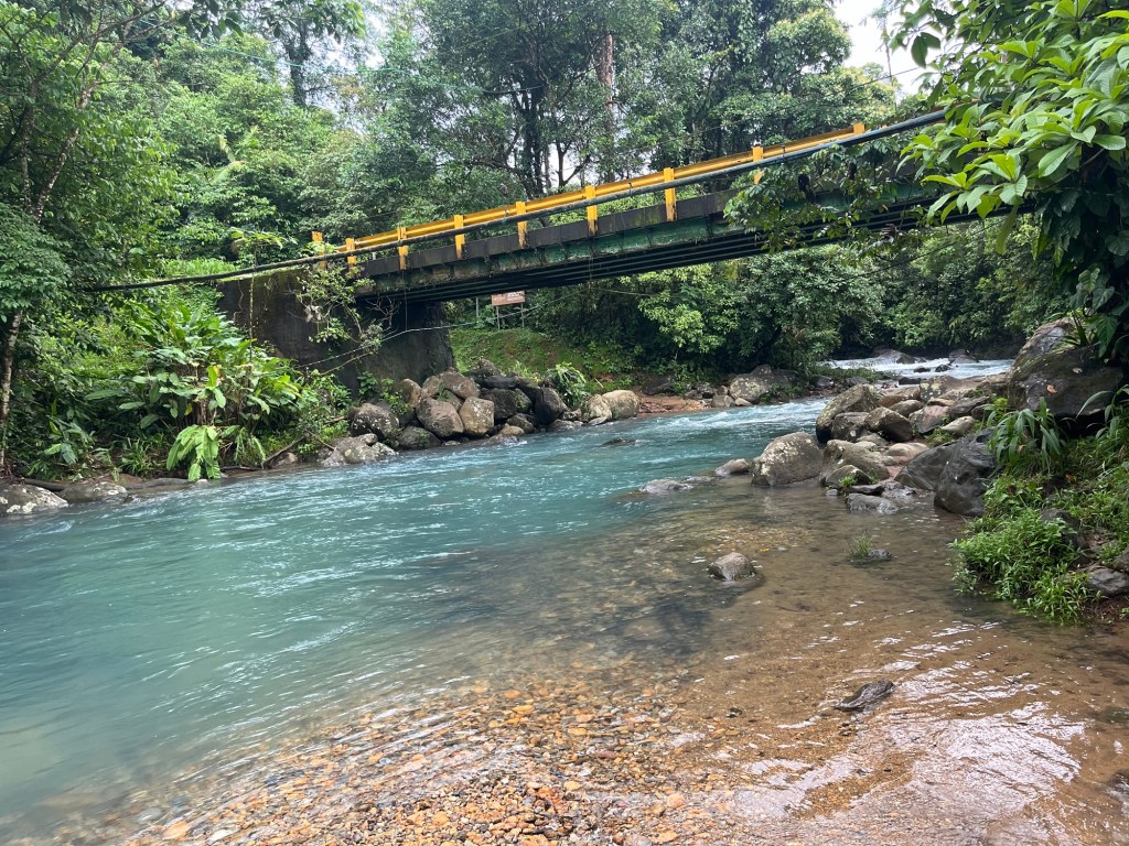 On rentre chez nous, heureux de cette visite improvisée, mais tellement enrichissante! On repasse au-dessus de la rivière bleue. Bonne nouvelle, la pluie a fait fuire les racketteurs et on peut désormais aller faire trempette sans même avoir à contracter un prêt sur 12 ans! I love Costa Rica! Malgré le ciel gris, la rivière est d’un bleu métallique presqu’artificiel. Magique!