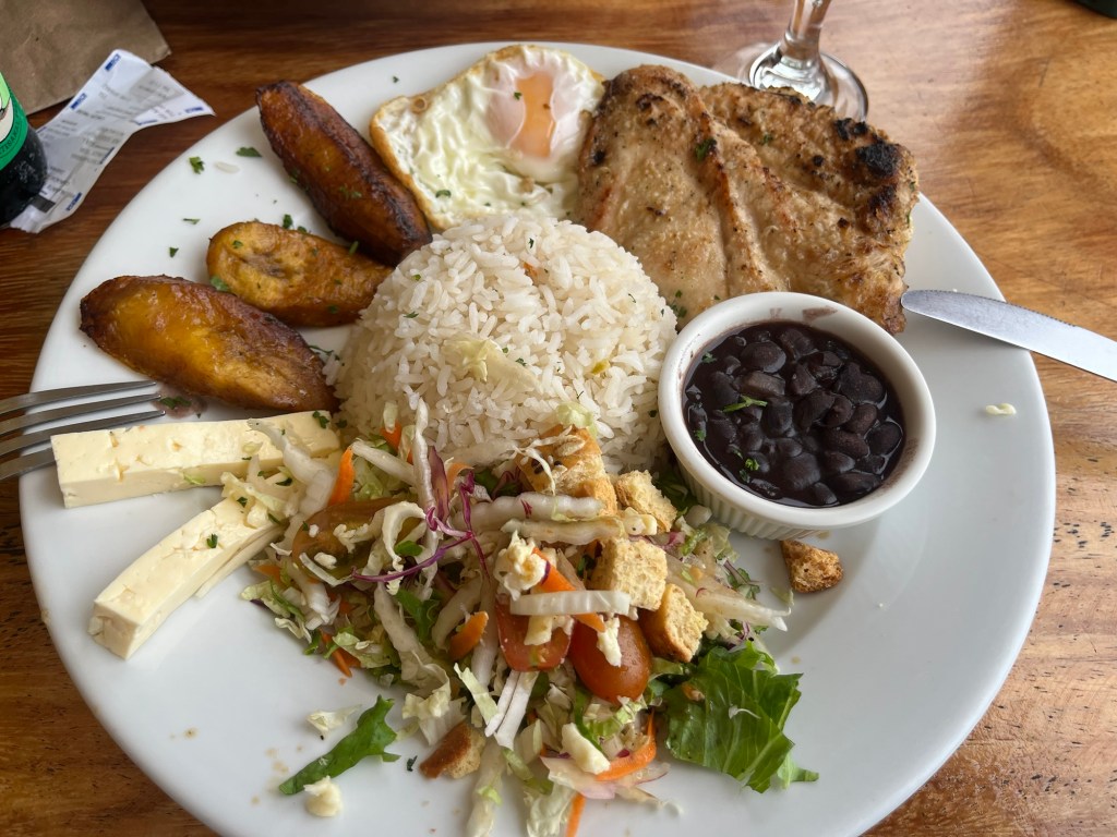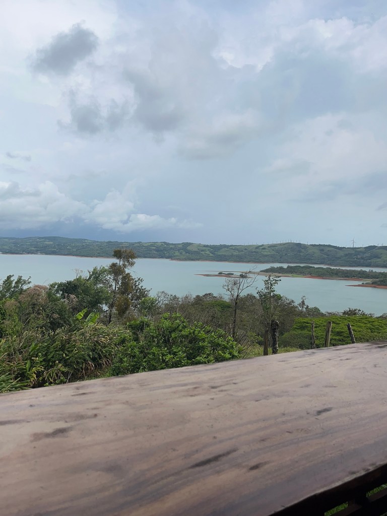 On quitte la plaine d’Arenal pour les collines vertes de Monteverde. A vol de colibri, c’est 1 mn 15 mais bon.. on est un peu chargé et la route fait le tour du lac Arenal. Et on n’est pas des colibris. Avec un pause pour avaler un Casado en chemin, avec vue sur le lac, cela nous prendra environ 4 heures.