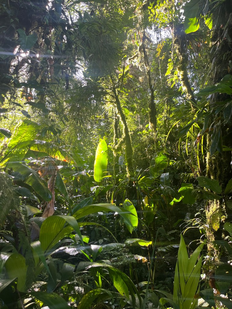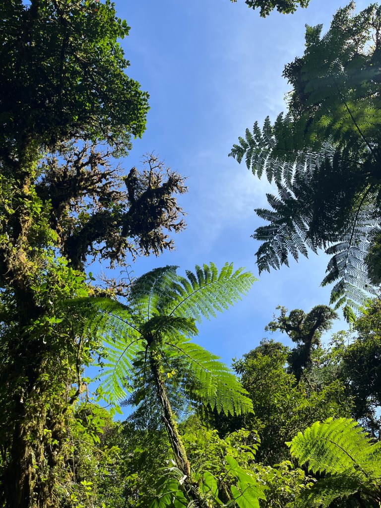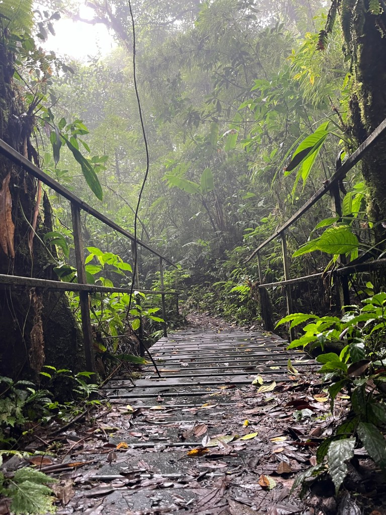 Les touristes viennent ici pour les forêts de nuages, un type de forêt tropicale qui nage dans un brouillard quasi permanent. Je sais, ça ne fait pas rêver, du coup, des activités plus attrayantes sont proposées pour faire venir les touristes Américains. C’est le Costa Rica, donc quand le petit chauve en veston gris de la compta, dans son bureau riquiqui du sous-sol regarde sur sa calculatrice le budget que de telles activités engendreraient …. Il montre le chiffre affiché sur la calculatrice en regardant de ses yeux ronds la belle sportive un peu rêveuse du 7e étage dans les yeux, d’abord sans rien dire. Puis de répondre qu’il va falloir trouver une activité alternative. Bye la tyrolienne et les ponts Instagram, on va faire une randonnée !