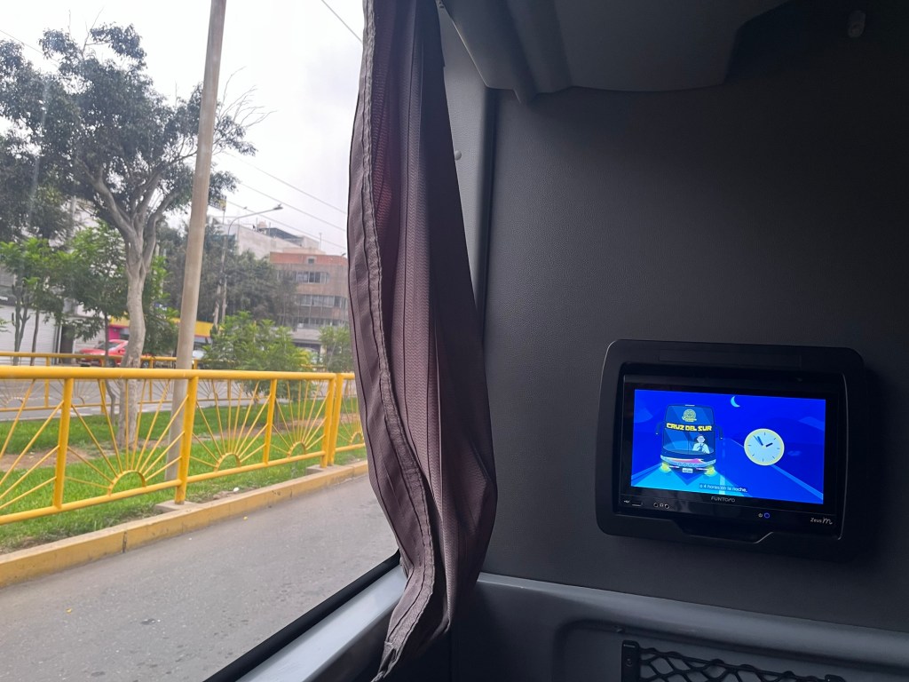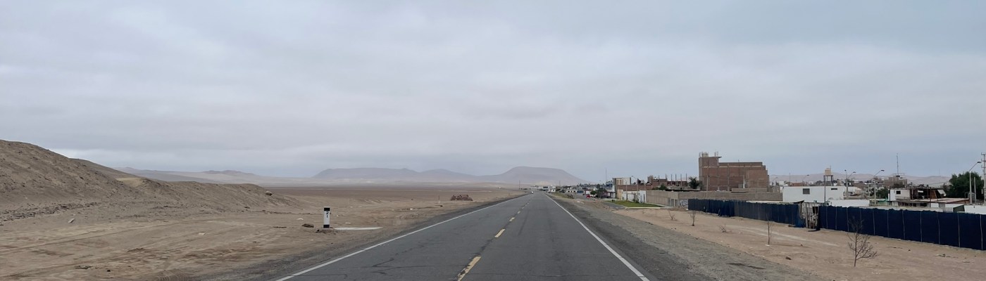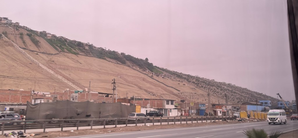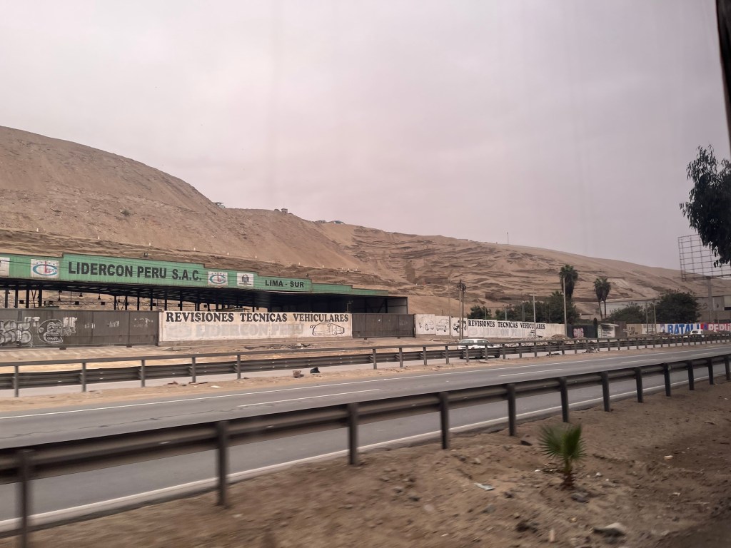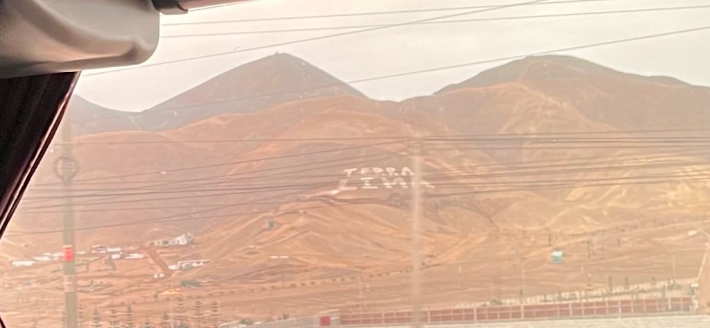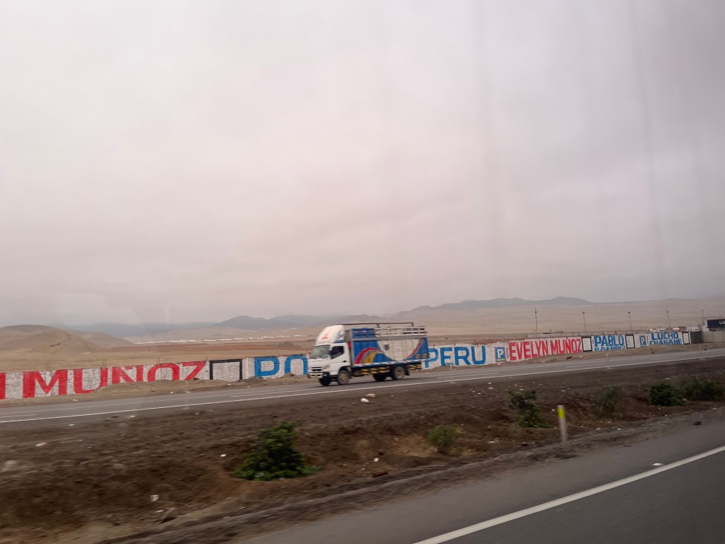 On arrive à la gare routière, flambant neuve, personnel courtois et en uniforme, une bulle. Le bus est ultra-confort, avec de larges sièges inclinables, repose-pied … et écran. Les enfants veulent rester dans le bus jusqu’à fin août. Malgré l’éternel grisaille, après être enfin sorti de Lima l’interminable, une des plus grande ville construite dans le désert après Le Caire. Et ouais. La route partage le paysage en deux : sur votre gauche Mesdames et Messieurs, des usines grises, puis de hautes dunes marron. On se demande comment certaines maisons s’accrochent à une pente de sable si raide. A droite, des favelas, puis l’océan, gris jusqu’à l’infini. La campagne électorale pour 2026 a déjà démarré; ici, pas d’affiche, mais des noms de candidats peints sur les murs. Plus compliqué à arracher qu’une affiche du RN ou de LFI ….