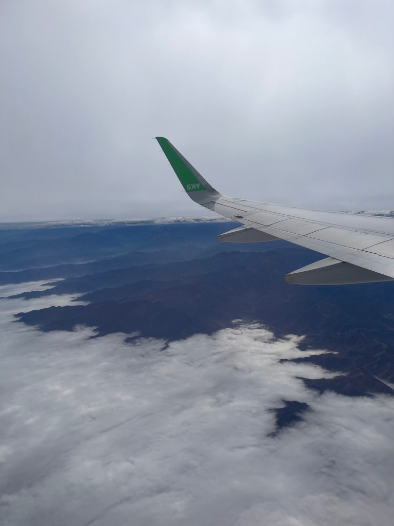 Le vol est court, on se retrouve assez vite au-dessus des nuages, d’où émergent les premiers sommets des Andes. C’est tout simplement magique à voir. La barrière de nuages reste bloquée côté océan, nous laissant admirer la cordillère des sommets jusqu’au fond des vallées.