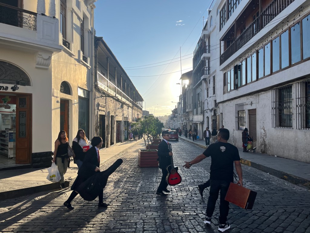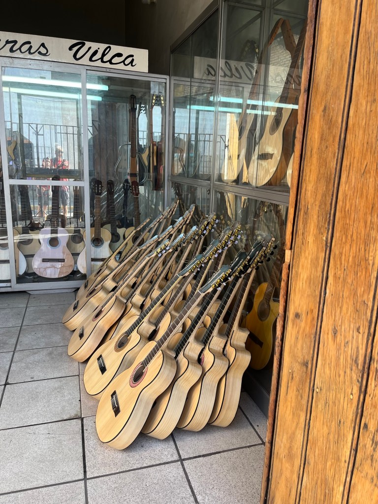 On a une quinzaine de minutes de marche pour arriver au centre, on passe par une rue qui compte pas moins d’une vingtaine de magasins de musique, qui vendent principalement des guitares acoustiques, mais aussi quelques instruments andins, et les classiques pianos, violons, cuivres …. aussi inattendu que réjouissant après le jeûne musical des pays précédents. Espérons que Thomann ne passera pas par ici. On croise justement un groupe d’une trentaine de jeunes musiciens, en uniforme. À la première question posée, tous se ruent vers nous pour échanger et nous serrer la main avec de grands sourires. J’adore déjà cette ville.