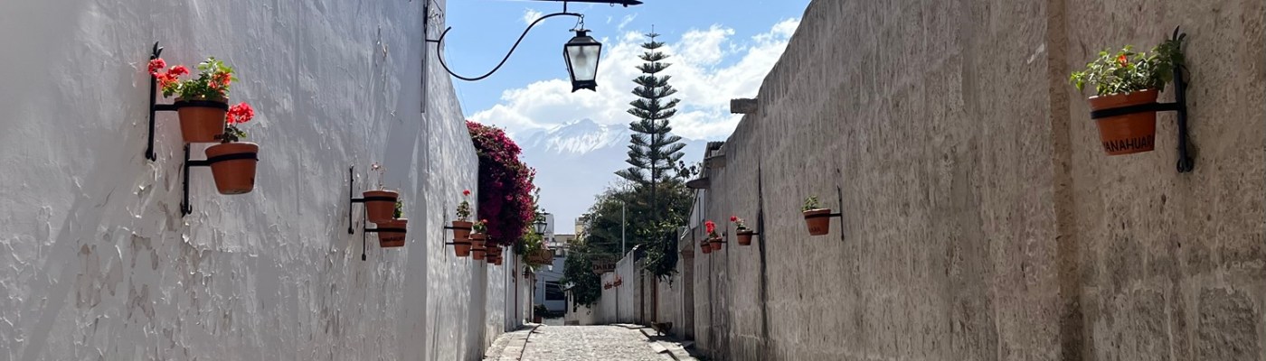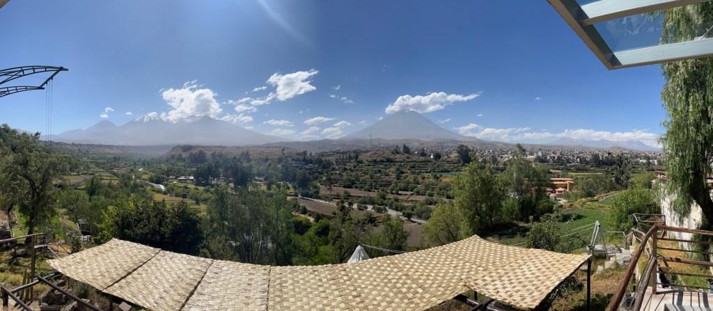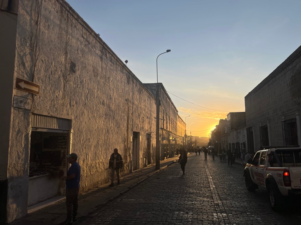 Pour s’acclimater à l’altitude, on monte quelques minutes en direction d’un belvédère d’où on est censé pouvoir voir les trois volcans. Il nous en manque un – impossible de rester sur un tel échec pour la DGPC. On croise un groupe d’étudiants de Lima, qui se précipite vers nous en nous entendant parler. Ils sont animés d’une gentillesse et d’une curiosité inébranlable. Un d’entre eux a dû me serrer la main quatre fois en deux minutes de conversation comme si j’étais Bono. J’adore cette ville.