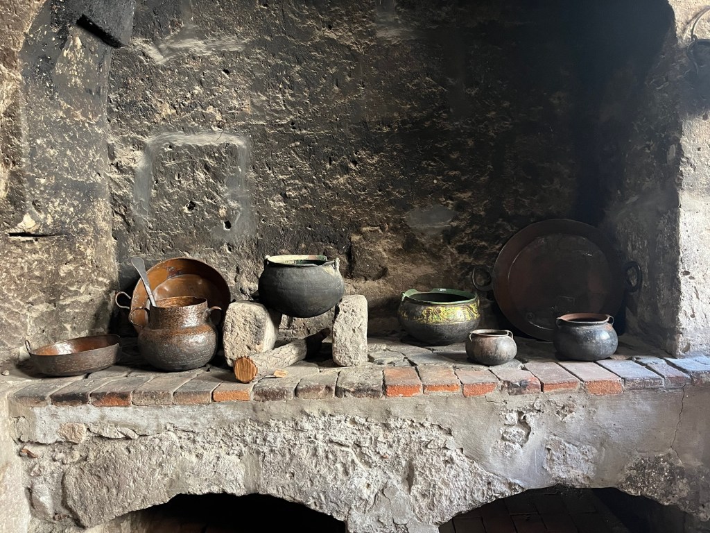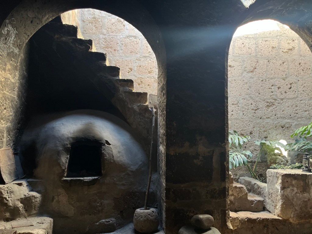 Sans y faire trop cas, on démarre la visite des chambres des nonnes. Spartiates, donnant sur le patio d’un côté, une minuscule terrasse individuelle de l’autre, et un petit four pour les soirées pizza-bière-foot du dimanche soir. Les enfants s’accordent pour préférer le couvent à Alcatraz. Claro … ceci-dit les cellules chambres se suivent et se ressemblent, la beauté du lieu tient plus à ses patios, ses murs bleus ou ocre vif, ses vues sur les montagnes environnantes que l’on aperçoit furtivement au-dessus des tuiles, ou encore son café. Son café dans un patio de plus, mais pas austère pour le coup, petit gazon, chaises de jardin en fer forgé, belles plantes, soleil rasant sur les murs. L’expresso est délicieux et la musique est une playlist de reprises version chill. On lance un blind test des familles. Pas forcément facile. Après l’afahorès, les enfants sont pénibles, je les invite donc à une séance de méditation dans cet endroit paisible qui n’invite à rien faire d’autre.