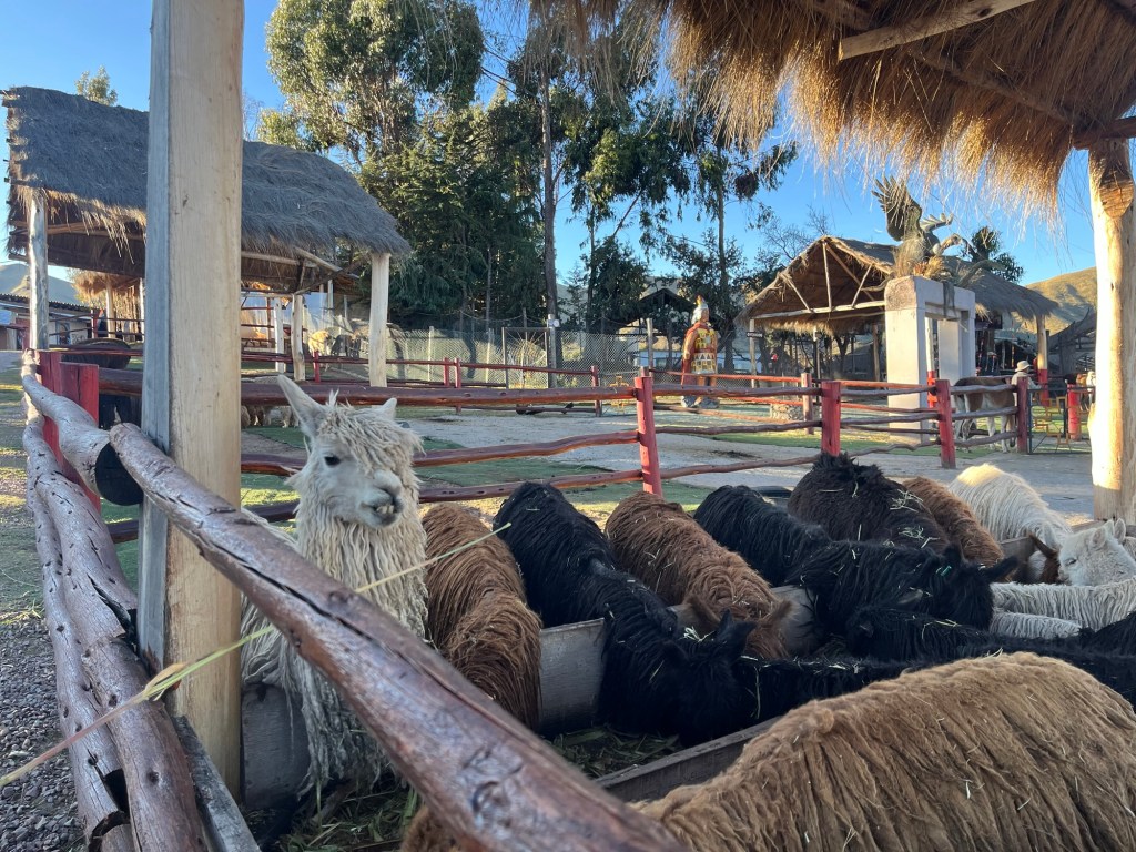 Face à la léthargie ambiante, T prend l’initiative de faire une sieste. Une proposition qui vaut une insulte pour les enfants. Pour le déjeuner, on part avec les kids au restaurant des parents de Paloma, ce qui nous permet de sortir un peu. Distance au restaurant – environ 12m porte à porte. On a à peu près la même vue que depuis notre balcon dans la vaste salle à manger, la clientèle est familiale locale, le personnel est attentionné et classe, en chemise et cravate noire. On nous offre un pisco sour et des cancha pour l’apéro, ce type de maïs aux grains allongés, servis croquant légèrement grillés. Vus l’altitude et la faim, je préfère tapisser un peu l’estomac avant de goûter mon pisco afin de ne pas embarrasser les enfants. Ils se régalent avec une soupe incas que J n’aurait pas touché avant le début du voyage. Bravo mon grand! Quant à A, il prend des soupes même pendant la canicule… J’essaye ensuite la version andine du ceviche, à base de truite. C’est un régal. On a droit à la visite du père de Paloma, patron gentil et volubile qui parle même quelques mots de français, alors que je me torturais pour finir mes phrases en espagnol devant les kids pas même vaguement impressionnés, ce malgré le pisco sour avalé. Le Brésil va donner lieu à des moments de solitude je crois …Puis viennent Paloma et sa fille V, qui nous proposent de nous emmener voir une coopérative qui exploite la laine des camélidés du coin. Bien évidemment qu’on vient !
