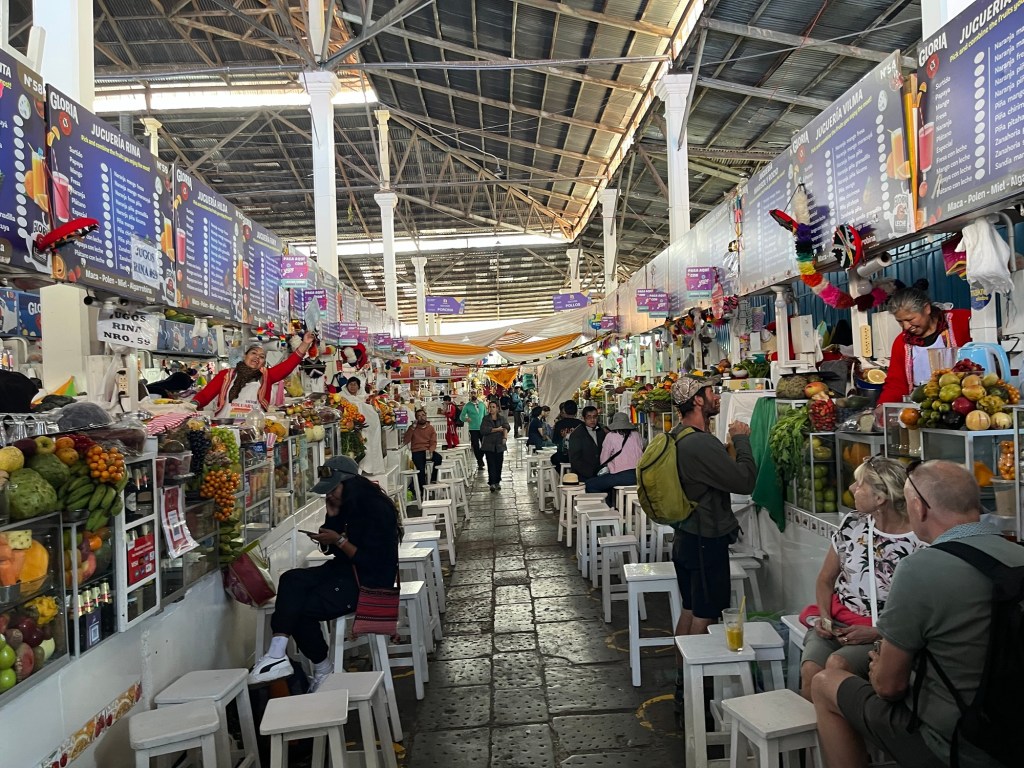 On découvre l’immense marché de San Pedro où on trouve à peu près tout, des maïs. une vingtaine de types de pommes de terre, des piments tout mignons que même la vendeuse nous conseille de ne pas goûter, et où de nombreux Cusceños déjeunent.