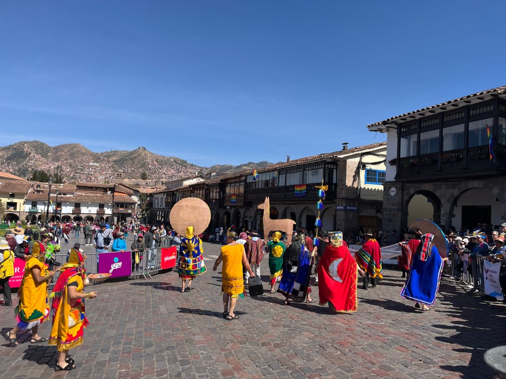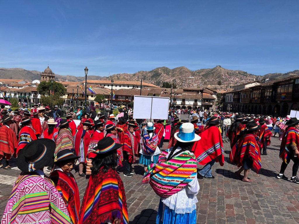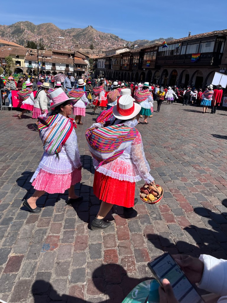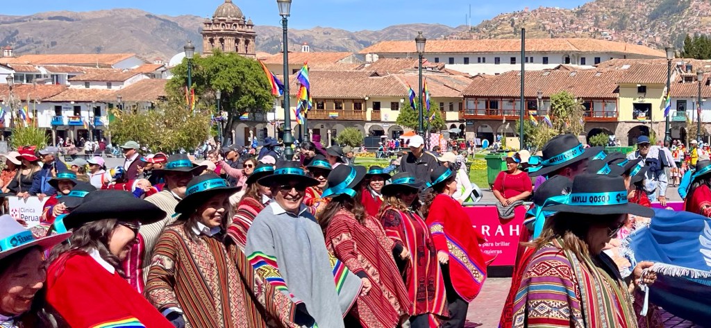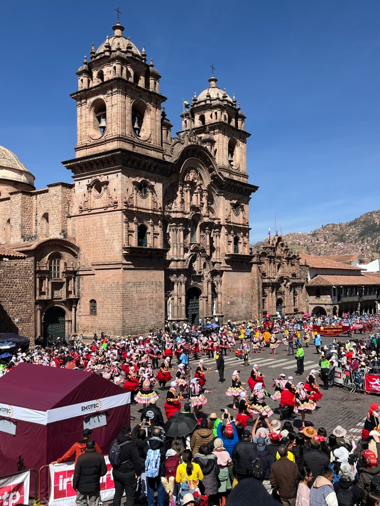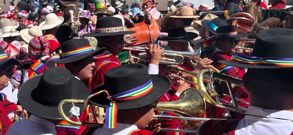 On arrive assez vite à la place d’armes, où des défilés ont lieu, chaque corps ou région défile autour de la place avec sa fanfare, ses danseurs, ses costumes, ses couleurs, et ses sourires généreux, dans un esprit de kermesse de fin d’année. Une sorte de 14 juillet non militaire, moins formel, et plus coloré. Ça fera peut-être pas reculer l’armée chilienne, mais c’est joli. Une belle expérience quoiqu’un peu fatigante avec les cuivres et le soleil.