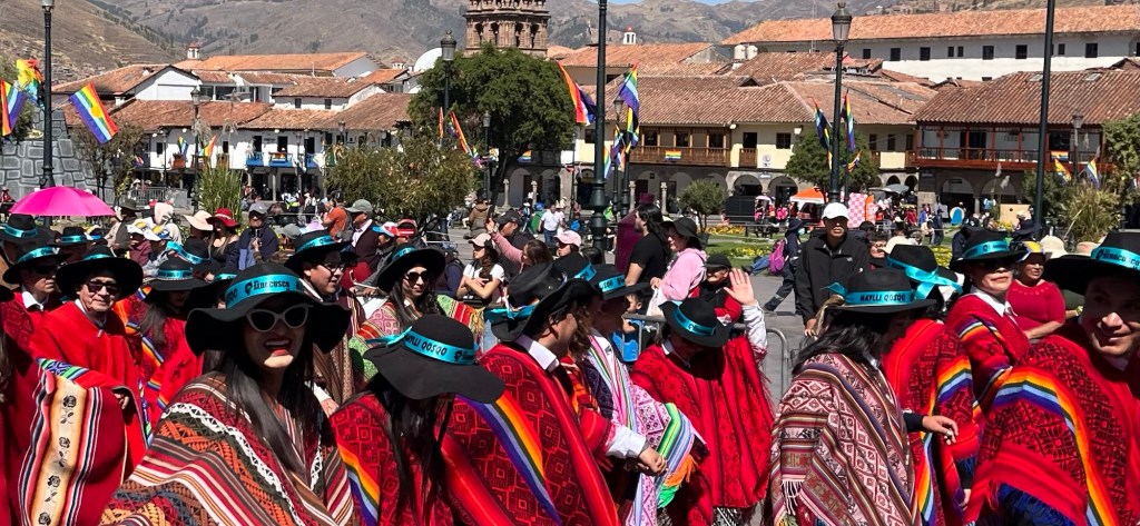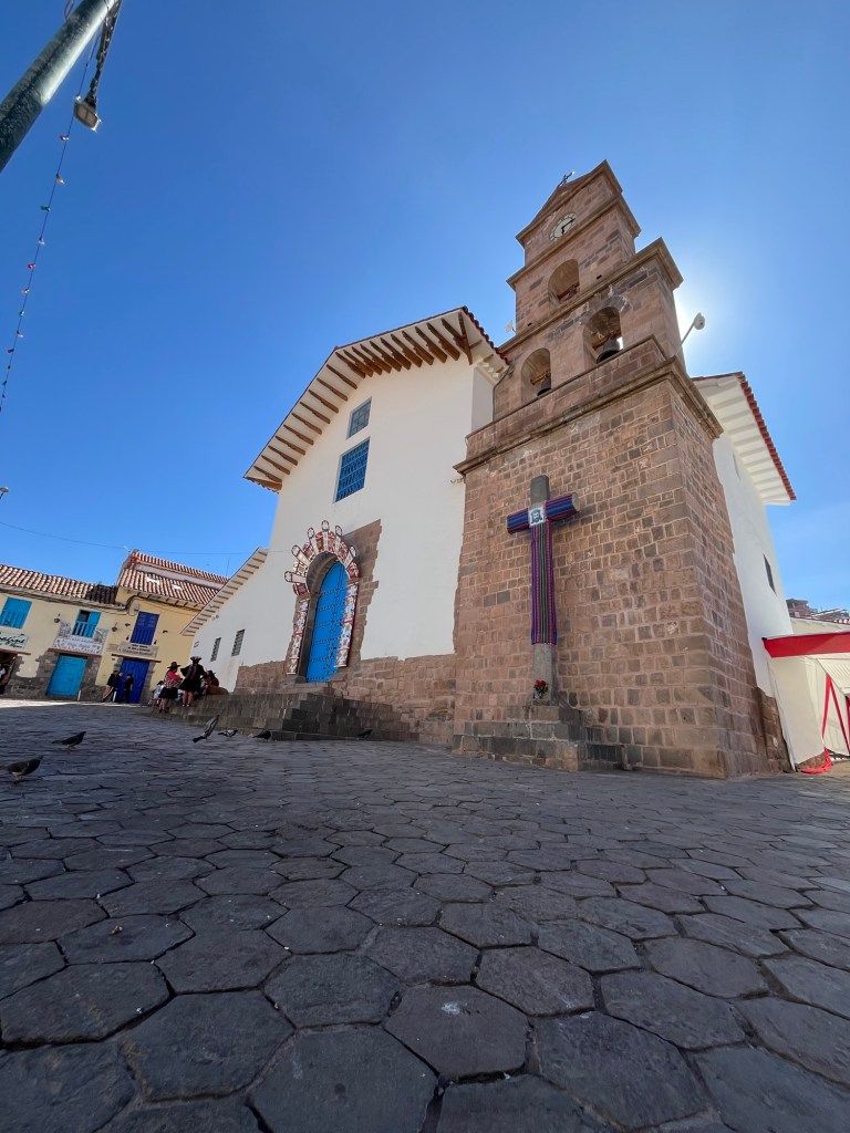 On arrive au petit quartier de San Blas, petites ruelles, maisons blanches avec de nombreux café et galeries. Devant l’église, se dresse une grande croix en pierre, vêtue des tissus colorés traditionnels incas. Inconcevable dans le pays de Jeanne d’Arc.