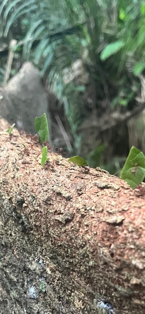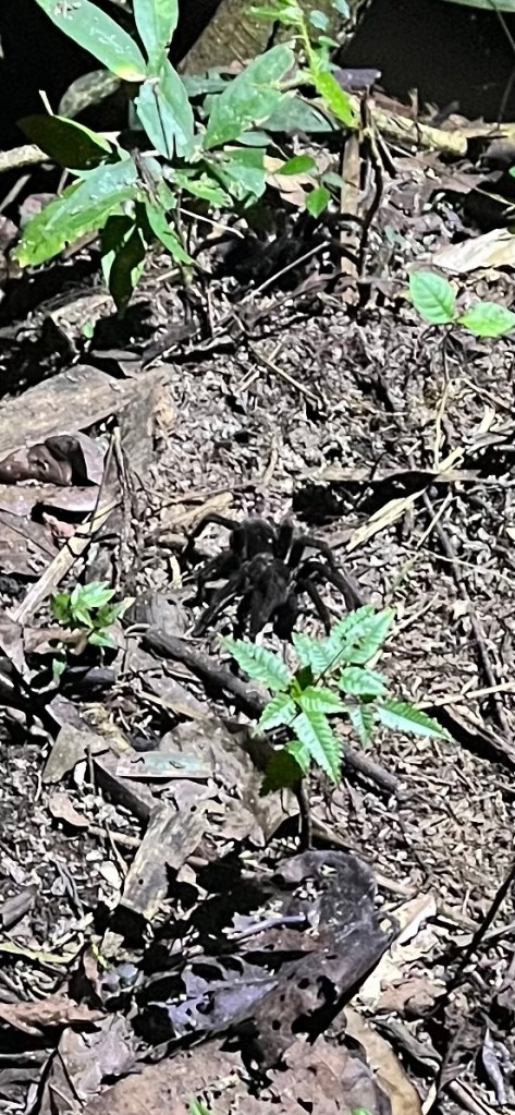 Après le déjeuner, délicieux, je tiens à le dire, on prend le bateau en direction du parc de Tambopata. Sitôt arrivé, des familles de singes écureuils ouvrent la voie et les fruits aux singes Capucins. Ces deux espèces vivent en symbiose, les écureuils se laissent voler par les capucins, qui les défendent des prédateurs. Ce parc est une nouvelle occasion pour James d’étaler l’étendue Amazonienne de son savoir sur la jungle, et de faire briller son œil du tigre. Ce type est incollable, et tellement sympa en même temps. Ainsi, on découvre les Walking palm trees, dont le tronc démarre à environ 1 m du sol, au-dessus d’une dizaine de racines raides, qui forment un cône avant de plonger dans le sol. Pourquoi walking ? car durant ses premières années, certaines racines apparentes vont sécher, tandis que d’autres situées à l’opposé vont se développer, permettant ainsi à l’arbre de se déplacer jusqu’à adopter une position plus avantageuse pour capter la lumière. Vitesse : environ 10 cm par an donc pas de crainte qu’il s’évade de votre jardin. On retrouve également quelques autoroutes de fourmis avec leur chargement de feuille sur le dos, tels qu’on en a déjà vu. Si ce n’est qu’on a aujourd’hui l’explication: elles apportent ces bouts de feuilles pour en faire un tas sur lequel elles vont vomir. Bon appétit, mais ce n’est pas fini. De cette soupe délicieuse va pousser un champignon que je ne recommanderais pas de goûter. Ce sera le déjeuner de l’année de la colonie de fourmis, qui pourra alors s’atteler à préparer un nouveau repas. Merci James ! Par un petit tour de passe passe que les grands-pères montrent à leurs petits-enfants, James, parvient à faire sortir une tarentule de son trou, grosse araignée noire et poilue.