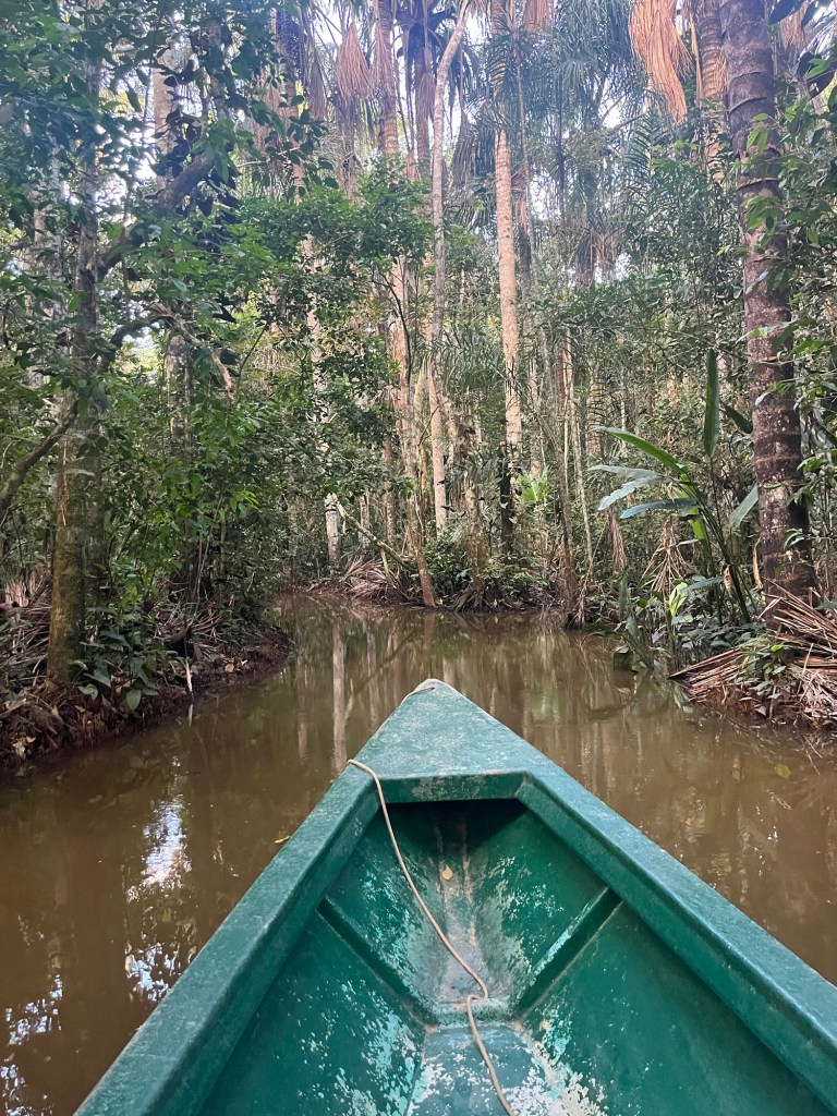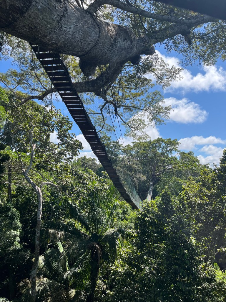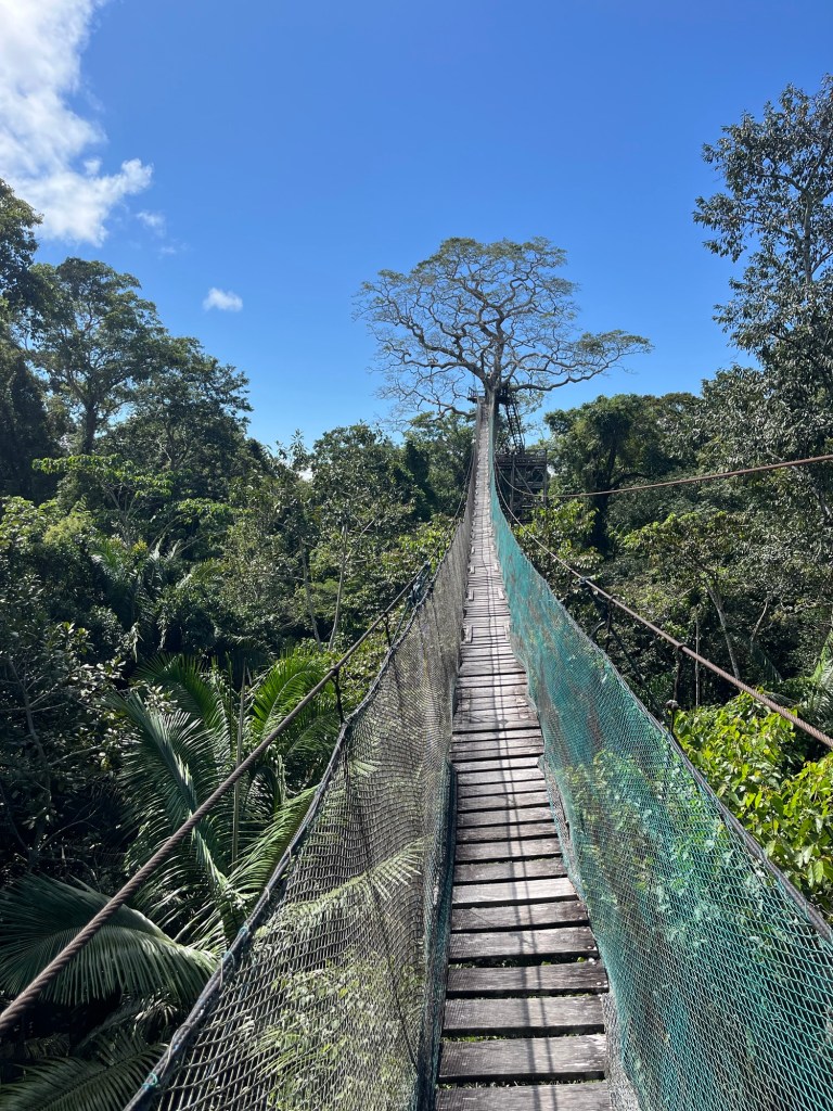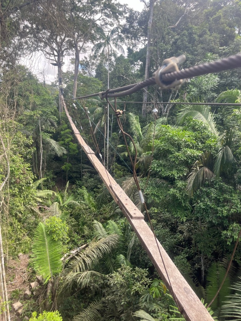 Un gros petit déjeuner nous attend à 8h, que l’on partage avec James et nos amis péruviens. Au programme ce matin, canopée et tyrolienne. L’occasion de voir quelques familles de singes un peu plus habiles que nous à 50 m au-dessus du sol. La tyrolienne de 100 m est décoiffante. Par contre le pont suspendu de 50 m sur une planche en bois de 5 cm de large l’est un peu moins
