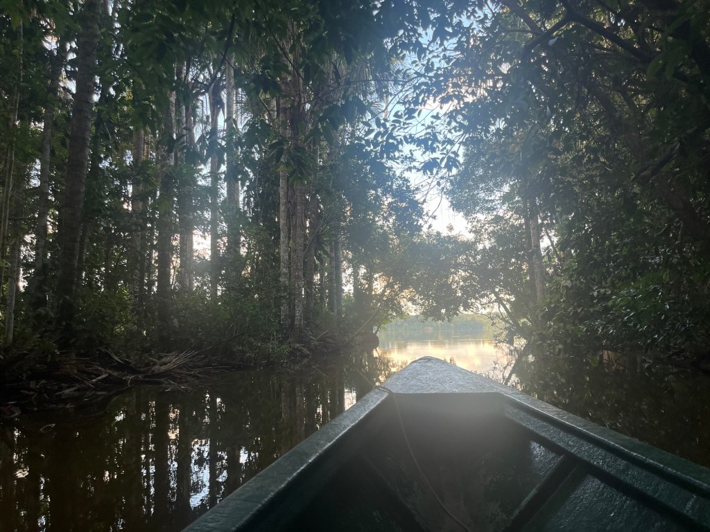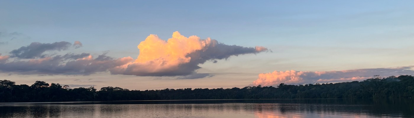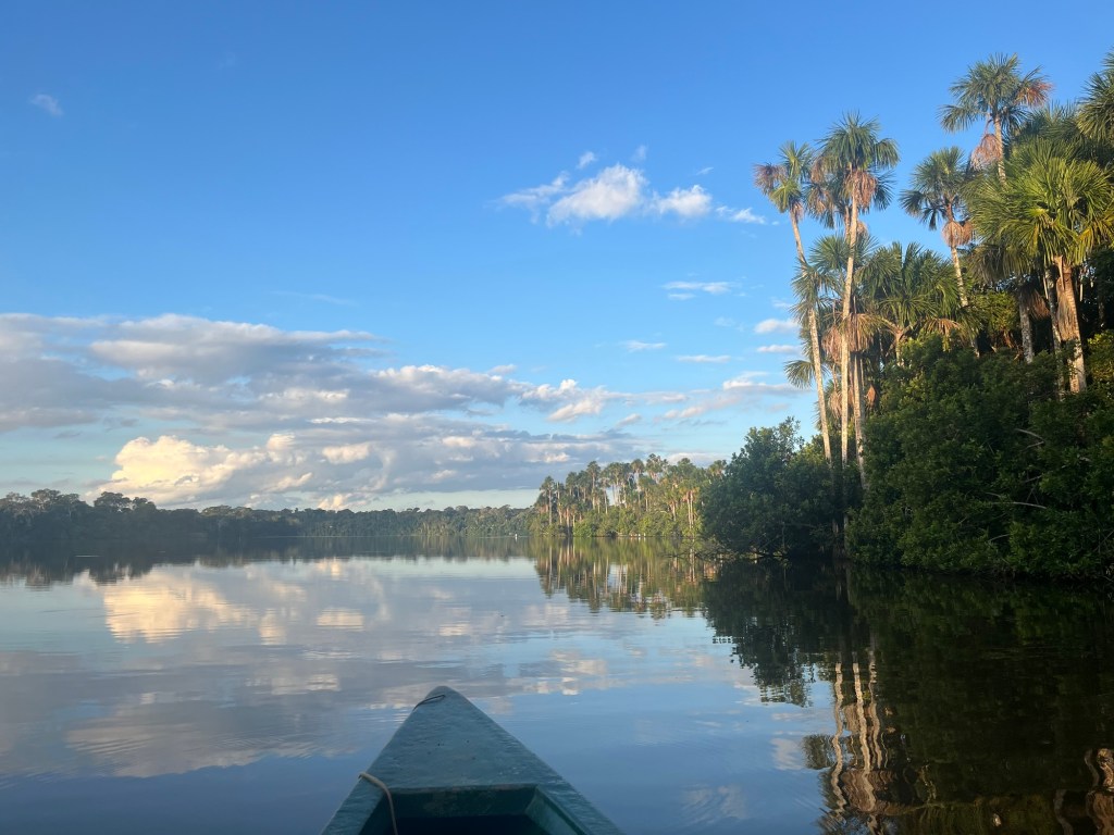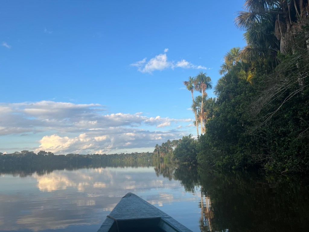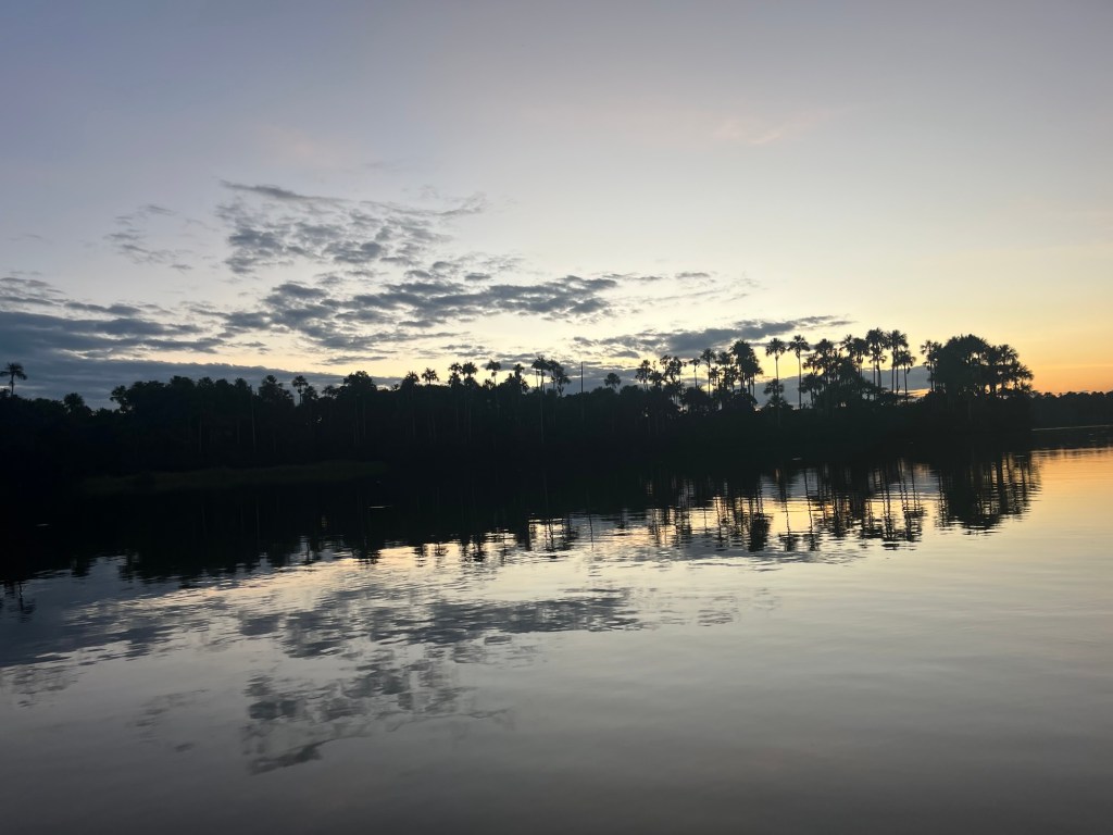 On recule prudemment, incredules, sans se quitter des yeux avec ce prédateur au calme froid. Le soleil commence à baisser et on est sans voix d’avoir vécu ça, et de pouvoir maintenant admirer les splendides couleurs du soleil couchant, au beau milieu du lac. Des perroquets bruyants viennent se poser dans les palmiers. On a l’impression de vivre un moment qui restera gravé.