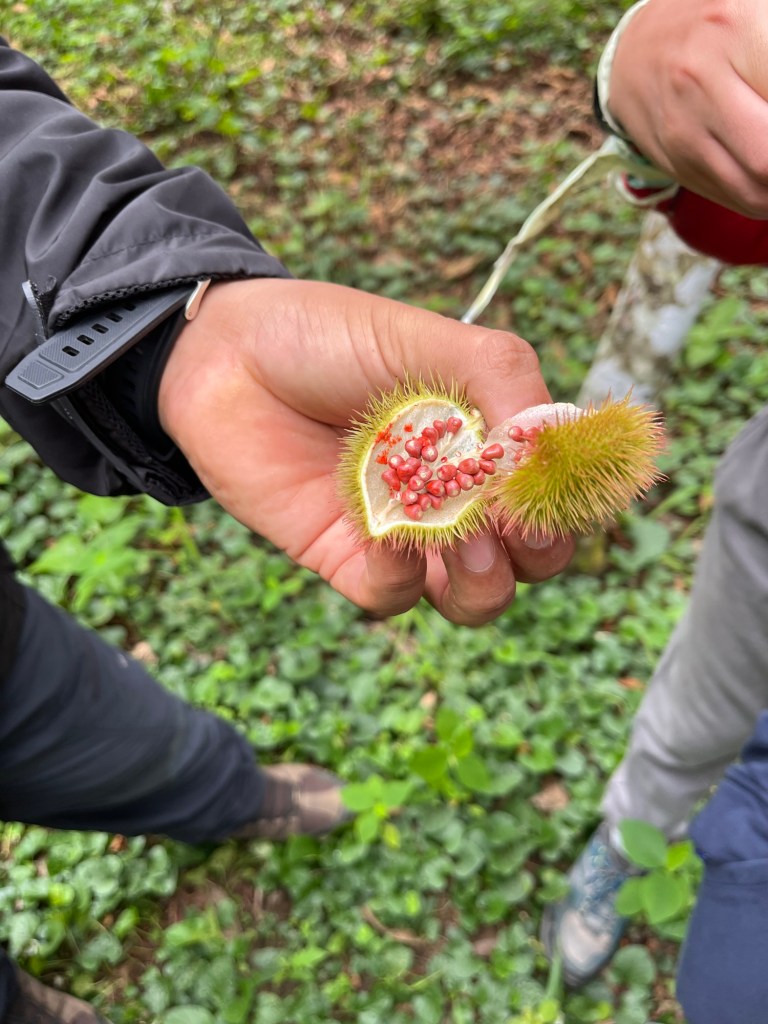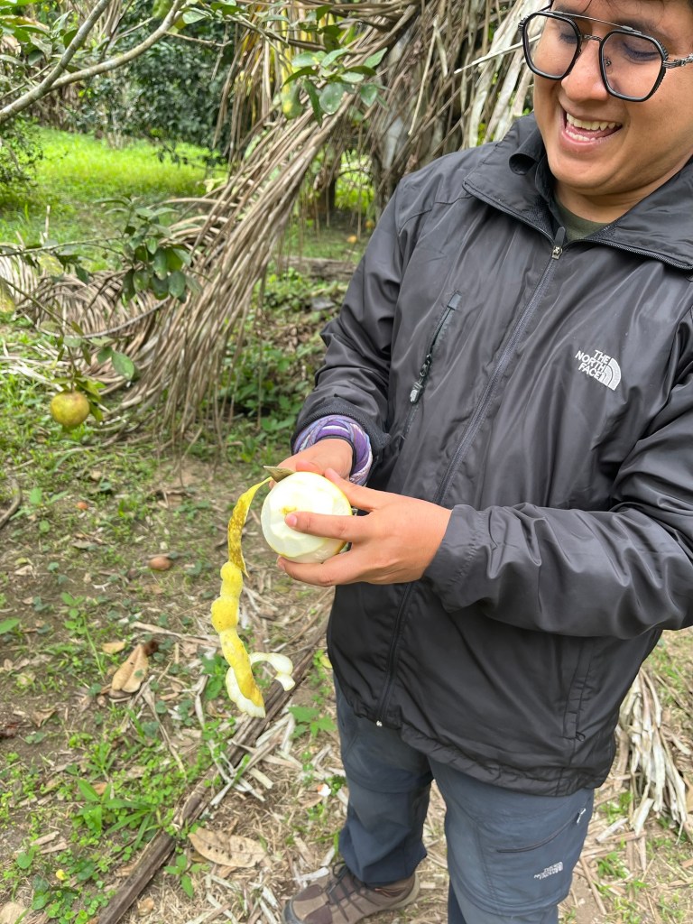 On a une dernière matinée avec notre super guide dont on boit les paroles savantes et qui a remis ses lunettes pour l’occasion. Après quatre jours complets en sa compagnie, James fait maintenant presque partie de la famille. On commence tout doux avec le bananier, qui n’est pas un arbre, mais une plante, car sans tronc. Il ne donne qu’un régime de bananes dans sa vie, il faut le couper pour en avoir de nouveau. C’est tout ? Non, car James maîtrise l’art du suspens comme personne, il nous présente alors la Banana Spider, qui est en fait, avec son nom de super-héros, une super méchante, et de loin l’araignée la plus dangereuse. Sans antidote dans les 10 heures, la paralysie est totale, les vaisseaux sanguins explosent et le sang sort par tous les orifices du corps, nous apprend James avec la sérénité d’un professeur d’université. Vous avez l’image? Elles vivent dans les régimes de bananes, afin de se régaler des abeilles qui viennent butiner la fleur. Autre mise en bouche devant le réfectoire – l’histoire de la mouche qui pond ses œufs sous la trompe du moustique; en piquant, l’œuf est délicatement déposé sous la peau, et le vers va sortir, se nourrir et grandir, toujours sous la peau. Le seul remède efficace au milieu de la jungle est la poudre de feuilles de bananier qui va étouffer le vers. Si vous n’aimez toujours pas les moustiques, on rappelle que ce sont les seuls à pouvoir polleniser la fleur de cacao, donc réfléchissez bien avant de les écraser avec une savate et un sourire sadique. Comme on dit, « pas de moustique, pas de chocolat ». Le cacao étant plus lucratif que la banane, il la remplace progressivement au Pérou. Il se vend ici à 10 € le kilo. N’allez pas voir au supermarché le prix au kilo du produit fini…