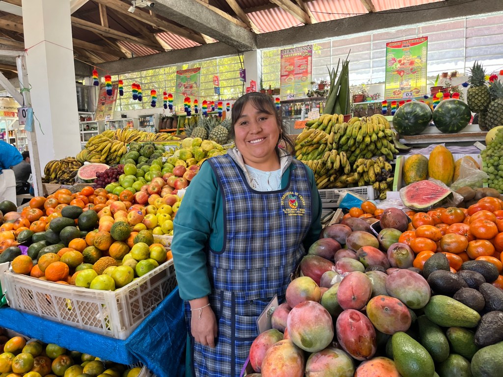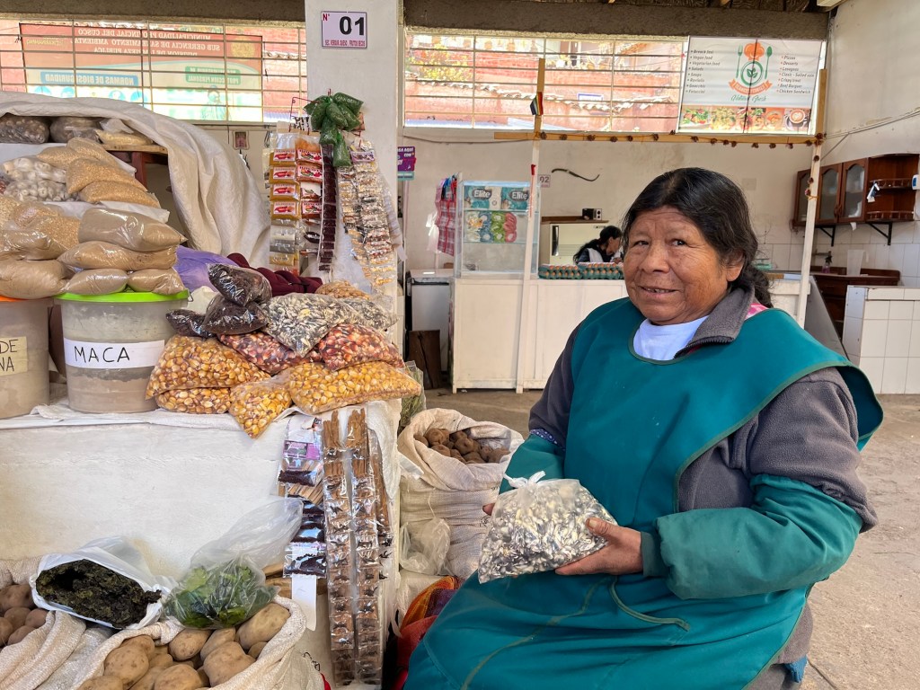 On va faire un dernier tour au marché de San Blas, dire au revoir à nos vendeuses préférées que j’immortalise sans momifier, puis on remonte déjeuner, J est stable.