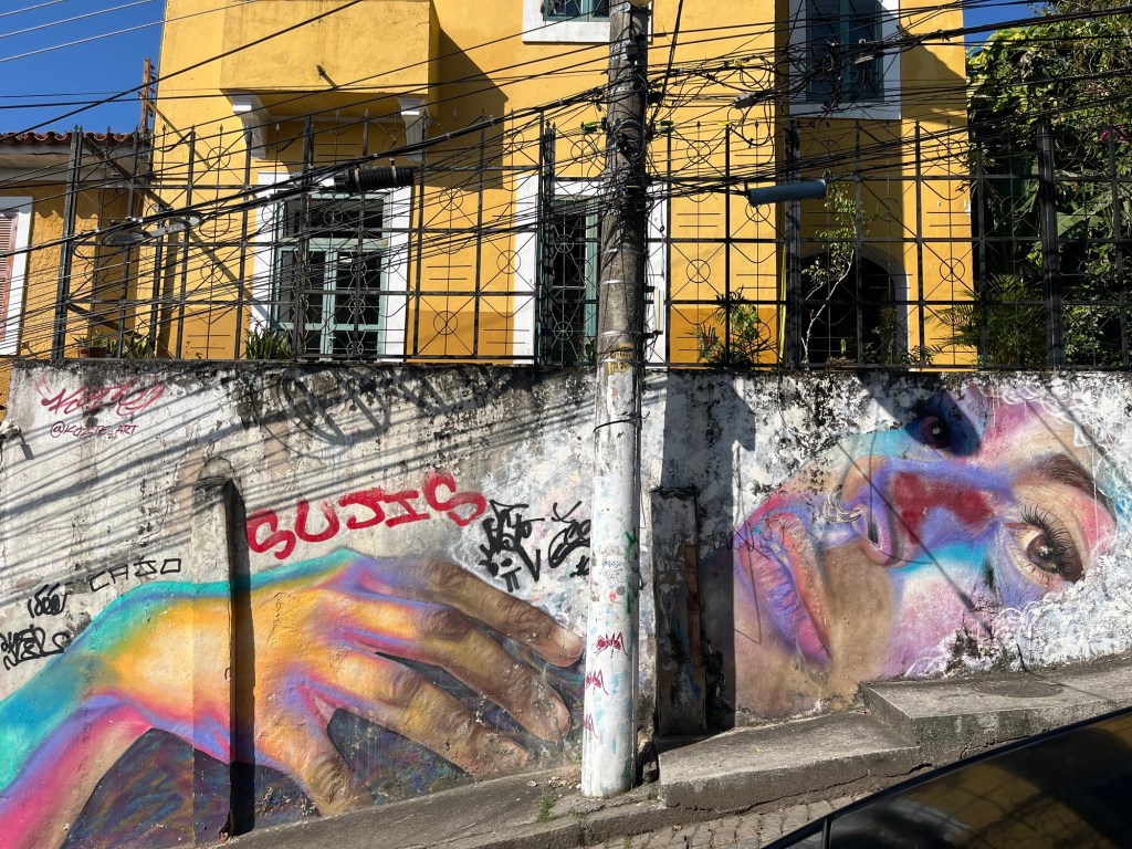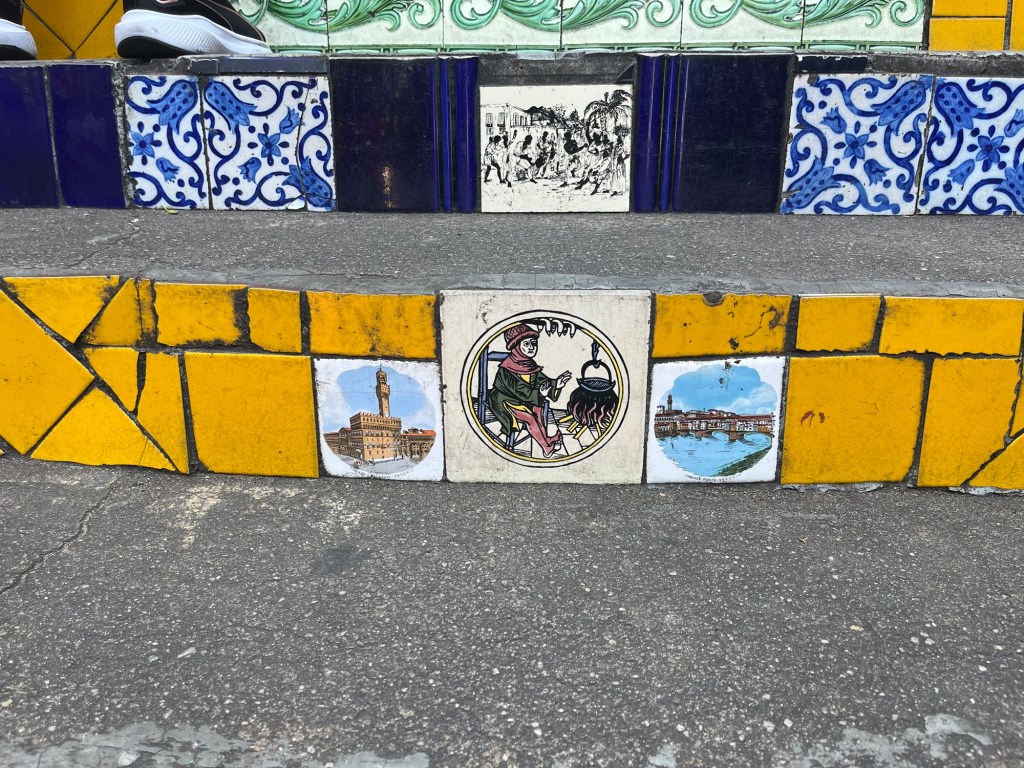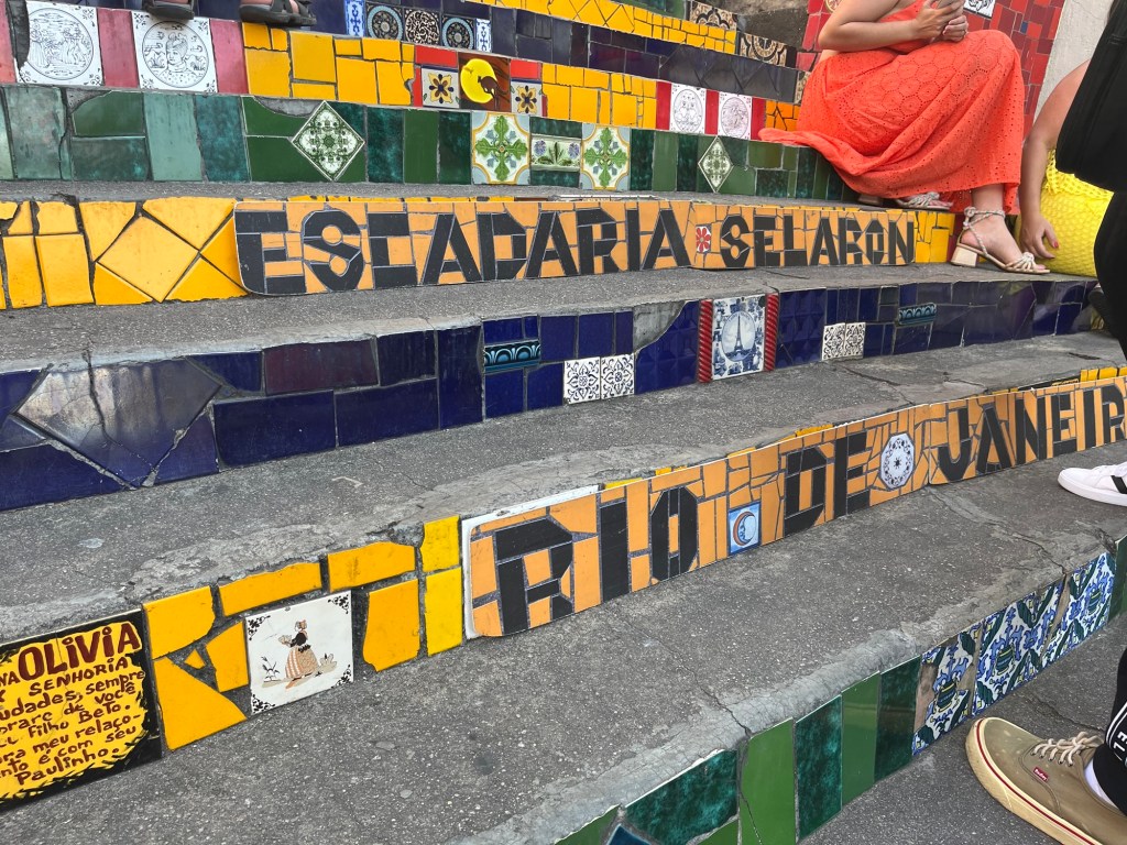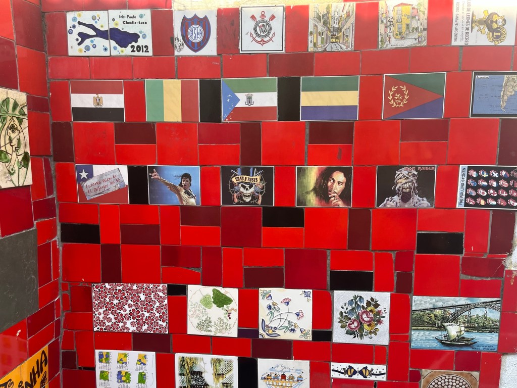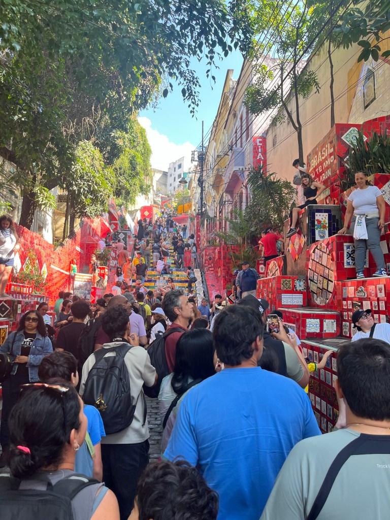 On ne peut pas prolonger le séjour à Rio, donc on entame déjà les recherches pour notre prochaine destination – un voyage dessiné au fur et à mesure. J’envoie mes habituelles bouteilles à la mer sur airBnB – on verra si ça mord, mais du coup, on part assez tard de l’appartement, ce qui est toujours un peu frustrant pour moi. On décolle vers Santa Teresa, un quartier un peu arty. Le chauffeur nous dépose au pied de l’Escadaria Selaron, un gigantesque escalier rouge aux multiples mosaïques du monde entier. Où posent sans surprises des dizaines de sourires figés par un maquillage à la limite du ridicule. Mais ne jugeons pas ce spectacle, voulez-vous.