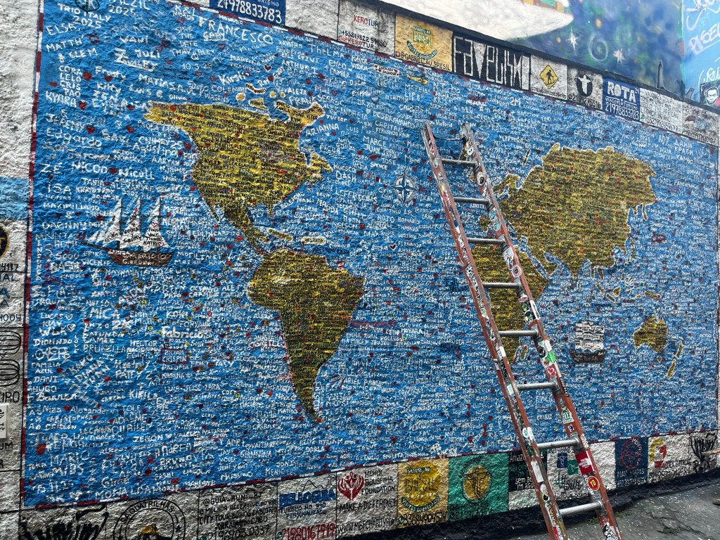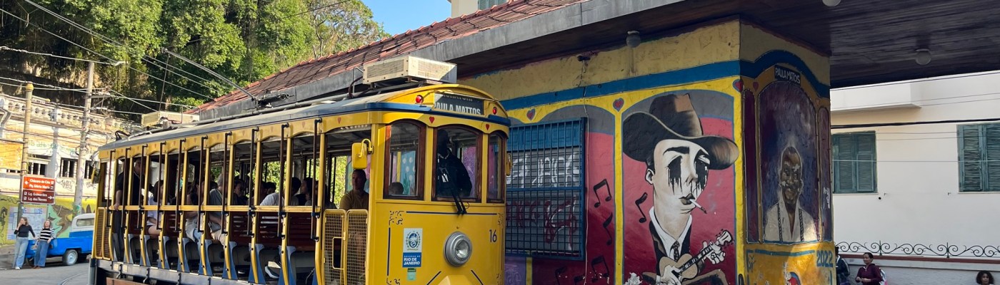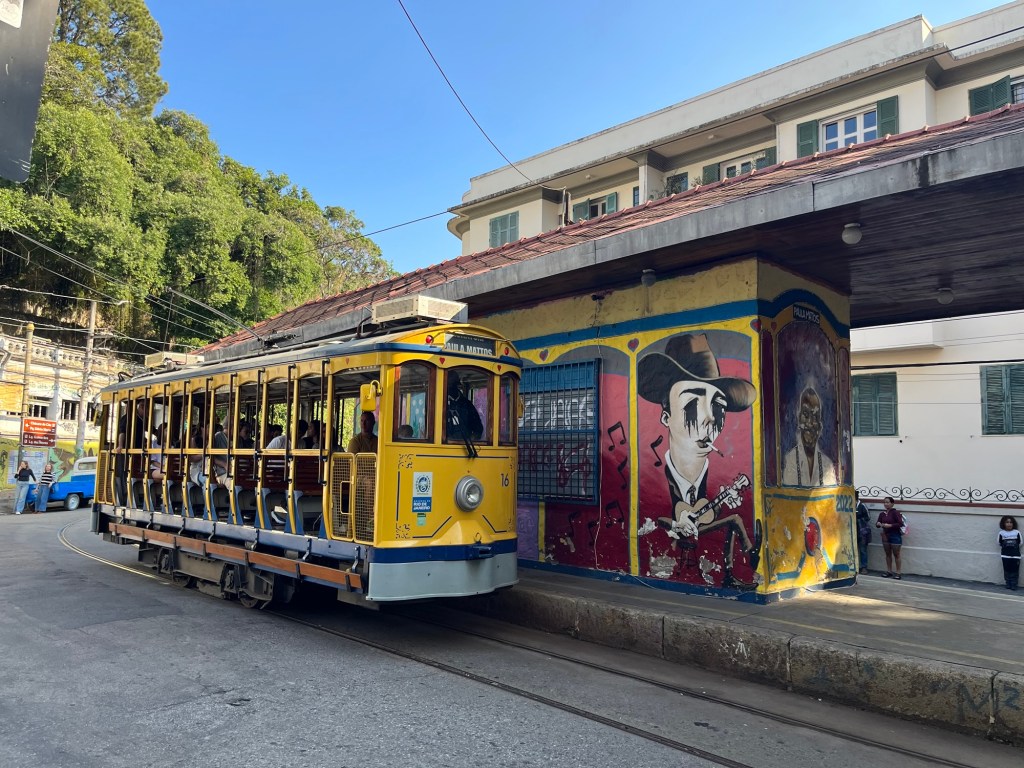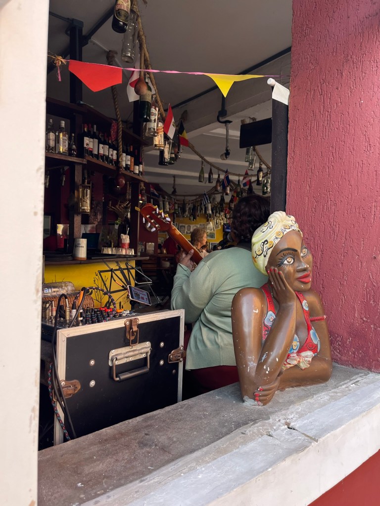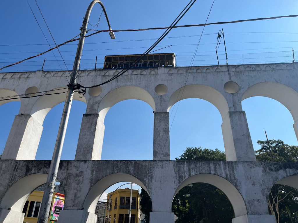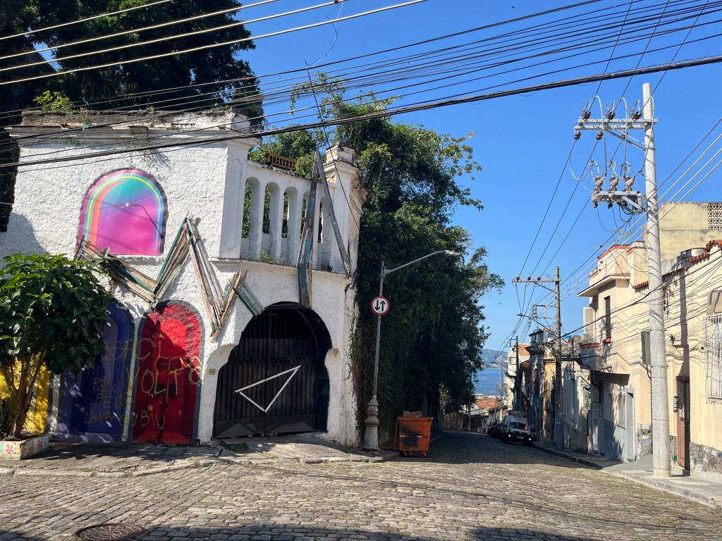 On ne peut pas prolonger le séjour à Rio, donc on entame déjà les recherches pour notre prochaine destination – un voyage dessiné au fur et à mesure. J’envoie mes habituelles bouteilles à la mer sur airBnB – on verra si ça mord, mais du coup, on part assez tard de l’appartement, ce qui est toujours un peu frustrant pour moi. On décolle vers Santa Teresa, un quartier un peu arty. Le chauffeur nous dépose au pied de l’Escadaria Selaron, un gigantesque escalier rouge aux multiples mosaïques du monde entier. Où posent sans surprises des dizaines de sourires figés par un maquillage à la limite du ridicule. Mais ne jugeons pas ce spectacle, voulez-vous.