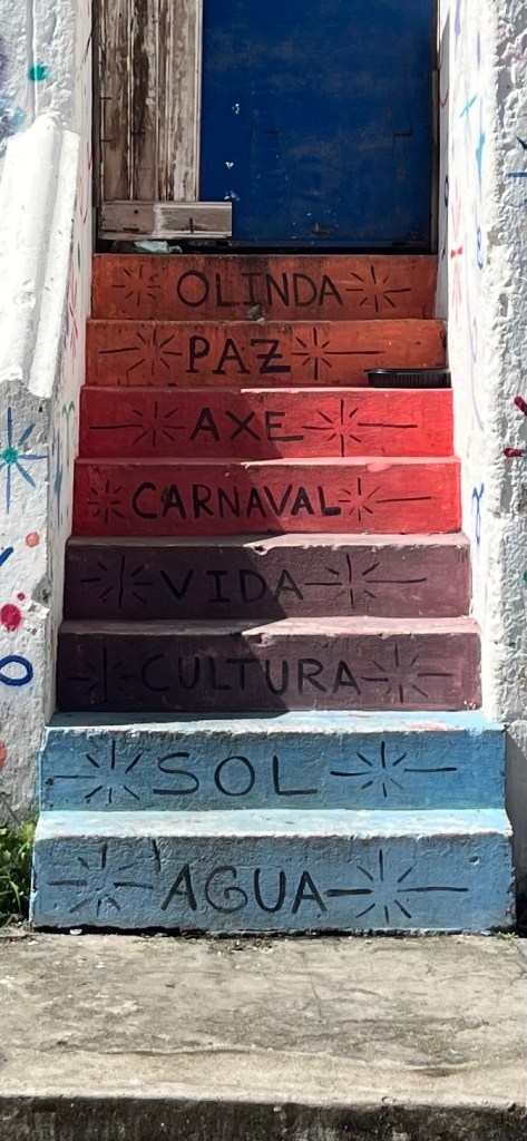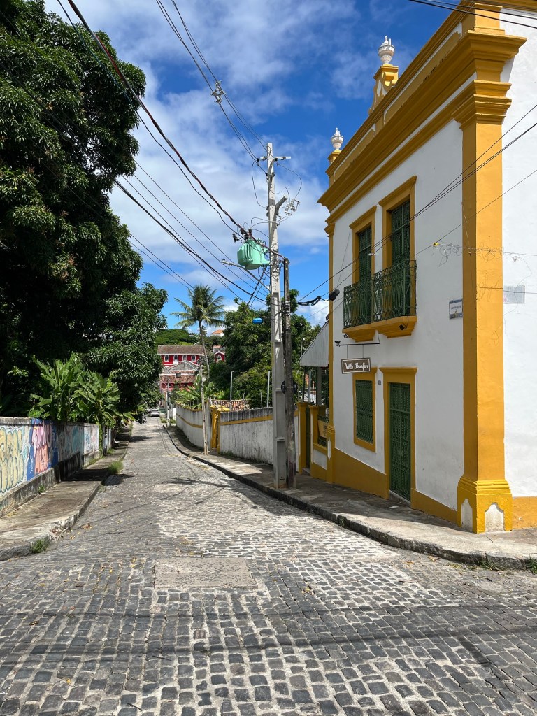On se ballade d’église en église surprise, dans ce dédale de ruelles, quand il se met à pleuvoir. Oh! On ne s’y attendait pas, on trouve refuge dans la belle maison blanche d’Alceu Valença, acteur chanteur des années 70 dont, par le plus grand des hasards j’avais une chanson. C’est désormais un musée pour les fans. Voire pour les inconditionnels, avec des extraits de films amateurs où il tient un rôle, et des vidéos de clips avant-gardistes. Heureusement la pluie cesse, et on peut admirer la splendide vue depuis les petits balcons. Et surtout quitter ce musée. Cette ville respire la quiétude, et cultive une certaine lenteur, presque fièrement on dirait.