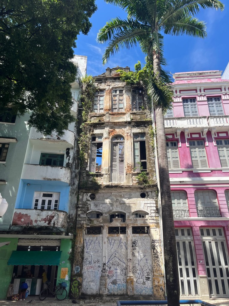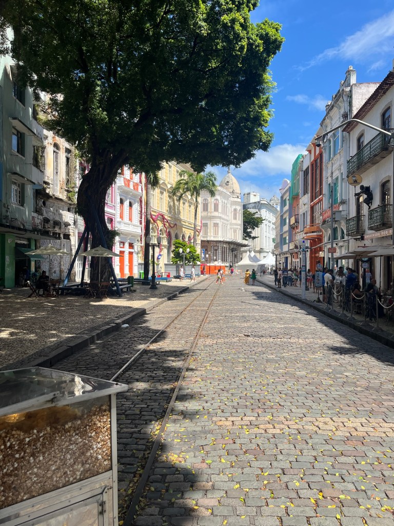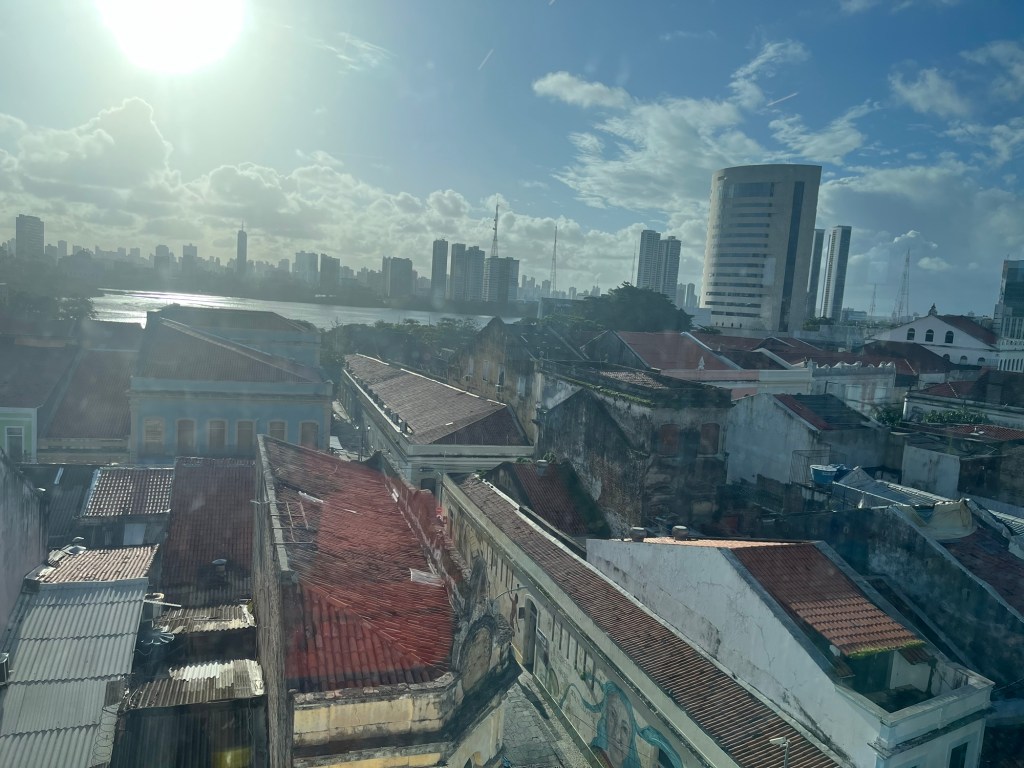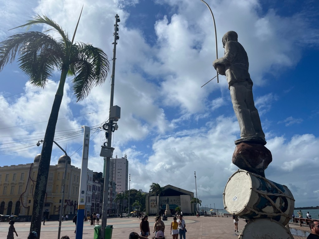 Pour rester dans l’ambiance, on se dirige à quelque pas de là vers le musée du Févro, cette danse du Nordeste brésilien. Le musée est très coloré, présente de nombreuses photos portraits du carnaval de Recife et d’Olinda, et quelques vidéos. Le petit parapluie multicolore, symbole de cette culture est également très présent dans cette danse folklorique. Je le vois comme un outil simple qui transforme les moments difficiles (la pluie) en moments joyeux (une danse). Mais c’est mon interprétation complètement personnelle. On a une très belle vue depuis le troisième étage sur les vieux bâtiments du quartier et sur l’océan. On va justement terminer par une petite balade sur la plage de Recife, mais pas le temps de se baigner car les nuages noirs approchent, et il y a également beaucoup de requins le long de la côte, paraît-il.