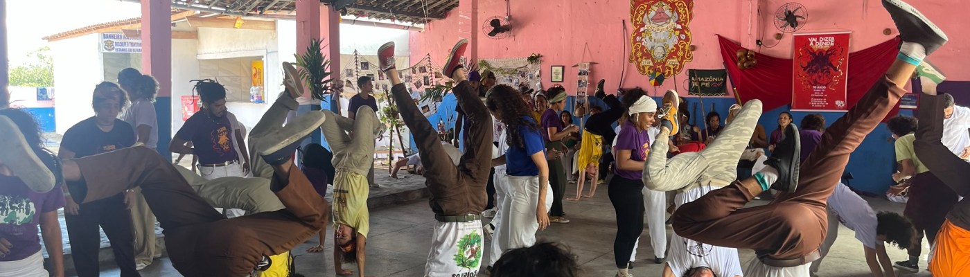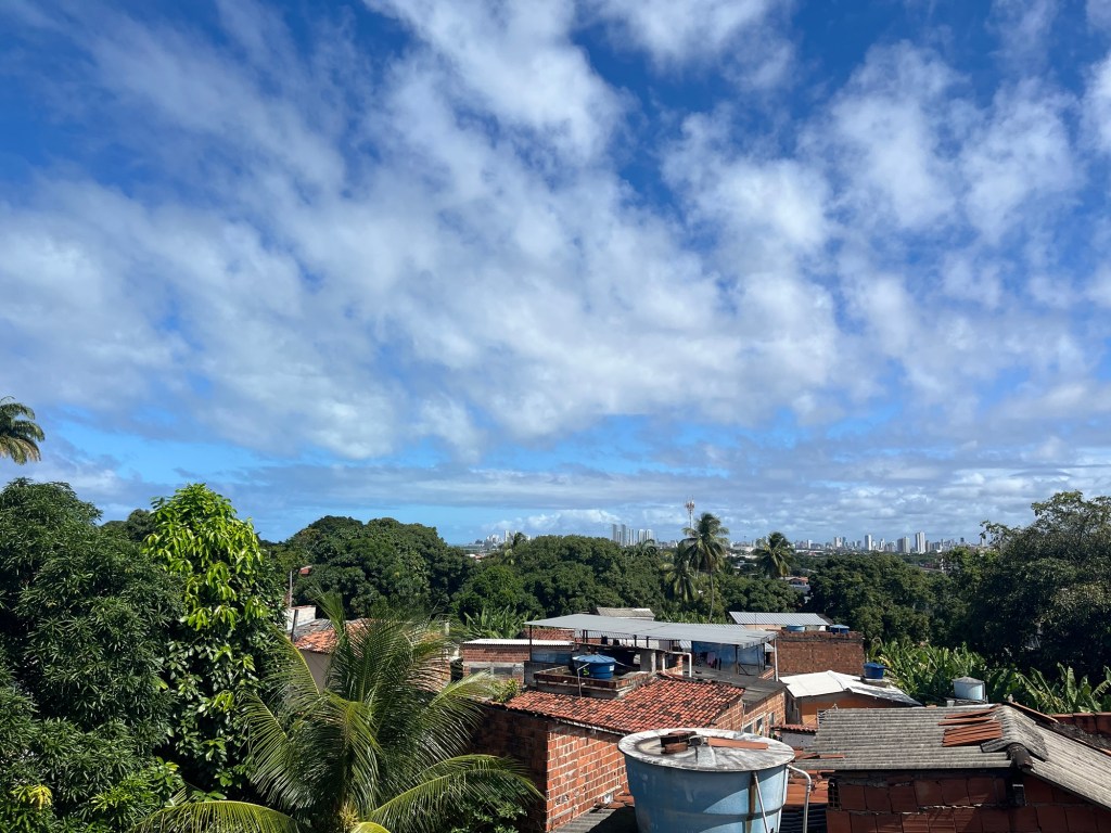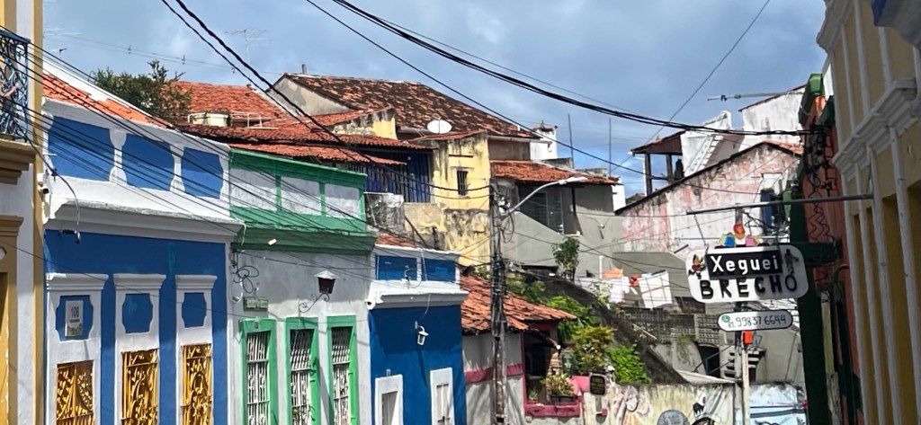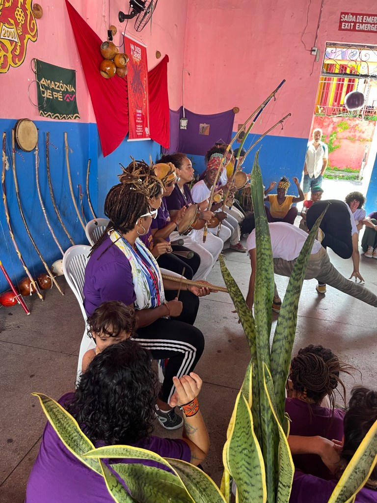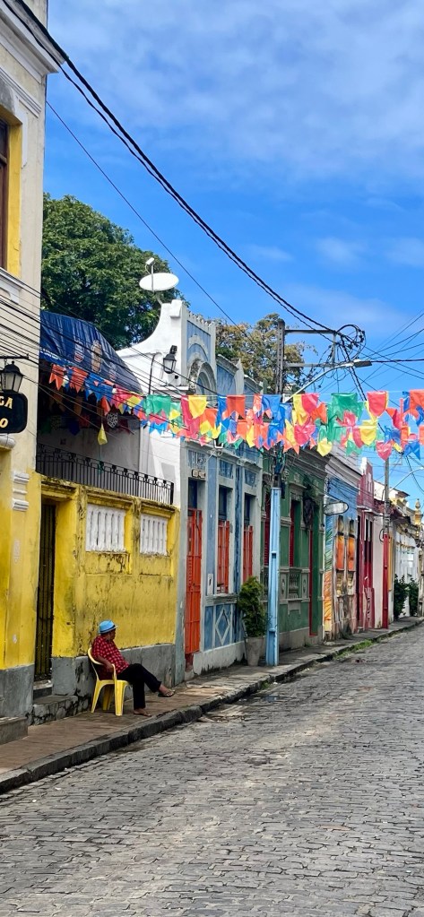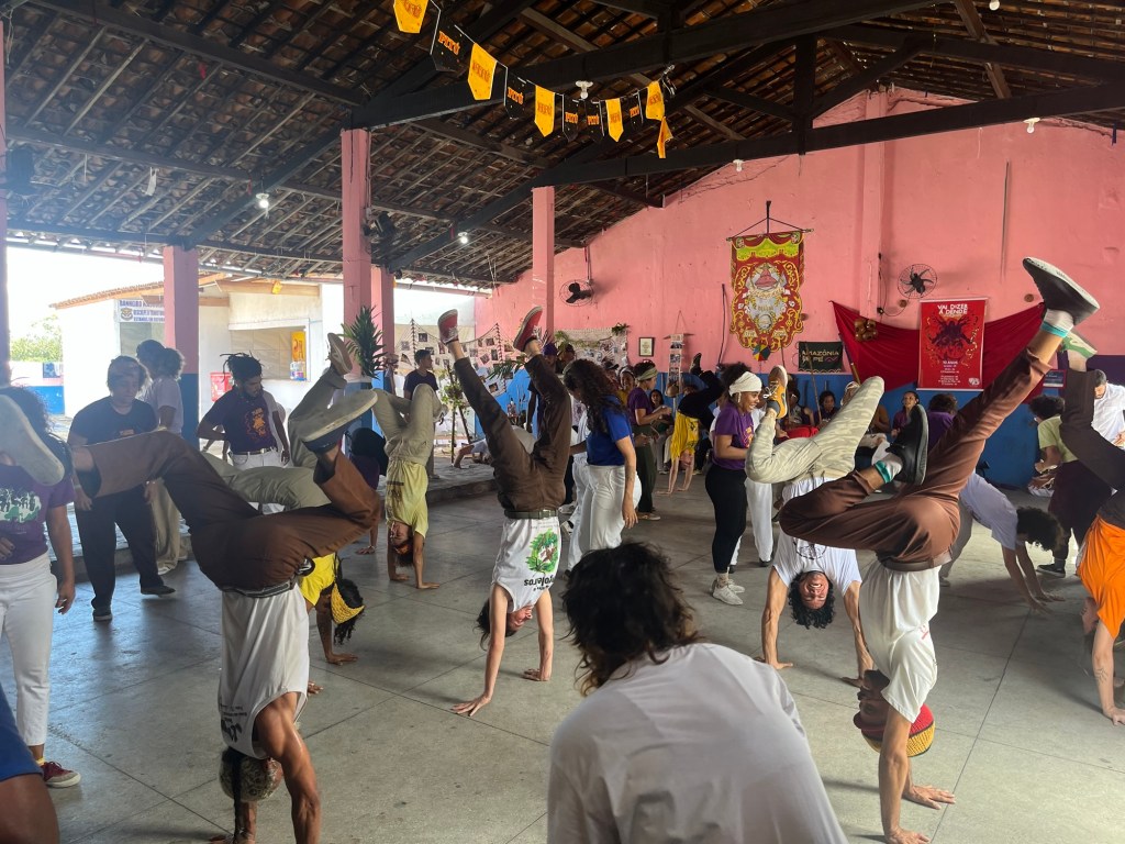 On voulait terminer Olinda par la visite d’un beau couvent, mais notre trajet fut interrompu par des chants très familiers. Je passe la tête à travers la fenêtre où un gamin de quatre ans est assis sur le bord, quand je vois qu’il s’agit d’une école de capoeira, une centaine de participants de très bon niveau pratique l’Angola. On rentre, on demande timidement si on peut participer au cours avec J, mais la Mestre ne se montre pas vraiment enthousiaste à cette idée. Elle préfère poser devant un photographe que de partager. Soit. On regarde l’échauffement et les exercices avec envie. Puis la roda – il y a tellement de beauté, de grâce et de puissance contenue dans l’Angola, c’est un vrai plaisir à regarder! Également intéressant de voir le déroulement d’un autre cours, dans cette salle, à la limite de la ville, avec une terrasse qui donne sur les palmiers et les tours de Recife au loin.