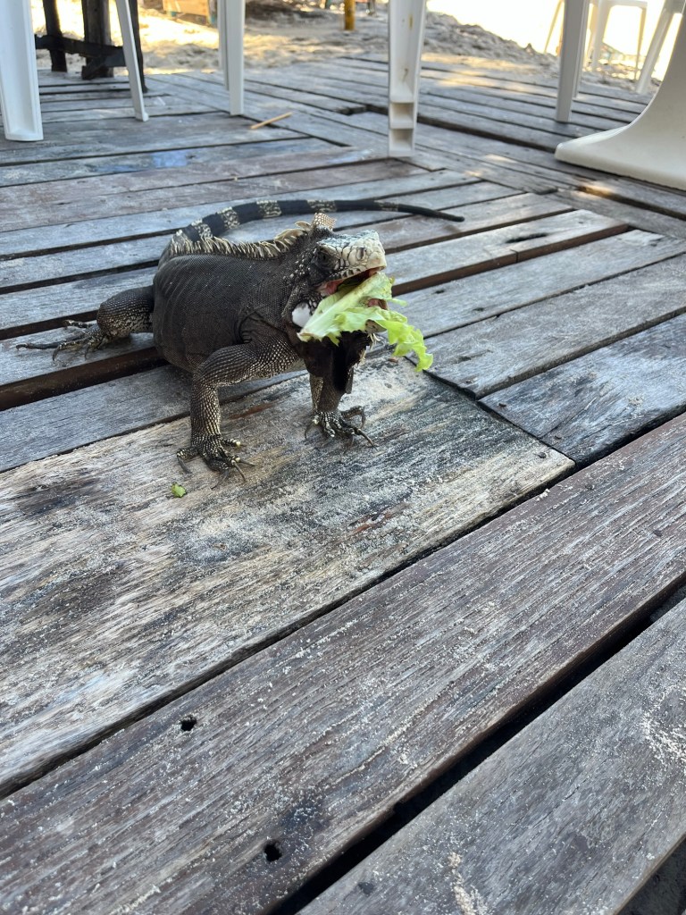 On distingue des parasols au loin, ce qui ne nous pose pas plus de problème de conscience que ça. Le moqueca ne sera pas mauvais, mais surtout très long à arriver. Le temps de nourrir l’iguane qui a élu domicile sur le palmier à côté. Sans doute très côté comme palmier pour ces créatures hideuses…