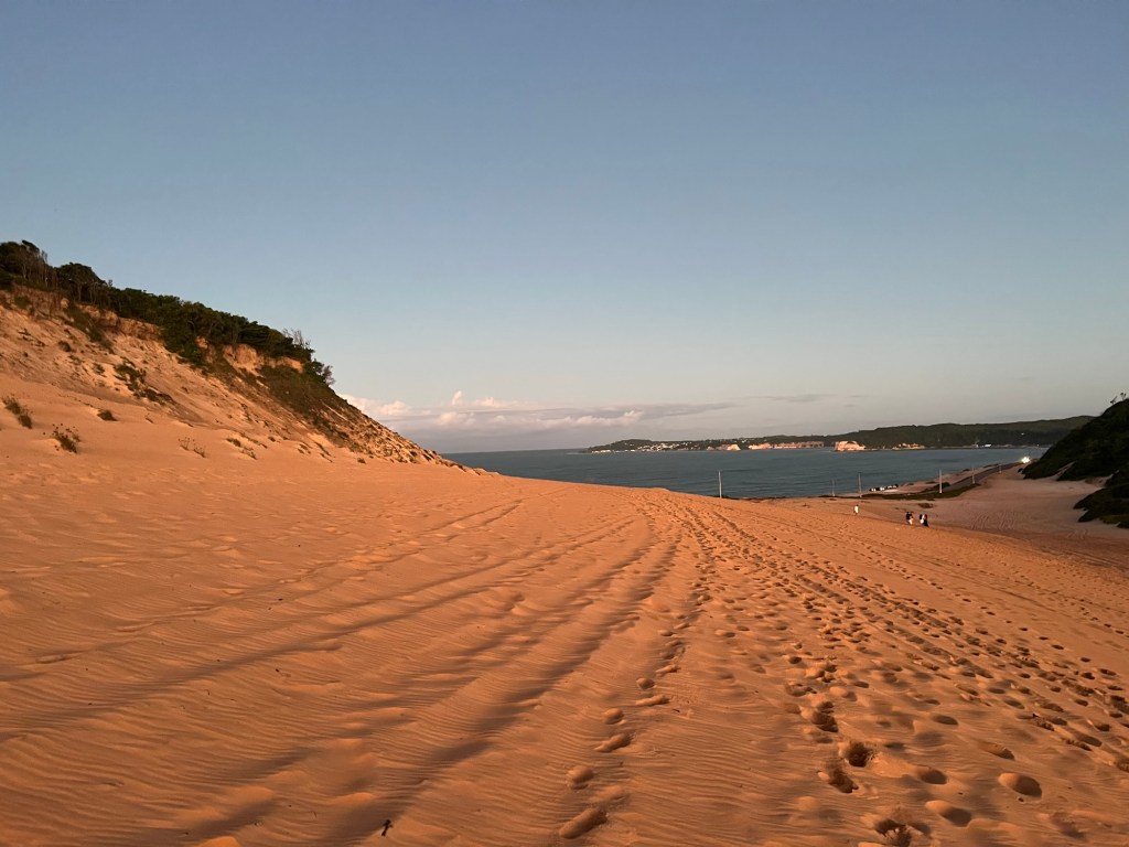 Pour terminer cette journée qui avait déjà pas si mal commencé, on loue 4 sand boards pour 6 euro (c’est là qu’on se rend compte qu’on n’est plus aux US ou au Costa Rica) et après une leçon express, on commence déjà à se marrer en dévalant la dune face à l’océan en lançant des yuhuu. C’est plus facile que le surf à vrai dire…. Et sans débourser, on peut même aller admirer un coucher de soleil depuis le sommet de la dune qui domine la rivière et la forêt. Priceless ….