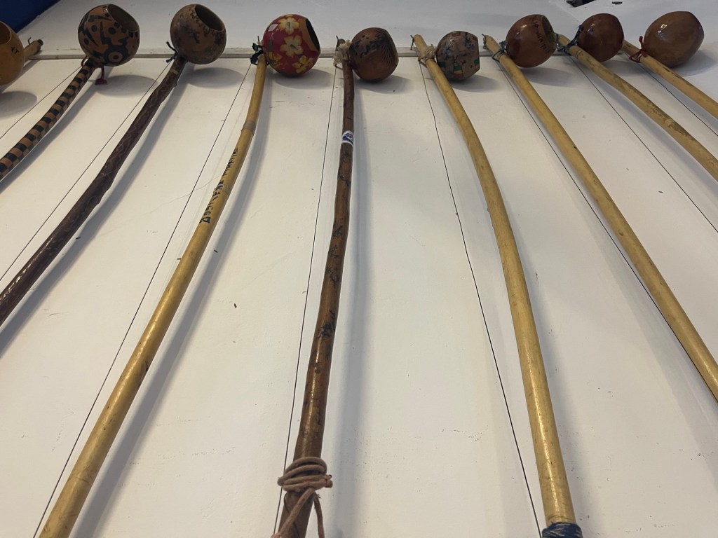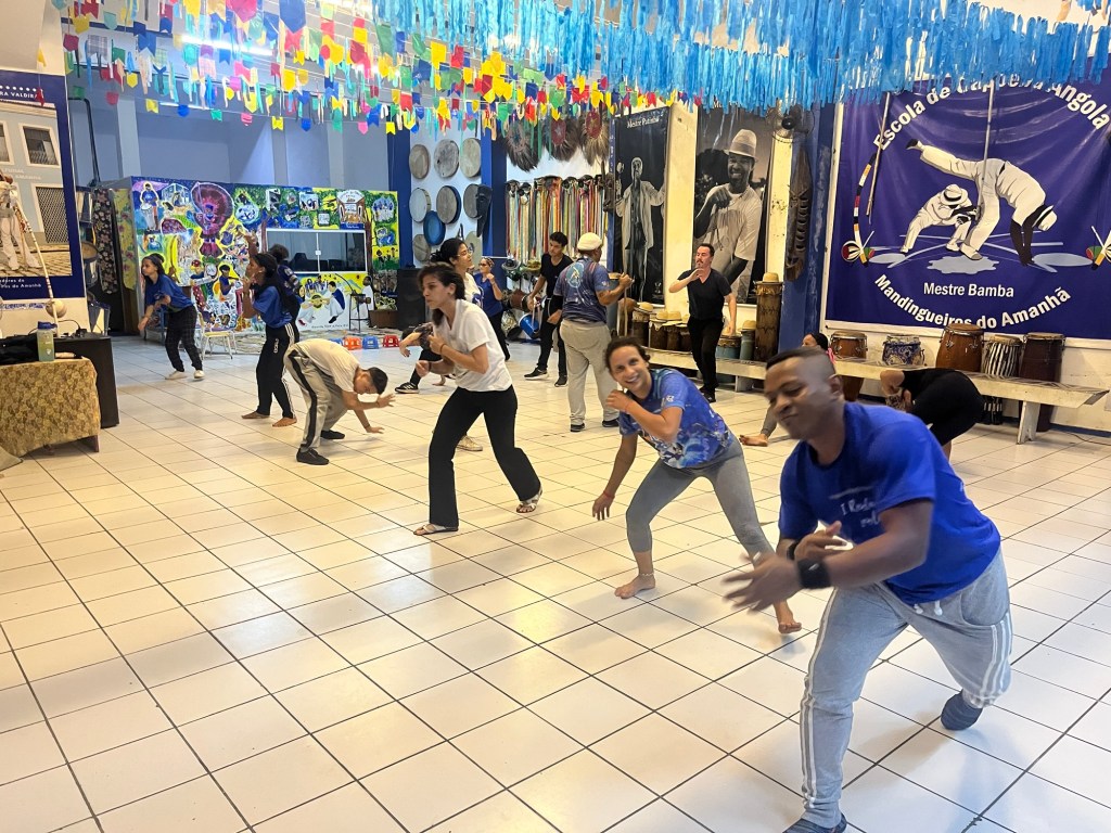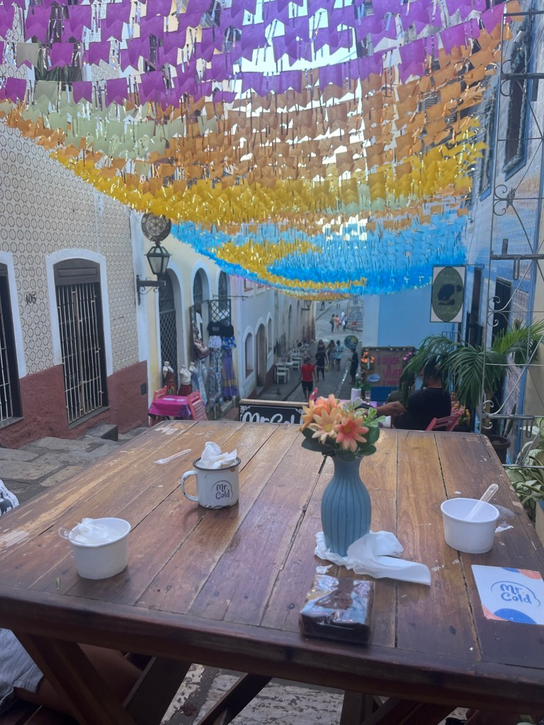 Un gaillard joue du berimbau dans la rue devant un centre culturel, je vais évidemment à sa rencontre. La salle est belle, décorée de berimbau et de pander accrochés au mur, mais le cours ne commence qu’à 19h. Ce qui nous laisse plus de deux heures pour déguster une glace en terrasse au milieu d’un escalier, et regarder les gens passer. Je regrette de ne pas l’avoir fait plus souvent pendant ce voyage, c’est tellement amusant et intéressant, on apprend tellement en regardant les passants d’une nouvelle ville. C’est autant reposant qu’enrichissant. Mais les passants passent, l’heure tourne, et le glacier ferme. Toujours rien à signaler à la salle de capoeira. Par contre un bon guitariste de bossa joue sur la terrasse en face, on s’assoit sans se régaler. Vers 20 heures le cours de capoeira Angola commence un peu plus sérieusement mais la lassitude commence à se lire au sein la gentille compagnie, et on rentre gentiment dans nos quartiers. On a tenté.