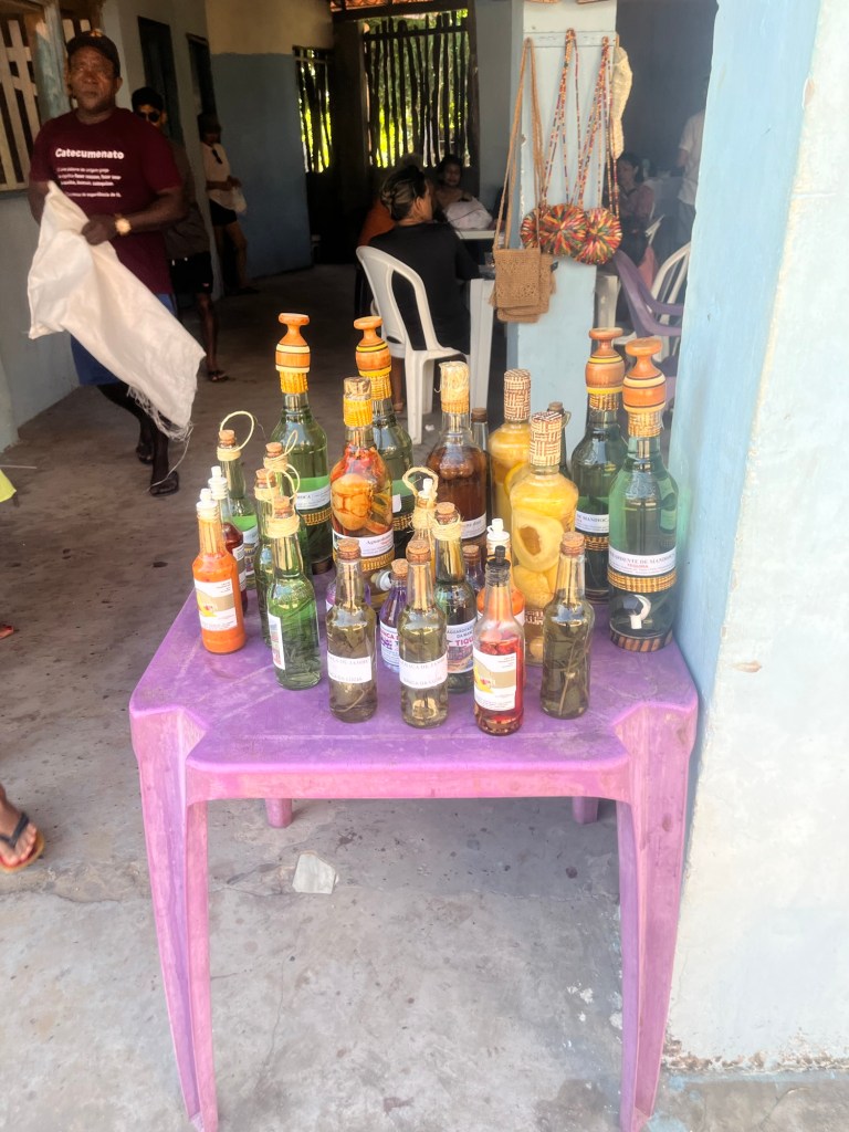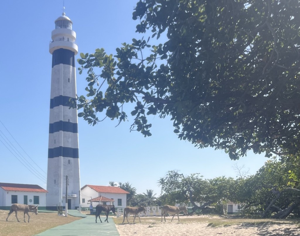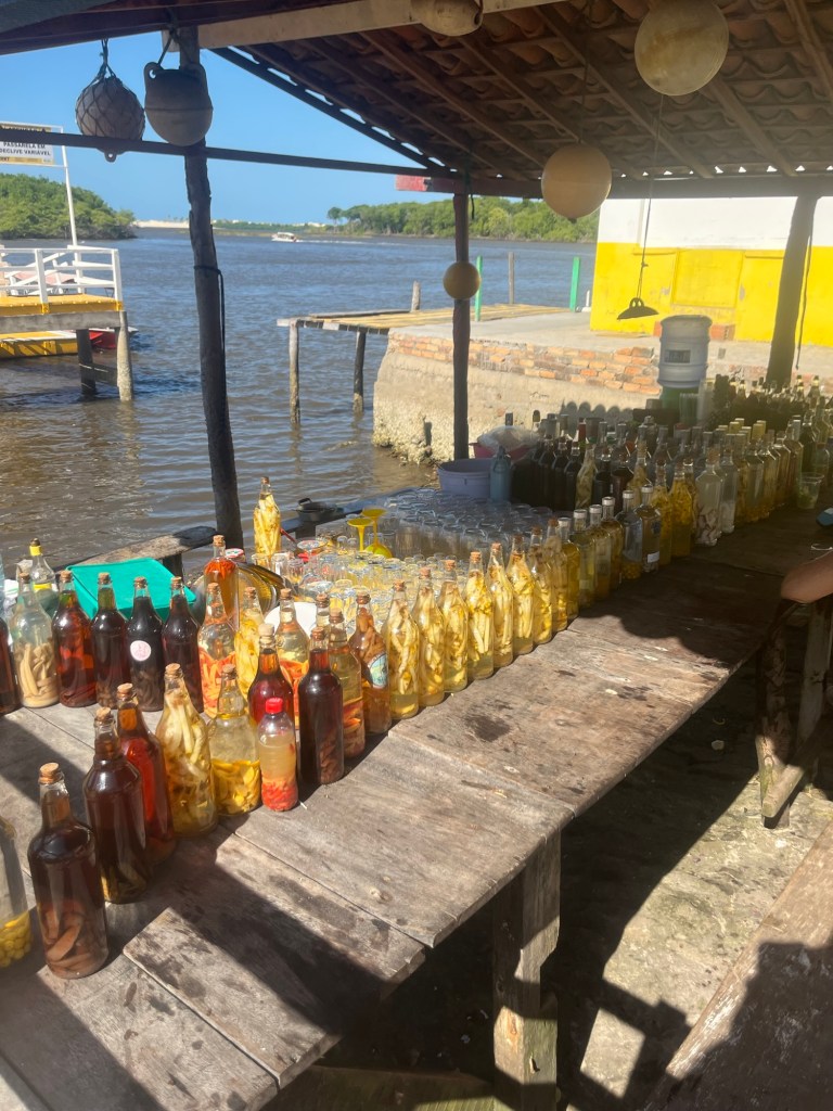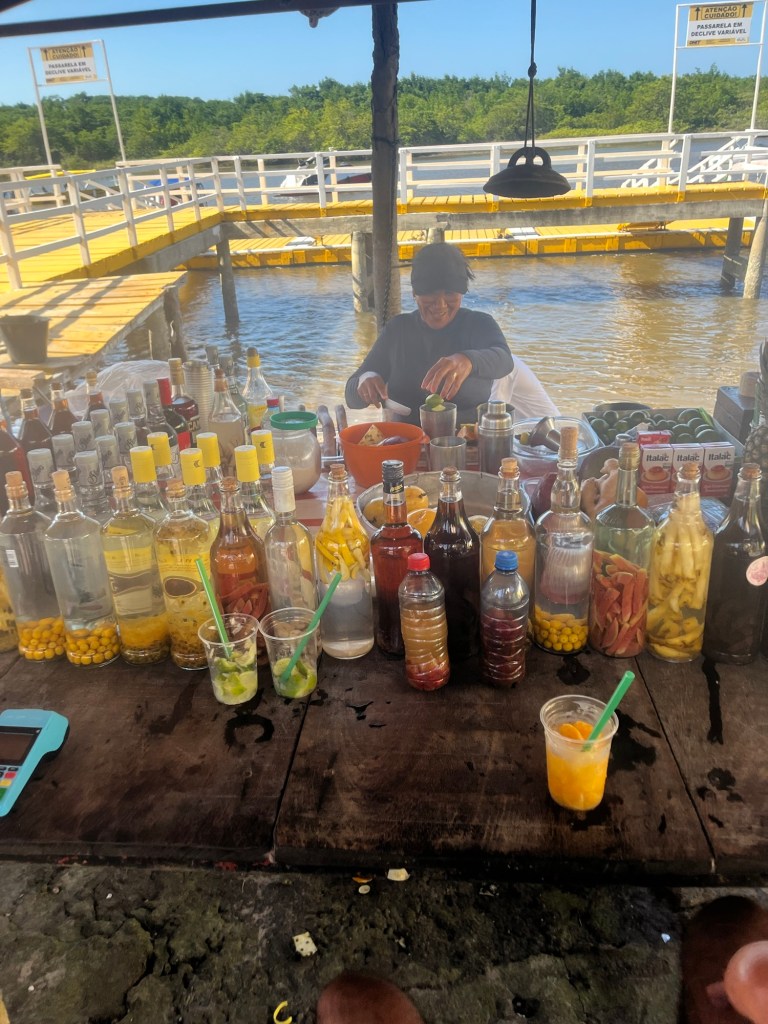 L’étape suivante est le petit village de Caburé, ses rues en sable brûlant, sa succession de boutiques d’artisanat kitsch, et de bars à cocktails à l’hygiène un brin baroque, et son phare fameux. Son ascension permet de profiter de courants d’air salvateurs et de découvrir la vue sur la mer d’un côté, et la forêt et les dunes de l’autre. Et de se rendre compte une fois de plus de l’immensité de ce pays. Avec cette chaleur, je ne peux remonter dans la lancha sans goûter un de ces cocktails à base de délicieux produits locaux. Ça fera office de goûter puisqu’il n’y a pas de crêpe au tapioca aujourd’hui ! Retour tout sourire sur la lancha qui file.
