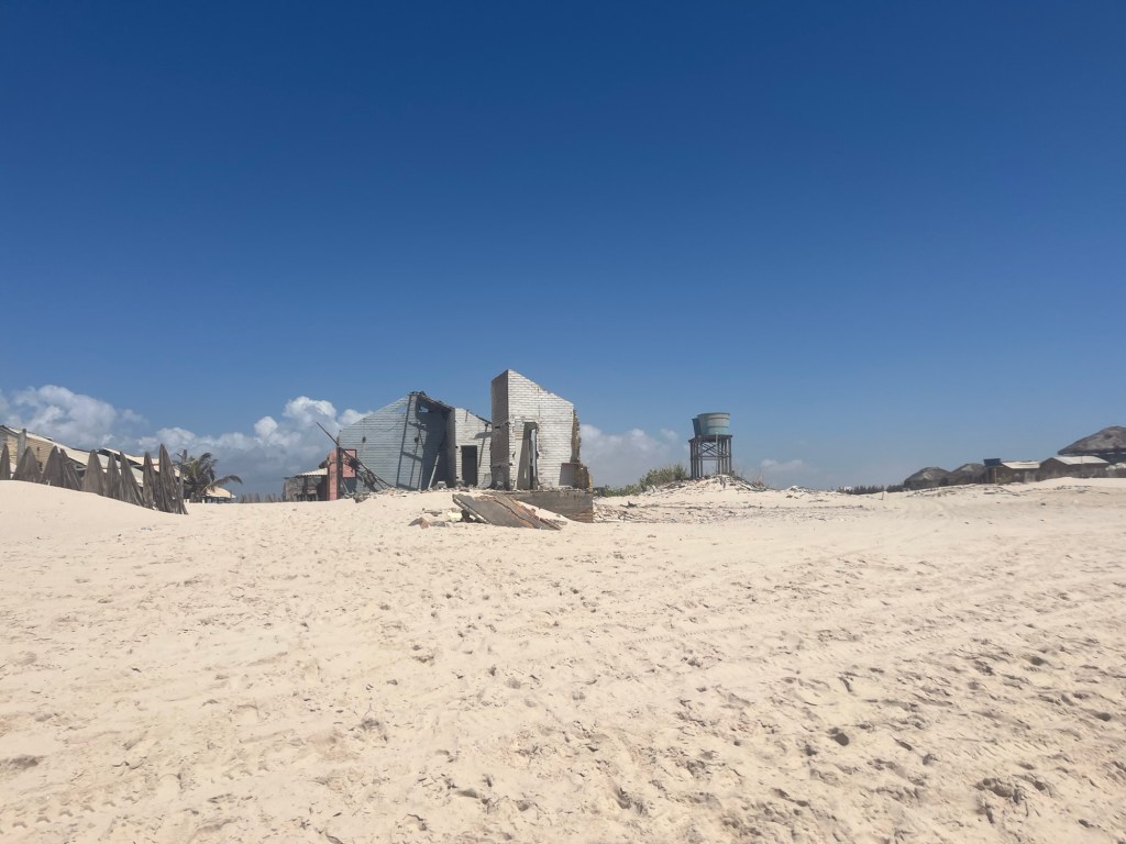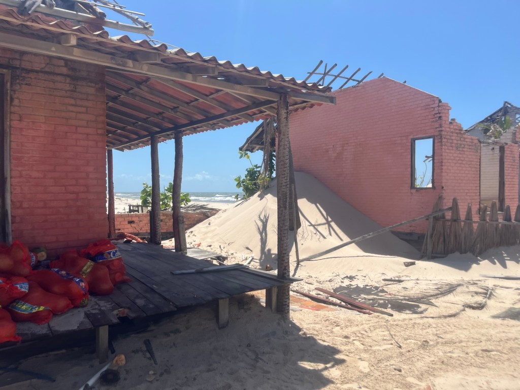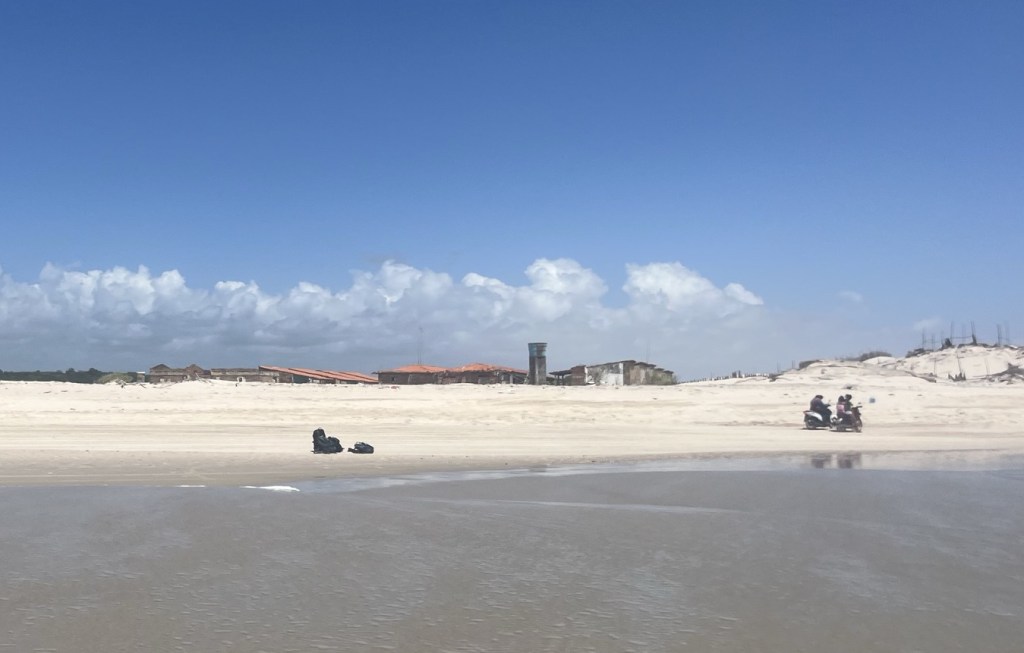 Prochain arrêt Caburé beach, longue bande terre de 20km entre rivière et mer, où un ouragan énervé a dû passer – il ne reste que quelques ruines de maison et un restaurant, idéalement situé en face de notre point d’attache, et justement recommandé par notre guide du jour. Ça se goupille decidemment plutôt bien tout ça! Devant tant de choix, on va docilement commander notre déjeuner puis direction la plage. Pas la plus belle qu’on ait vu, mais les ruines sur le sable chaud créent une ambiance post apocalyptique qui rappelle mad max. Justement, trois filles à scooter s’arrêtent à 20m de nos sacs à dos posés sur le sable, elles resteront tout le temps qu’on sera dans les vagues, je ne pense pas qu’elles bronzaient ou mataient car elles repartiront exactement au même moment que nous. Une étrange coïncidence, vous en conviendrez mon cher Watson …