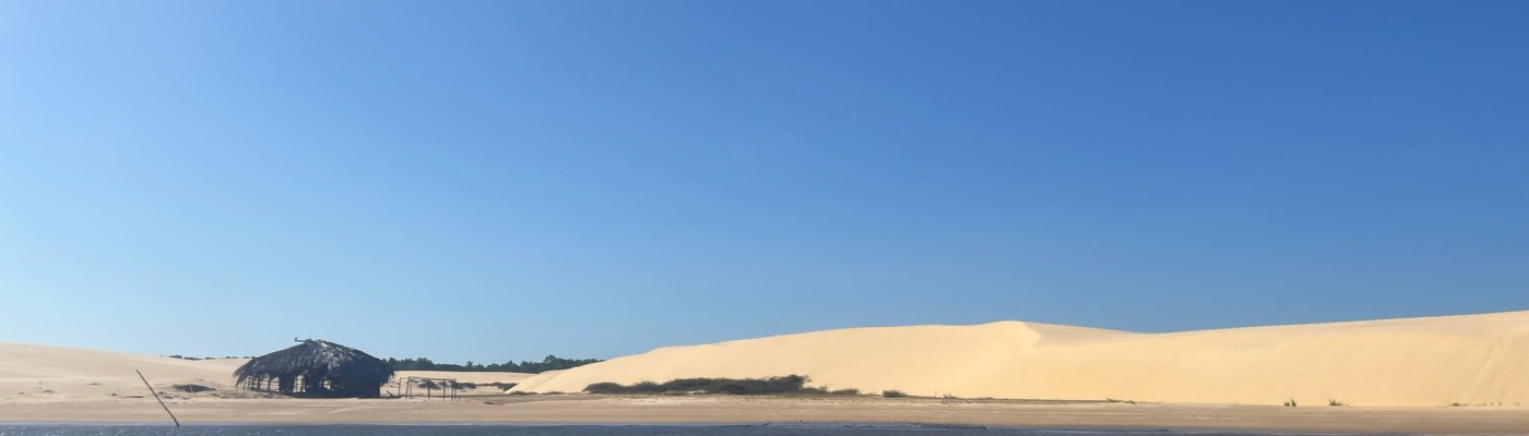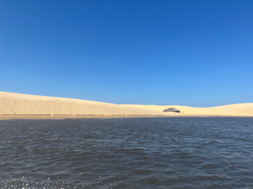 Le Rio est beau et paisible, easy like Sunday morning. On fait des arrêts pour découvrir la végétation, mais ce n’est pas James, les commentaires sont légers, et en portugais anyway, mais même sans rien comprendre la balade reste néanmoins très agréable. On fait une halte au pied d’une dune qui tombe littéralement dans la rivière, où des dizaines d’autres lanchas font escale à côté d’un café. On monte sur la dune pour découvrir à nouveau cet océan de sable blanc. Evidemment l’effet de surprise est moindre que la veille, mais c’est toujours aussi beau. La queue pour accéder au bar est digne d’un festival de métal, donc quand je reviens avec une noix de coco bien fraîche dans chaque main et le mot de passe du wifi entre les dents, je vois le regard de soulagement de la femme du chasseur-cueilleur devant un gibier après une semaine de jeûne.