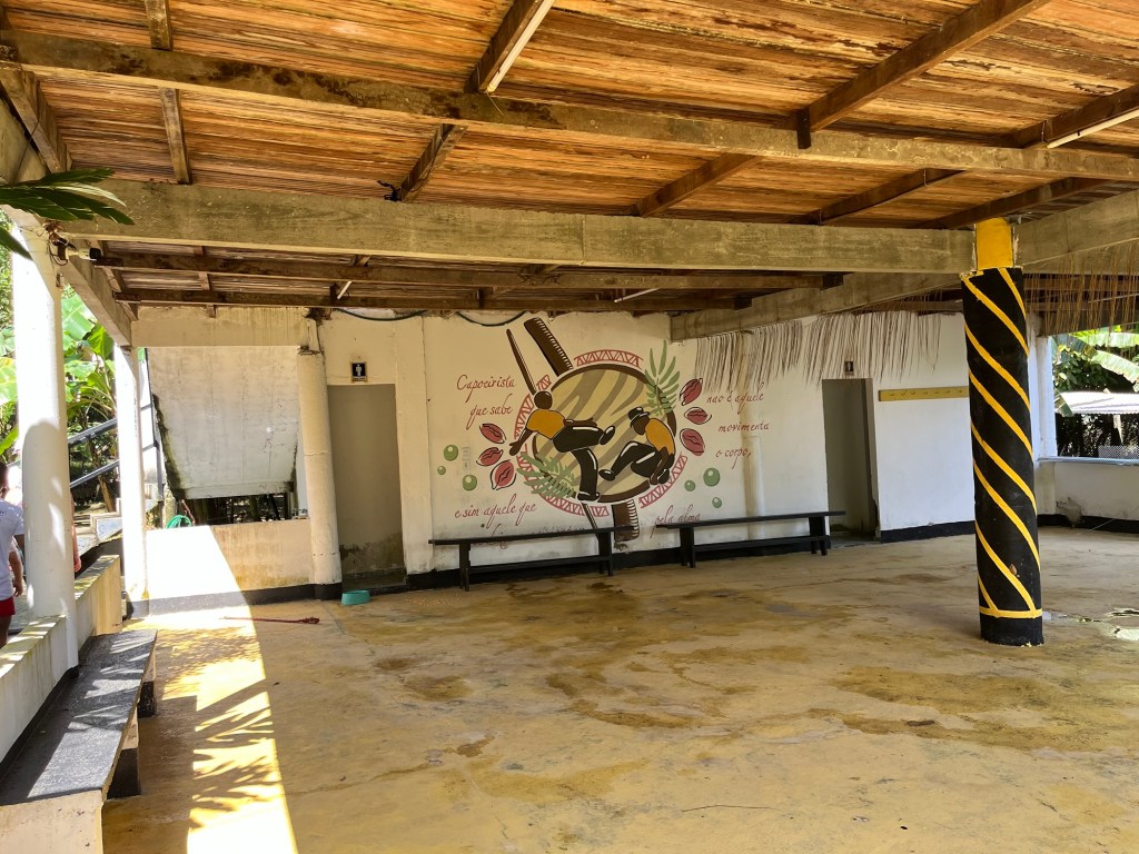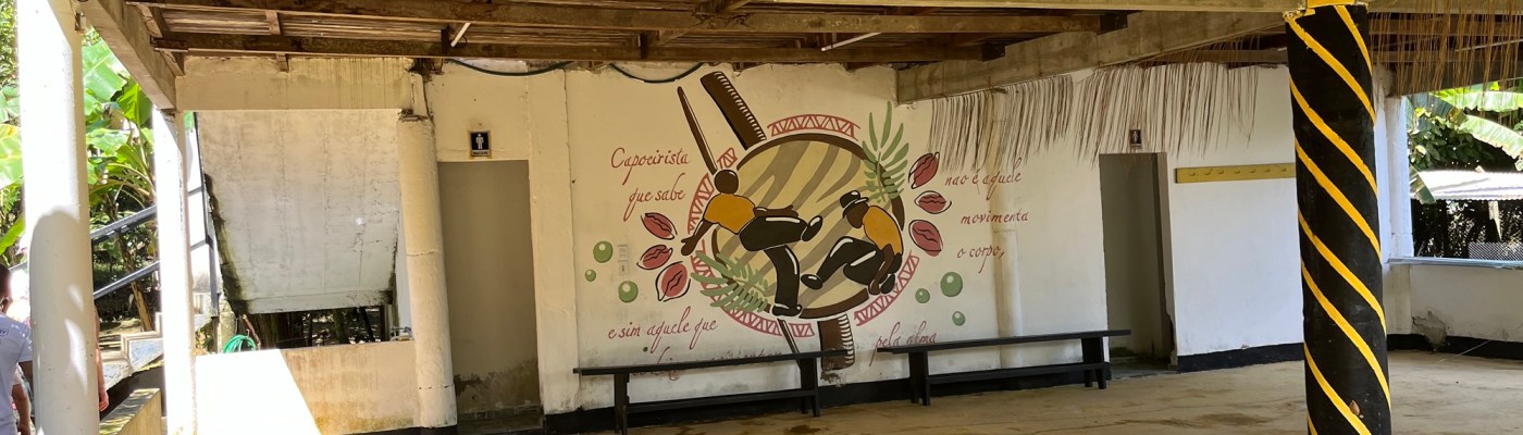 Je ne quitte pas des yeux l’heure d’arrivée prévue, qui ne cesse de se décaler à cause des bouchons. J’arrive le dernier à l’embarcadère, et je retrouve avec grand plaisir mon groupe de capoeira, tout le monde me pose plein de questions sur notre périple aux Amériques. Le bateau part à 8h en direction de Ilha da Mare où l’on doit passer la journée avec Mestre Moraes, sommité de la capoeira Angola. Il nous explique l’histoire de l’île qui est longtemps restée scindée entre portugais, africains, et indigènes, mais il affirme que cette séparation n’existe plus aujourd’hui. Les quartiers que l’on traverse une fois débarqué semblent montrer une réalité un peu différente. On est bien loin du Brésil touristique ici, en particulier en ce matin pluvieux. Les rares échoppes ne sont pas vraiment bien achalandées, les bars sont sans couleur, la marée basse a laissé les bateaux de pêche agonisant sur le sable flasque, les ânes patientent, les chiens errent. Les coquillages sont eux très beaux, et tous les habitants croisés nous saluent cordialement, mais je pense que T et les enfants n’auraient peut-être pas été sensibles à tant de délicatesse. On arrive au bar du bout de la plage et du bout du monde, où une fête avait encore lieu la veille, mais, pas conviés, on doit se contenter ce matin d’imaginer l’ambiance qui régnait. Le mestre va-t-il prendre la parole ici? Non, on repart en direction du village voir la maison où il est né. Pour les fans only. On marche assez longtemps dans l’île, les villages traversés sont en pleine nature et assez bruts, pour finalement arriver à son école. Ça y est, ça va démarrer se dit-on! Mais il nous présente les arbres fruitiers du jardin, puis la bibliothèque puis enfin les belles salles d’entraînement qui dominent la forêt et l’océan. On va jouer? Non, mais on s’asseoit, et le Mestre commence à diffuser sa sainte parole, à parler d’histoire, de dialectes africains, puis il sort d’un sac plastique des CD à vendre …ceux où il chante. Au final on ne jouera pas de musique ce matin comme initialement annoncé. On repart assez frustré, en direction du restaurant, on se demande si ce sera vraiment pour déjeuner ou pour faire la vaisselle. Le cadre est simple, le ventilo aussi assourdissant qu’inefficace, menu unique (en fait pas de menu du tout), mais le poisson est plutôt bon.