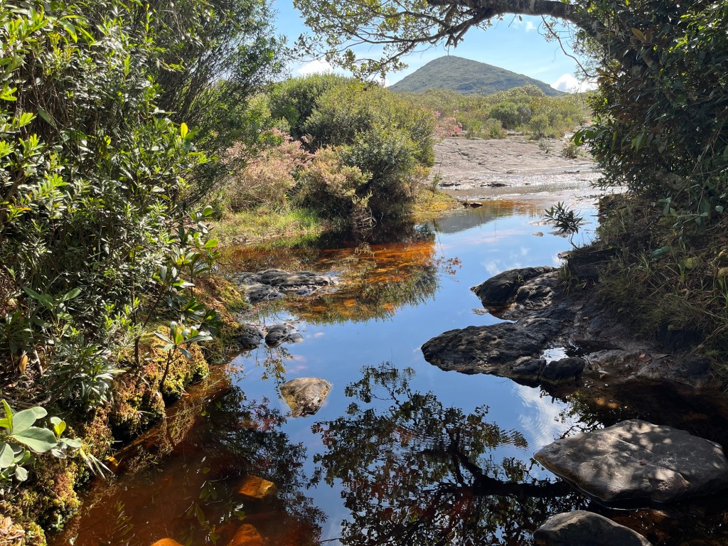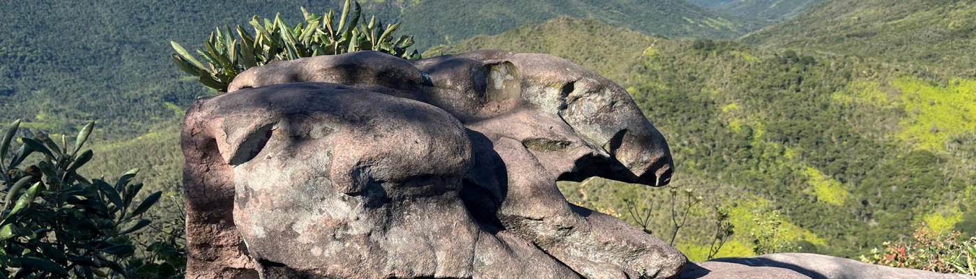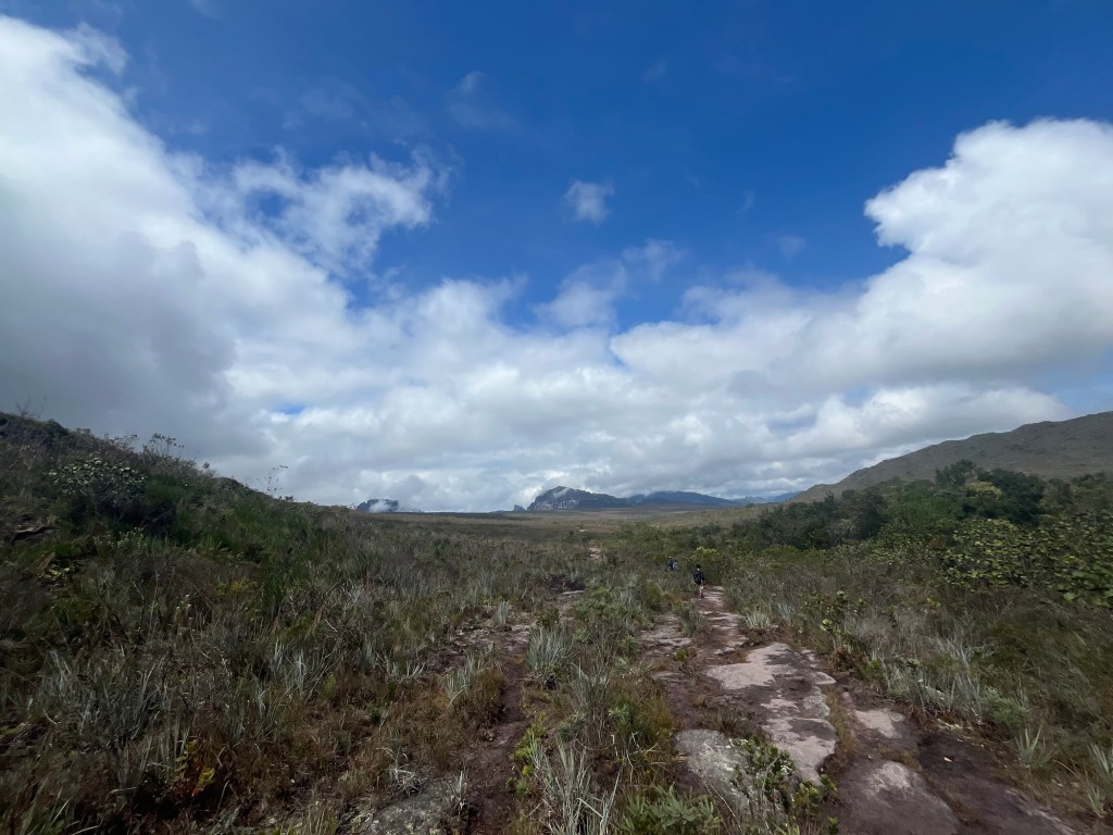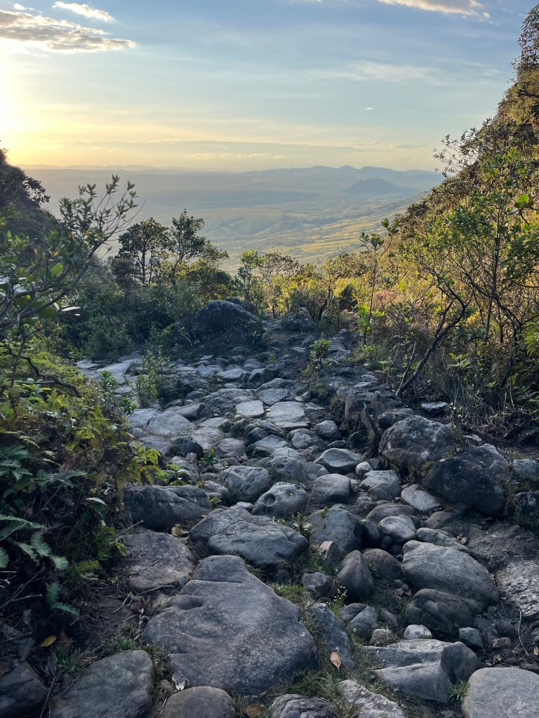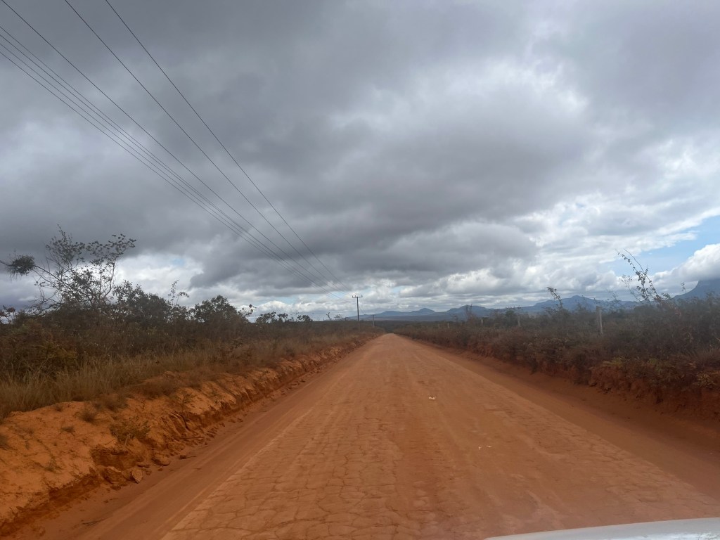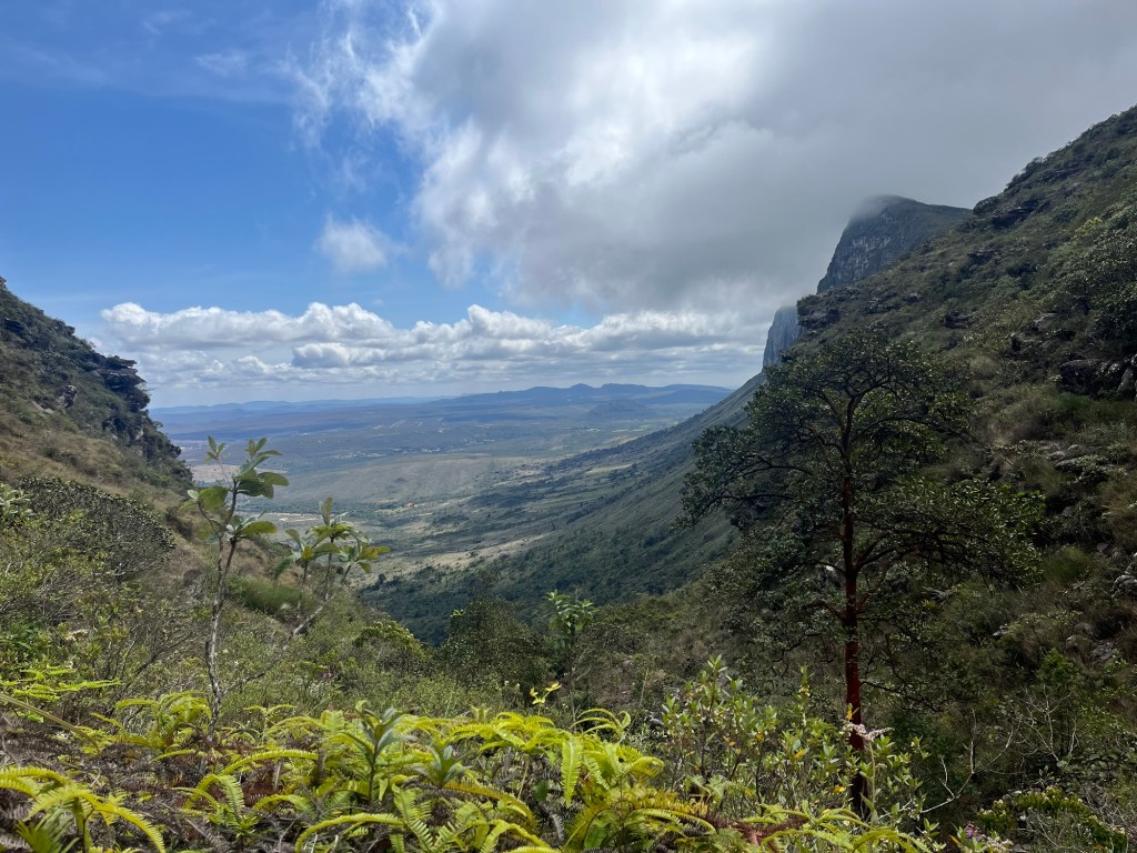 On arrive à la petite ville de Guine, qui semble encore moins animée que Mucugê. On profite des dernières barres de 2G sur le téléphone pour essayer de localiser le point de départ et d’arrivée de la balade car on est tombé dans un désert électromagnétique. Comme souvent, rien n’est indiqué donc on choisit les embranchements un peu au hasard jusqu’au pied d’une falaise. Là, un guide qui parle anglais et part de là, nous dit que c’est par là. On attaque la montée à nouveau sous la bruine, mais rassurés. Ça grimpe un peu sec, on occupe les enfants avec des questions en anglais ce matin, et on constate avec plaisir qu’ils arrivent à se débrouiller – un acquis du voyage. Alors qu’on approche du sommet et que le ciel s’ouvre à nouveau, on découvre un gigantesque plateau que traverse un chemin sablonneux. Pas une maison. Pas un poteau. Pas un avion. Encore une fois on a cette sensation d’immense nature préservée, qu’on n’a presque nulle part en Europe. Mais nous ne sommes pas encore au mirador, deux heures de traversée du plateau nous attendent, un peu monotone sous le soleil, juste ponctuée de quelques ruisseaux d’eau noire. Le dernier kilomètre remonte un peu, et laisse découvrir au tout dernier moment, lorsque le rideau tombe, un panorama à couper le souffle sur le Valo do Pati, cette vallée qui se parcourt en 3 jours. Les 3h pour le mirante, c’est la version light pour les blogs de voyage. On trouve un rocher à l’ombre pour dévorer un sandwich et un œuf face à ce décor irréel. Un couple de retraités anglais vient nous parler. Elle parle le français de la BBC, tandis que le mari photographie la vallée avec la frénésie d’un paparazzi, comme si celle-là pouvait disparaître d’une seconde à l’autre. Puis il sort le drone comme un enfant déballe ses cadeaux le jour de son anniversaire de 8 ans. Attachant ou ridicule?