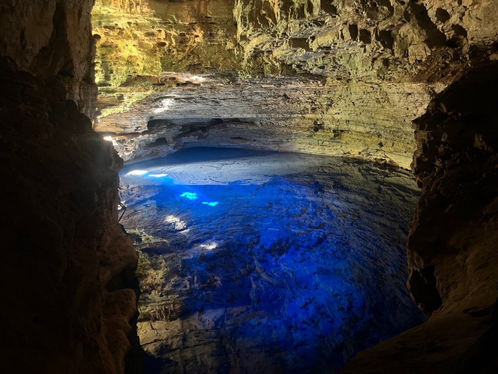 On a une petite heure de route goudronnée, suffisamment rare par ici pour le mentionner, avant d’atteindre la Poço encantado. Cette grotte a été découverte par hasard par un Belge qui avait décidé de s’établir avec sa famille ici, au milieu de ce nulle part beau, dans les années 30, pour des motifs que j’ignore, même si j’ai ma triste petite idée… on doit s’équiper d’un casque de spéléologie qui nous donne des têtes de champignons, descendre une centaine de marches, puis marcher à la queue, pliés en deux, parfois à plat ventre, pour accéder à cette gigantesque cavité. Mais le clou, que dis-je, le stalagmite du spectacle, est le bassin, d’une eau cristalline d’un bleu intense, d’une dizaine de mètres de profondeur. Le lieu est extraordinaire. Par un jeu complexe de réflexions et de réfractions, les alternances de lumière qui pénètrent dans la grotte nous permettent d’admirer un spectacle vivant et trompeur, où se mélangent le reflet du plafond de la grotte, et le fond du bassin. Phénomène magique et inoubliable.