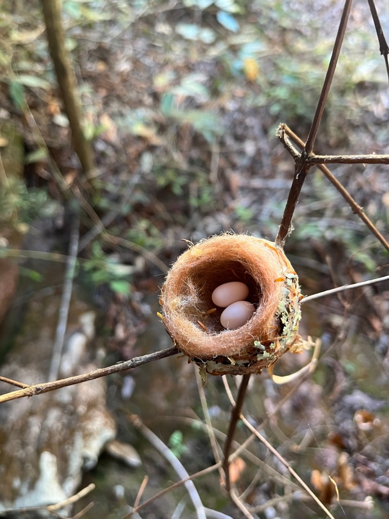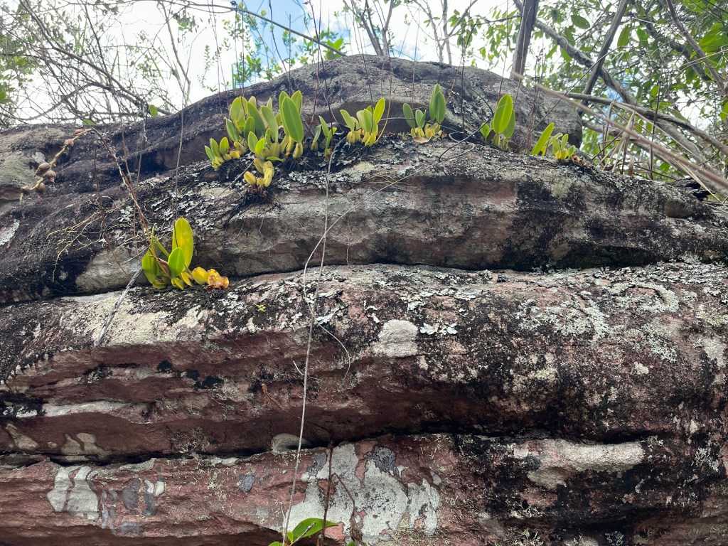 On démarre tranquillement, tout en faisant un peu connaissance, mais assez vite il y a de hauts rochers à grimper et descendre – essoufflé, parler ou marcher il faut décider. Ça devient même assez acrobatique, on doit sauter, escalader, glisser .. les enfants adorent, nous transpirons généreusement, pour arriver au lit d’une de ces rivières aux très larges pierres plates, caractéristiques du coin. On descend jusqu’à un petit bassin frais qui nous accueille à bras ouverts. J’ai tout juste de l’eau aux mollets quand A a déjà la tête sous l’eau. On fait trois brasses, pendant que Cachoeira prépare le café dans sa Bialetti rouge funky remplie avec l’eau de la rivière noire. « T’inquiète quand ça bout, ça tue tout ». La phrase qui résonnera en boucle quand on sera sur le trône au milieu de la nuit avec des douleurs intestinales insupportables …. avons testé le café muito forte de la région les pieds dans la rivière. Sommes repartis tout sourire, mais pas encore au niveau d’enthousiasme de notre chauffeur du matin. Nous sommes tombés – heureusement au figuré – sur un nid de colibris, et ses œufs minis. Un centimètre de diamètre, moins impressionnant qu’un léopard, et pas même de quoi faire une omelette pour le groupe. On peut également admirer des orchidées dans leur état naturel, sans fleur car c’est encore l’hiver ici, mais tellement élégantes, limite méprisantes. confortablement installées dans le creux de leur rocher ou sur un tronc. Malgré tous les conseils et les engrais chimiques du fleuriste, les orchidées parisiennes qui semblent en plastique n’auront jamais la classe de celles d’ici. Absurde de vouloir même essayer, se dit-on … La remontée est assez difficile, tandis que les enfants déploient des talents simiesques insoupçonnés.
