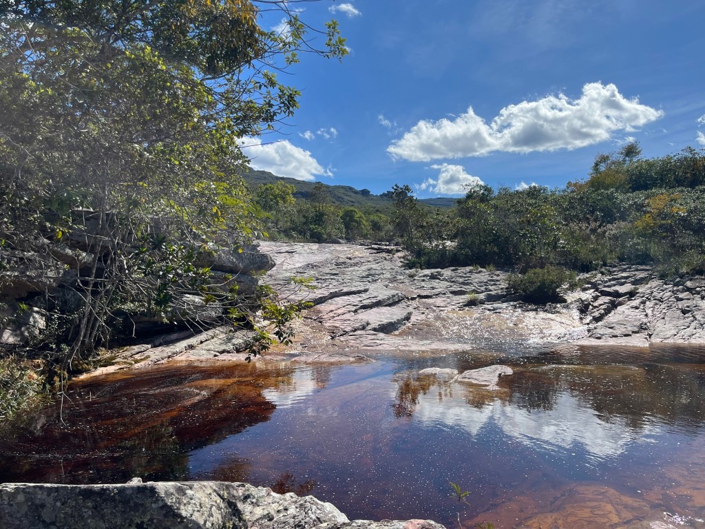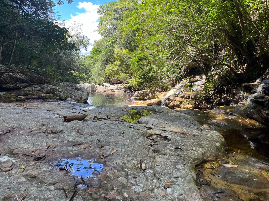 On quitte progressivement l’ombre de la forêt, il fait de plus en plus chaud, je pense directo à Rambo. On s’installe sur le bord d’une belle rivière, et on se régale avec les bons sandwiches concoctés par Léo, au pain du coin, ou au tapioca de là-bas. Dans une saine rivalité, il nous fait goutter à son tour le café qu’il a choisi ce matin, en nous montrant fièrement les nombreux prix qu’il a reçu. Bon, manque un peu de rondeur, et ça nous file toujours pas la pêche de la conductrice du matin. On goutte également aux jus de fruits que les guides nous ont gentiment ramené, dans un chouette moment de partage, dans une bouteille en plastique qui a dû servir à pas mal de trucs. Puis j’aide J à chercher des diamants dans la rivière – un bon exercice de résilience, vu le nombre de belles pierres scintillantes qu’on a trouvé, mais qu’on a finalement jeté comme de vulgaires cailloux. Cachoeira nous aide un peu, mais voyant que J ne décollerait pas d’ici sans son diamant, dans sa gentillesse extrême, il lui fait don d’un minuscule diamant tiré de son butin personnel. J était aux anges, on pouvait repartir.