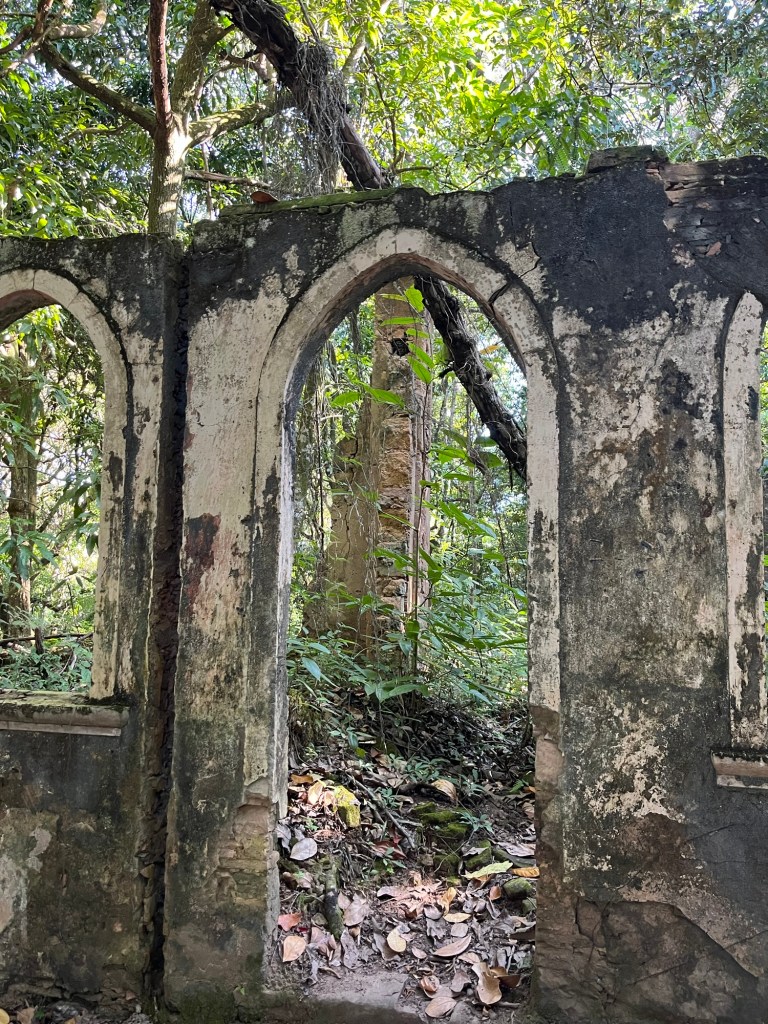 La chaleur devient assommante, il n’y a pas deux pierres successives qui se présentent au pied dans la même direction, et surtout jamais à l’horizontale, comme les miettes d’un mille-feuilles géant laissé dans l’assiette par un enfant capricieux qui n’aime pas ça finalement. Sans la crème. On ne peut donc pas quitter le chemin des yeux, concentration permanente, les chevilles prennent cher. On passe devant les ruines d’un château (quelle idée ici) et d’une pousada-hapyy-hippie-yoga, où l’on peut remplir nos gourdes d’eau noire, même plus peur. On parlera capoeira avec Cachoeira – ça m’ira tant que ce n’est pas rima. Cach’ nous montre plein d’espèces de plantes au parfum délicieux et aux propriétés surprenantes. Sa préférée à lui étant celle qui fait planer. Il s’en est mis un demi bouquet dans le nez, le gentil rasta n’arrêtait plus de se marrer (peut-être que la potion magique du matin ne contenait pas que du café en fait), tandis que Léo essayait vainement d’accélérer la cadence du groupe pour rentrer avant la nuit…. D’autant qu’on approche d’un long passage dans l’obscurité: la traversée de la grotte!