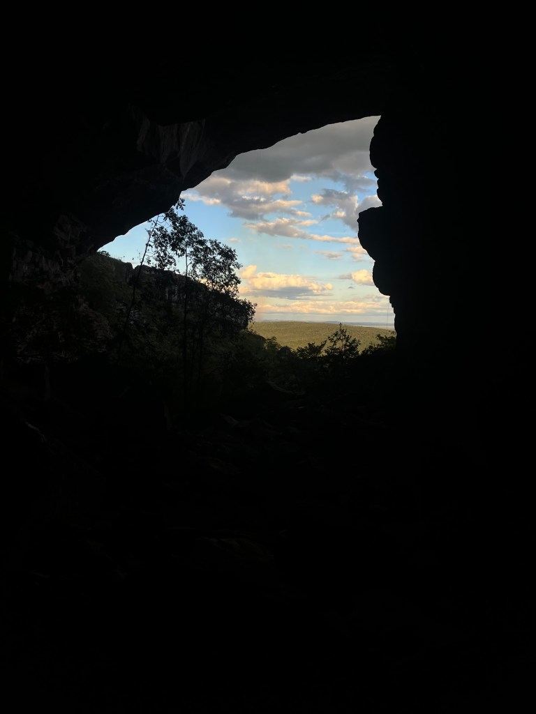 Après quelques consignes de sécurité et une préparation psychologique rapide mais nécessaire, nous pénétrons en file indienne dans la grotte. À part qu’elle est toute noire et qu’on a dû y rester environ 1 heure, il n’y aurait pas de quoi écrire un roman dessus, ni se lancer dans une peinture rupestre. Ni même une photo. Sans surprise, les pierres sont tout aussi irrégulièrement disposées qu’en surface, mais dans le noir certaines perceptions s’amplifient, et le faisceau lumineux de la frontale n’éclairant que nos pieds. Sans paysage à admirer, la marche en mode commando nocturne en deviendrait cauchemardesque. Quant à perdre totalement un sens, ne serait-ce qu’un instant, c’est assez déstabilisant: on s’est tous assis en cercle, avons éteint nos lampes et nos mots pendant deux minutes. Moment suspendu qui nous parut durer des heures, où l’on prend conscience que le cerveau ne s’arrête jamais, les pensées défilent sans cesse. Et on a pensé à nos otages. Alors qu’on repart et qu’on commence à percevoir la lumière naturelle, le sentiment de liberté et de vie est émouvant. Aux larmes pour certains. On débouche sur le haut d’une falaise avec une vue au moins aussi belle que le panorama depuis le Morro di Pai Inacio, encore plus sauvage. Et sans les débiles qui se prennent en photo assis avec les pieds dans le vide. La fin sera un peu longue, d’autant que la nuit tombe assez vite, les derniers kilomètres dans l’obscurité totale seront difficiles.